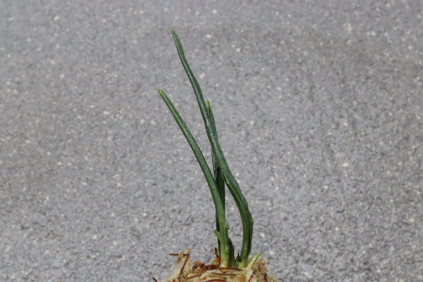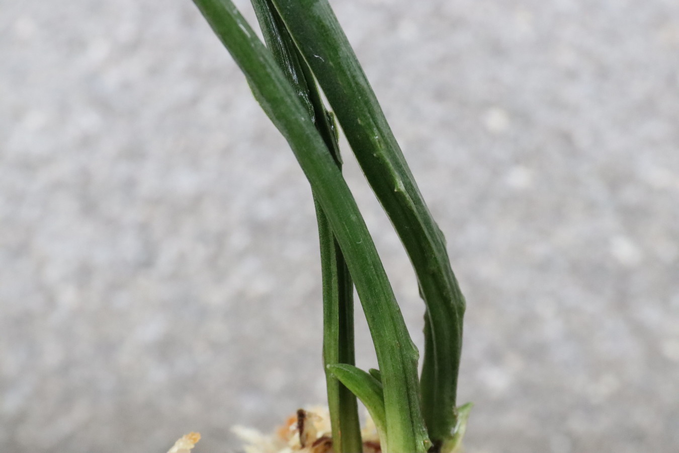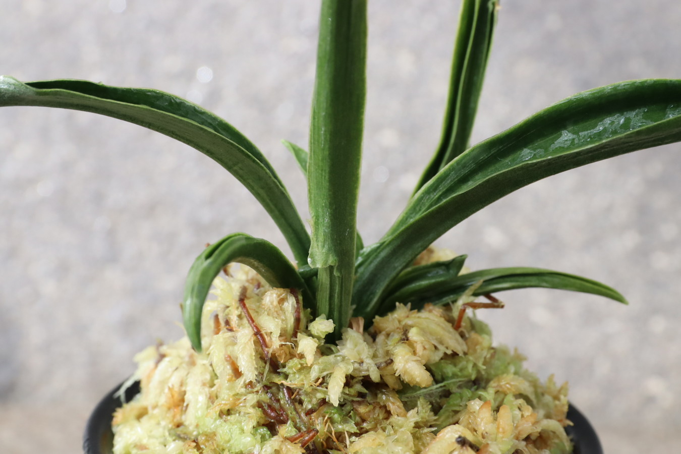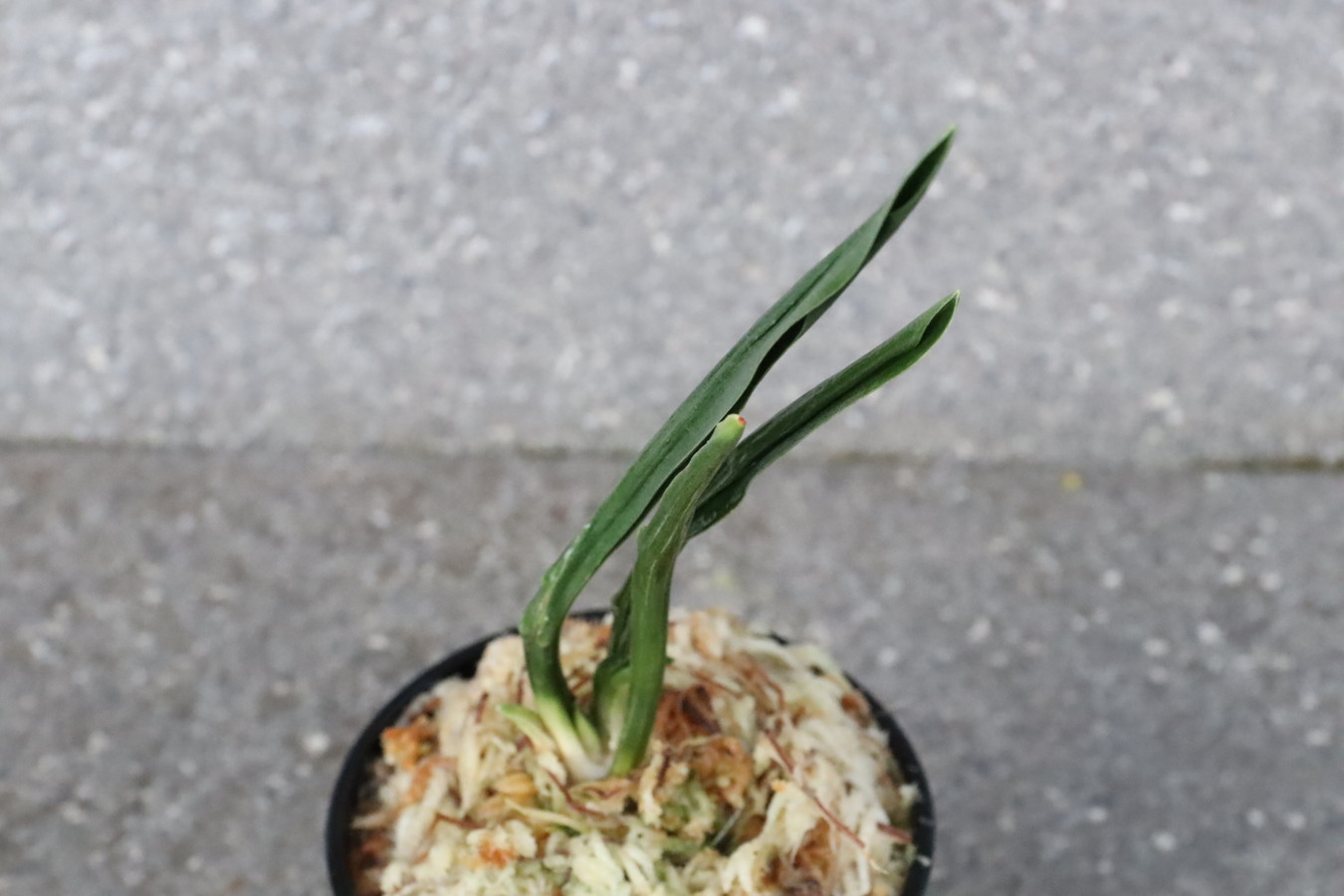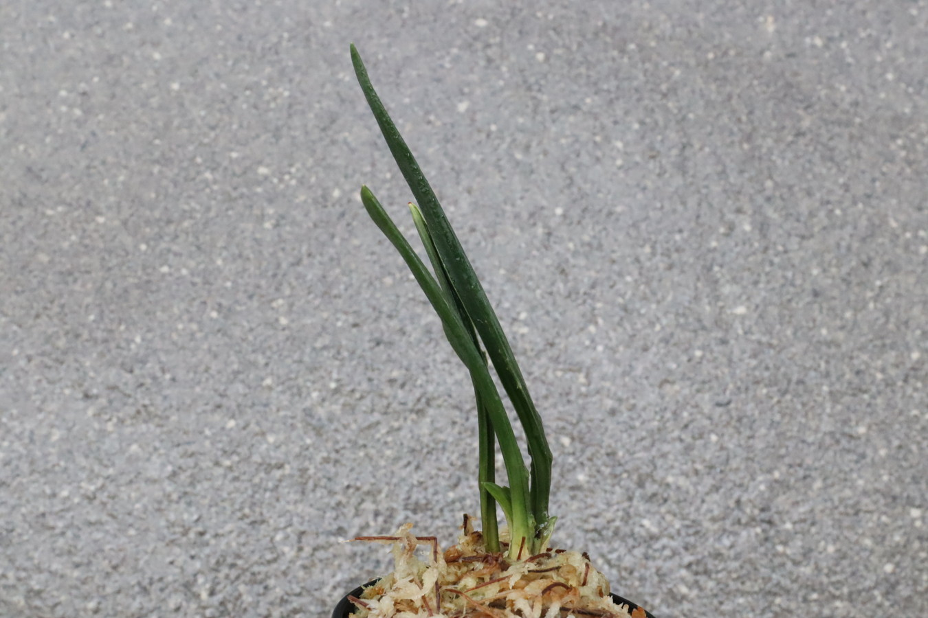濃緑色で立ち葉性、独特の葉姿を見せる。