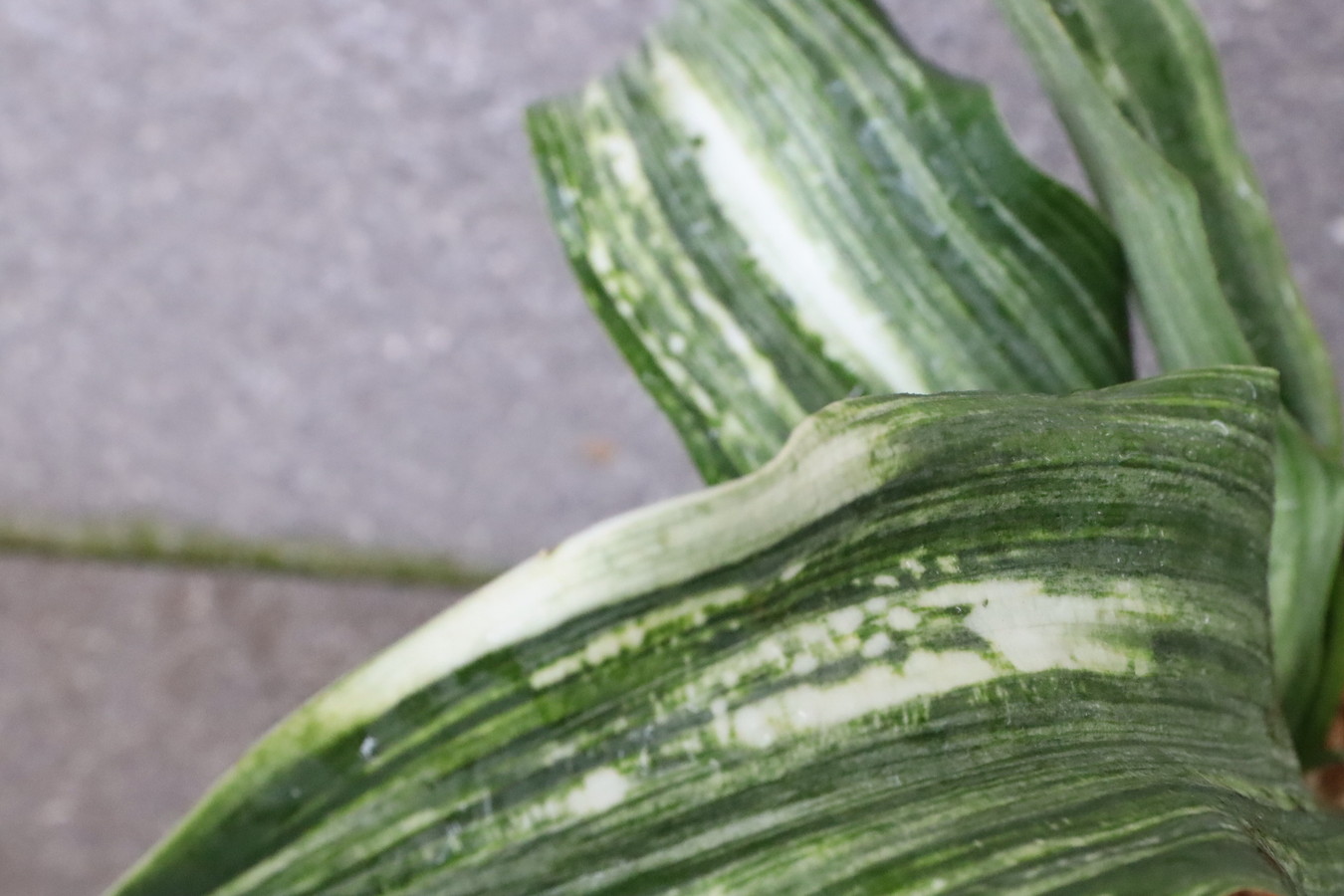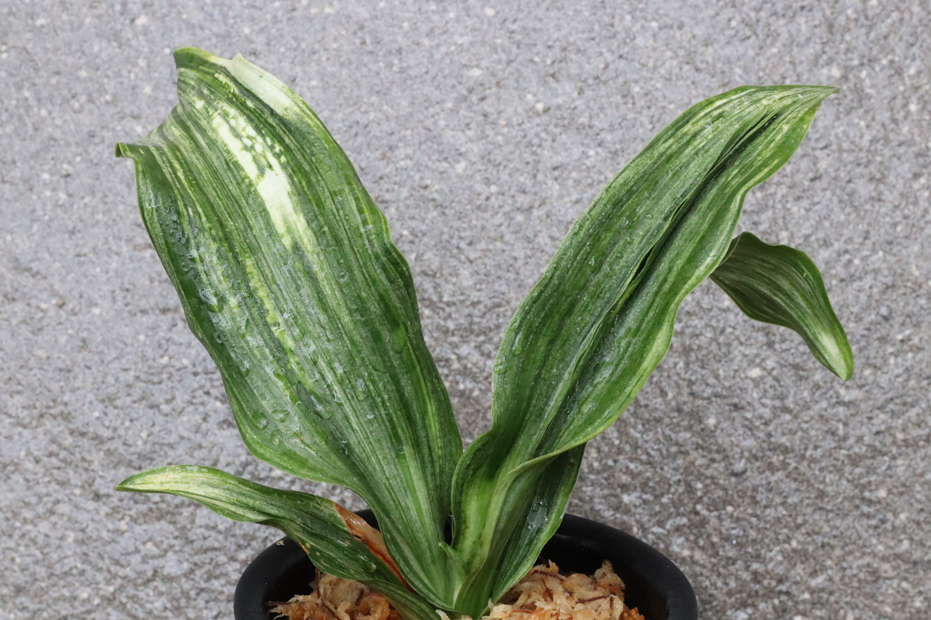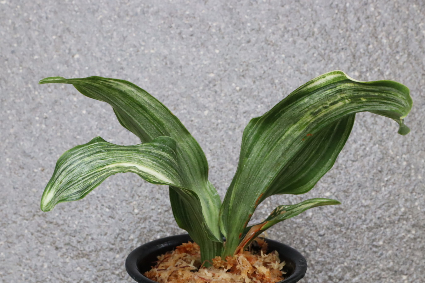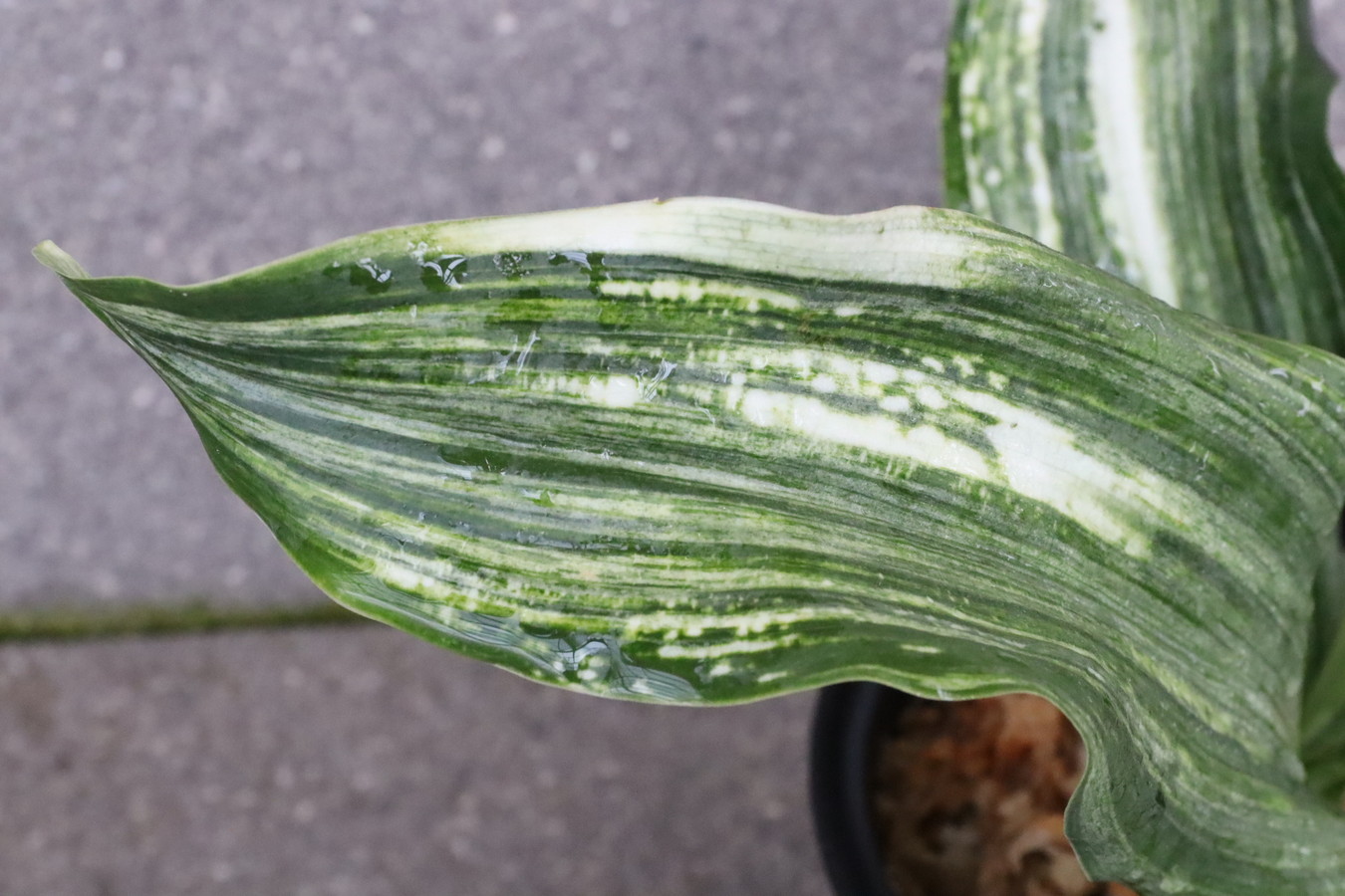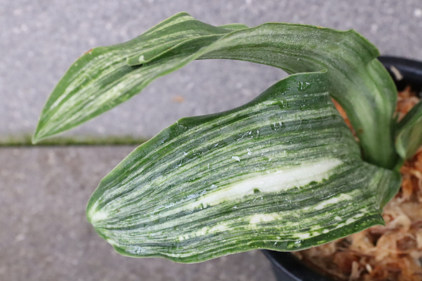 ふっくらした白斑葉は虎班を見せ肉厚で紺覆輪を現わす。