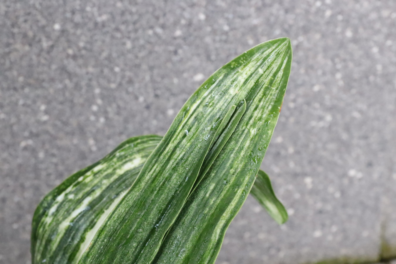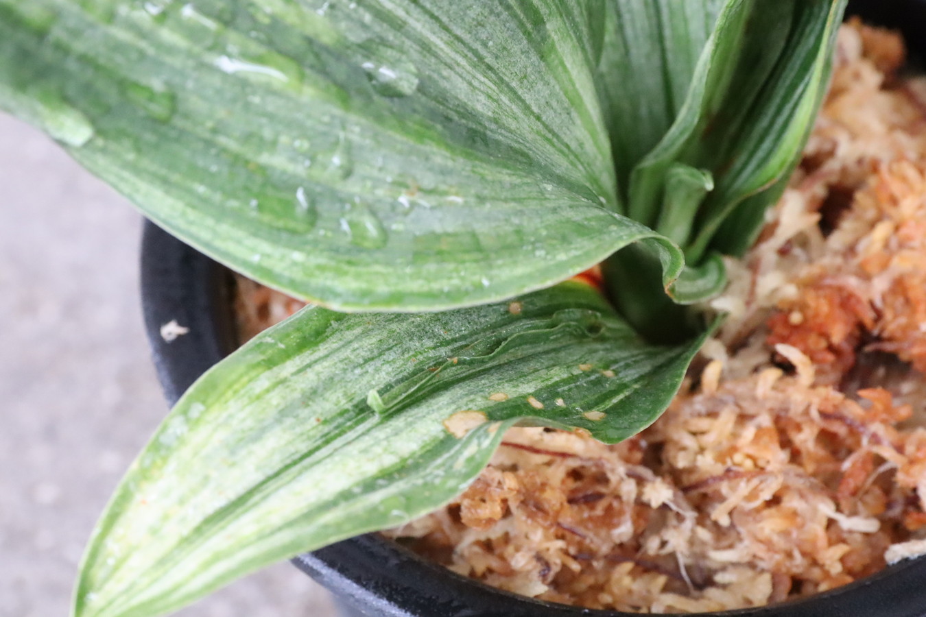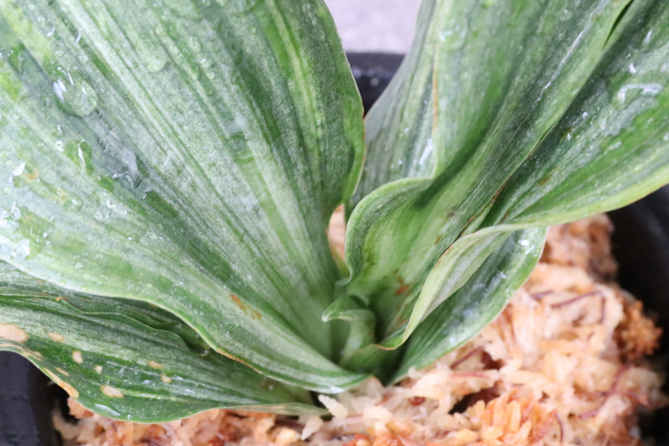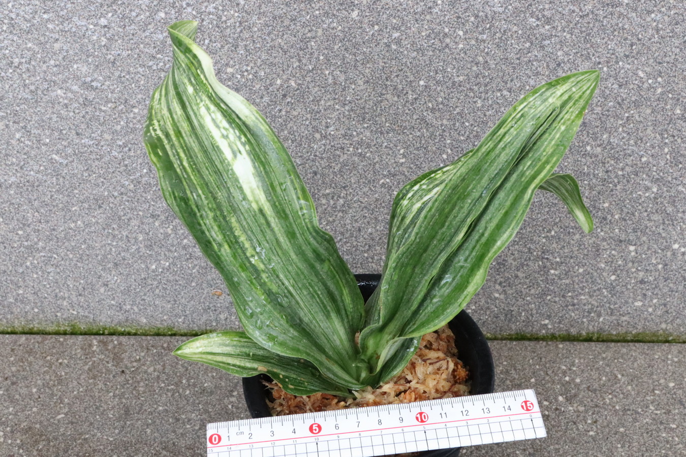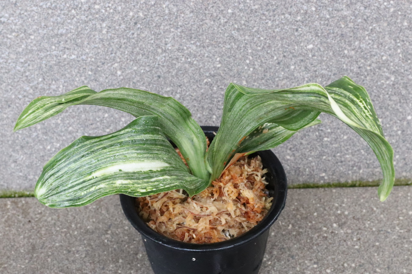 ふっくらした白斑葉は虎班を見せ肉厚で紺覆輪を現わす。
