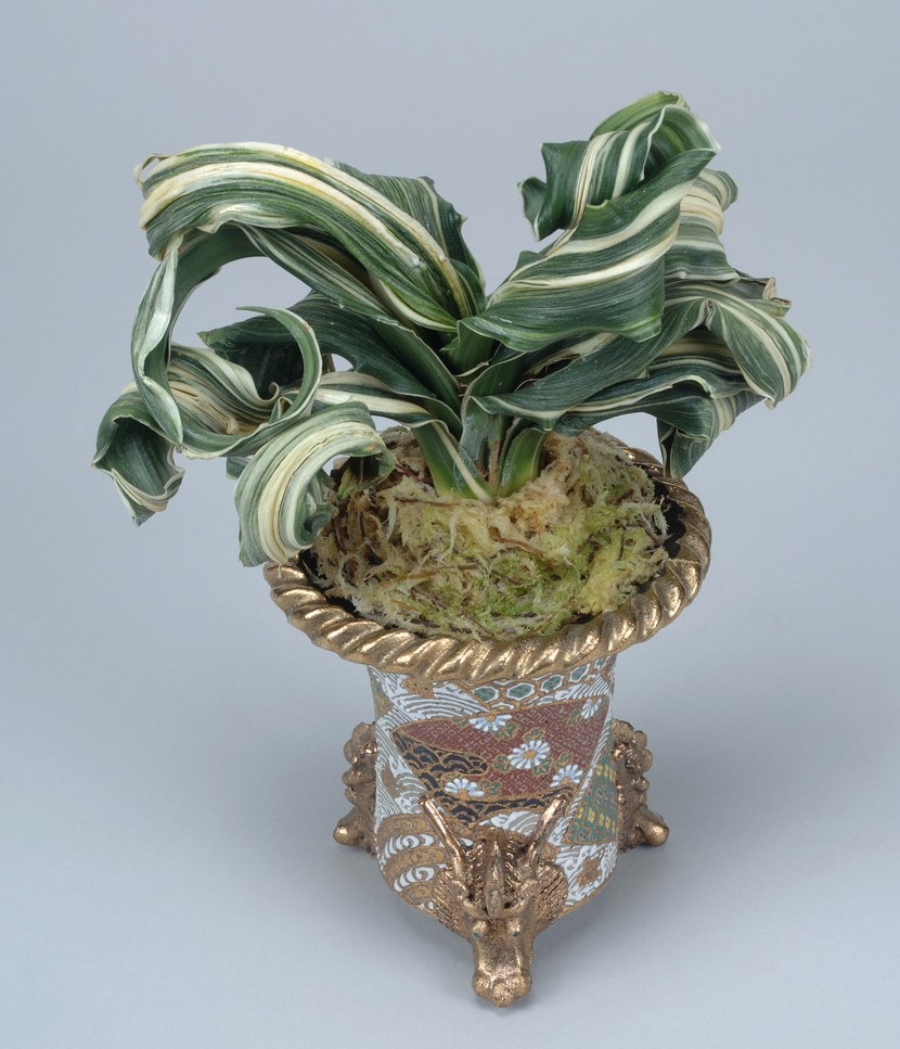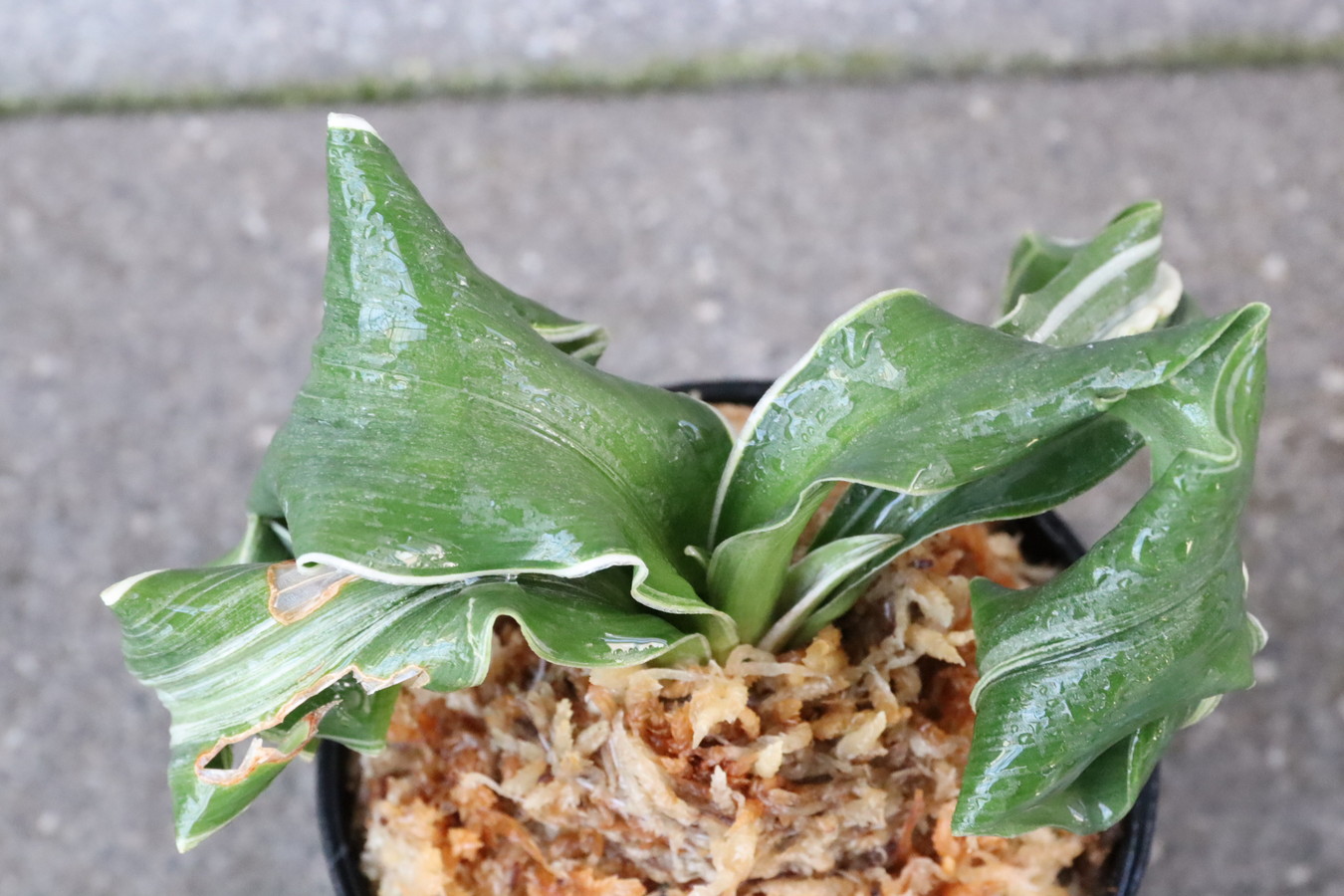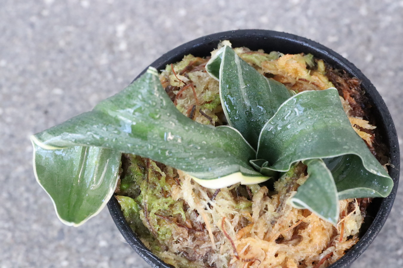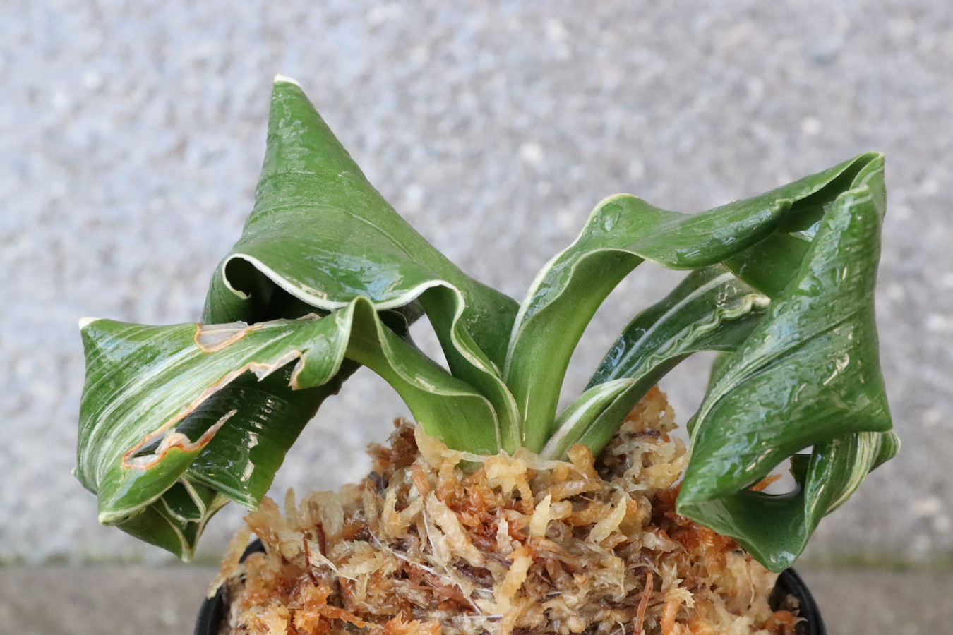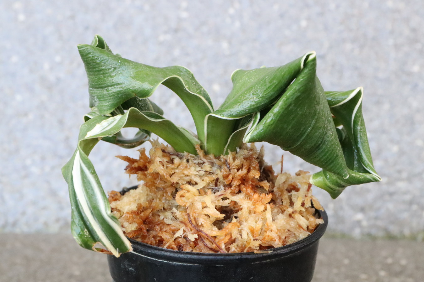 厚い葉肉に白い雅糸竜・玉竜を現す。力強い角巻きの葉は竜が暴れているような迫力を感じさせる角巻獅子の代表種。古くからあるので、青、縞、覆輪、縞覆輪と柄に様々あるが、数の少なさから縞覆輪が最高の人気を呼んでいる。縞覆輪では性質は普通、肥料は控えめのほうがよい。子上げも良いが、芋吹きが主。