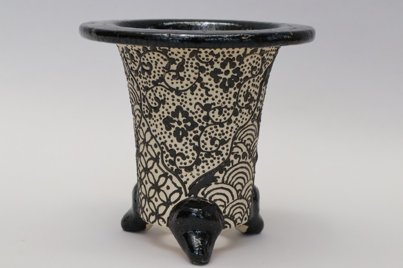 セッコク用の形です、おもとを植えても面白い。セッコク用に鉢底の穴を広く作った鉢で特別な製法につき鉢底の土目の色が本体と異なることがあります。楽焼は天正年間(約400年前)に始まる日本独特の焼き物です。楽焼は《急熱急冷》という特殊な焼成方法をとります。急熱急冷だから、鉢に細かな 微細な穴ができ、通気を良くしています。おもとの鉢について 縁足金