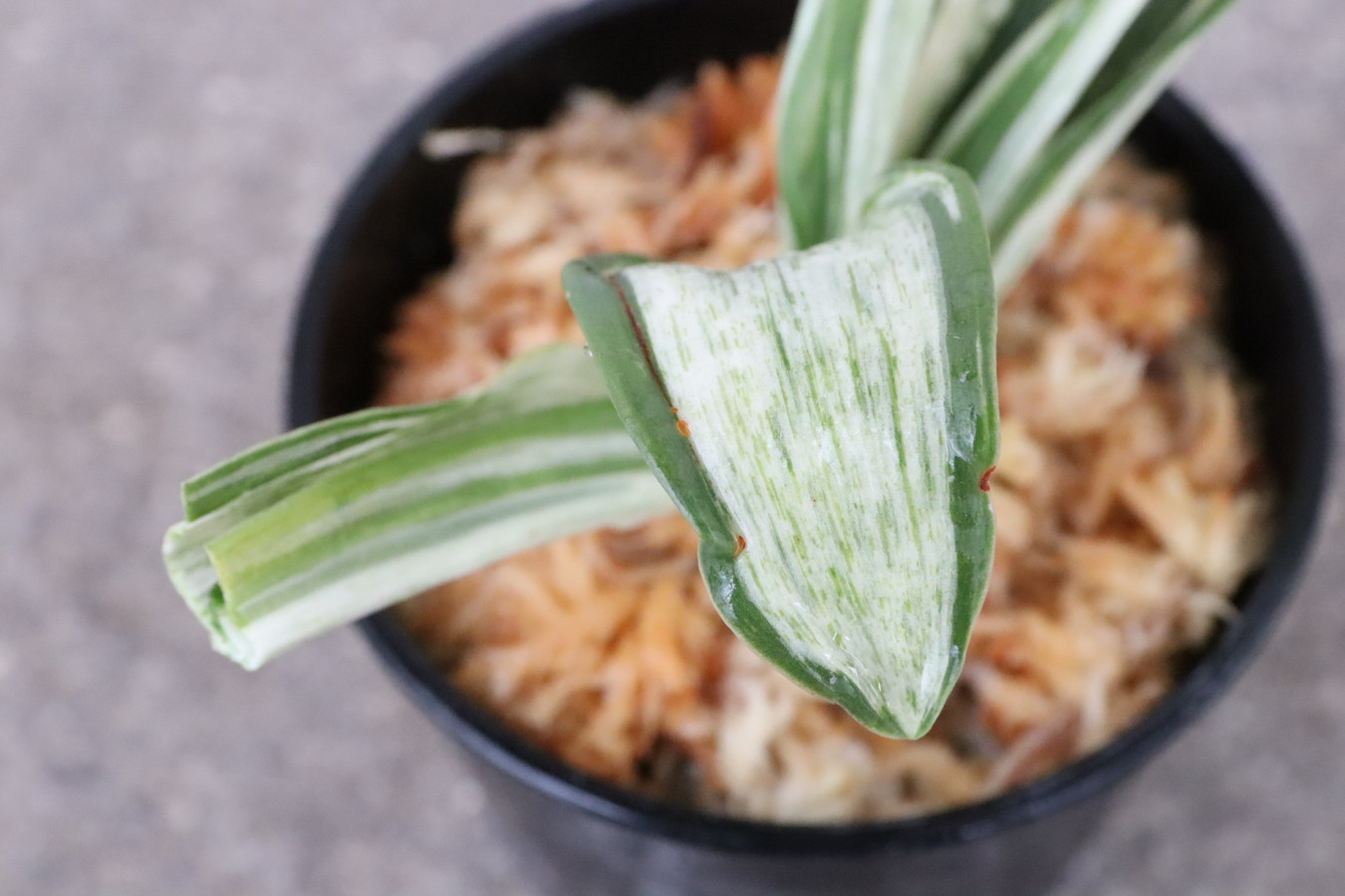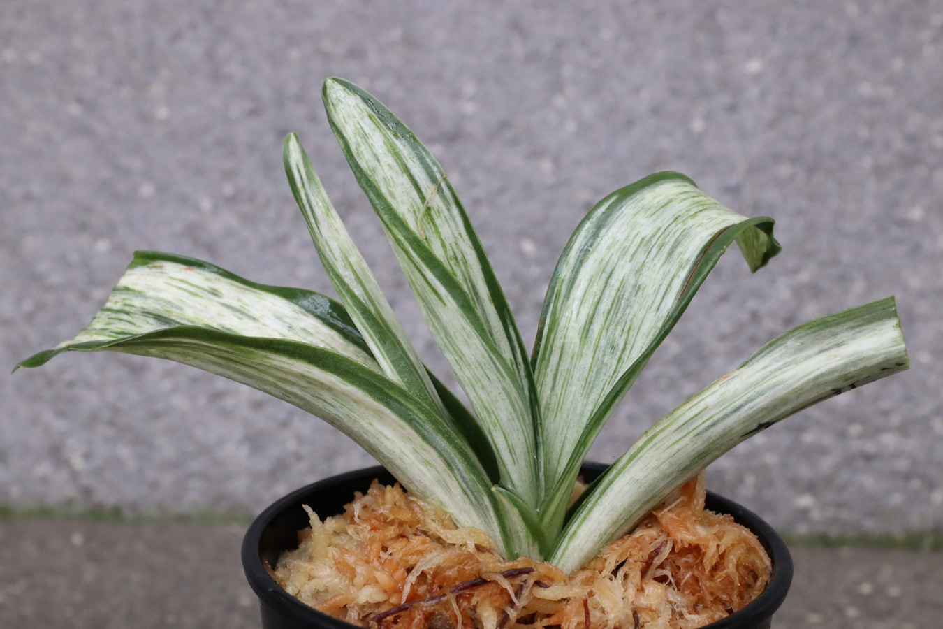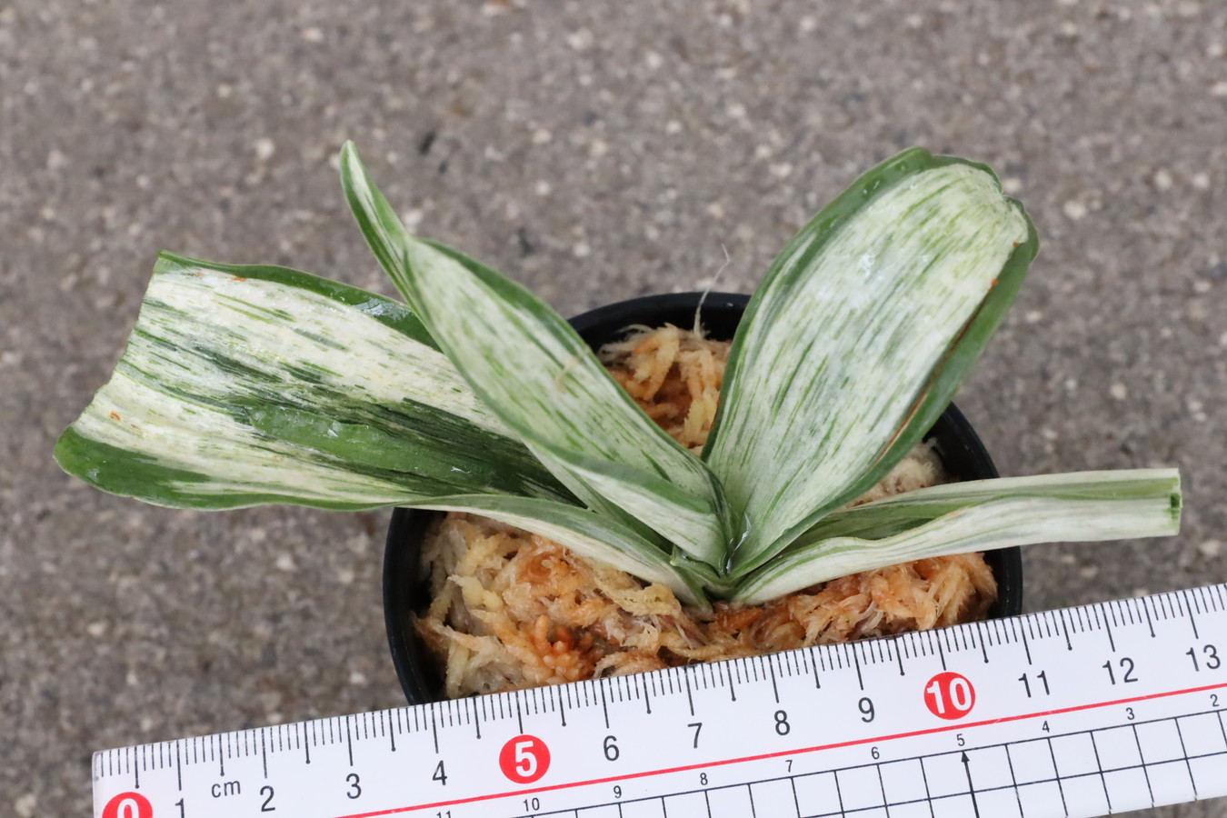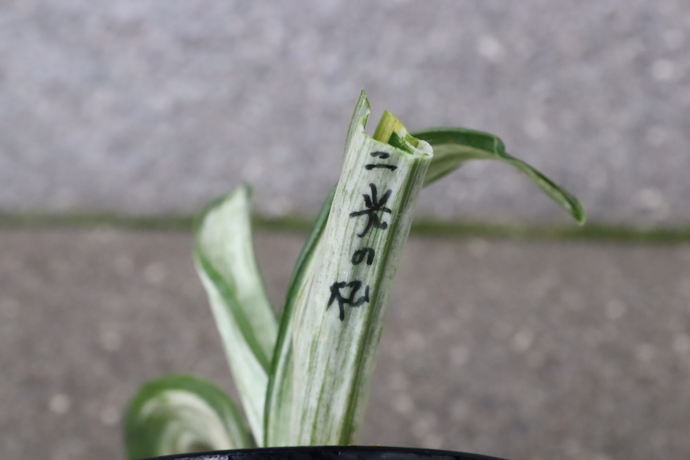 葉長15㎝、葉幅3㎝内外。葉繰り良く、中立ち葉で乱れのない葉姿は全体的にスマートで上品な感じを受ける。本種の千代田斑はこの系統の中でも最も白く、光沢のある濃紺緑色の覆輪は雪白な千代田斑を鮮やかに引き立たせる甲竜と低い雅糸竜、まれに玉竜も現す。斑が白いわりに育てやすい品種で、少々日強に作ったほうが力強さが出てきて中立ち葉のまとまりの良い葉姿になります。子上げ・芋吹きともに良く人気の高い品種。