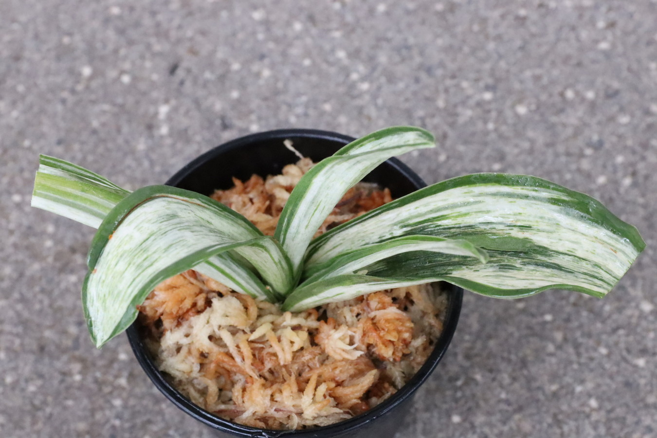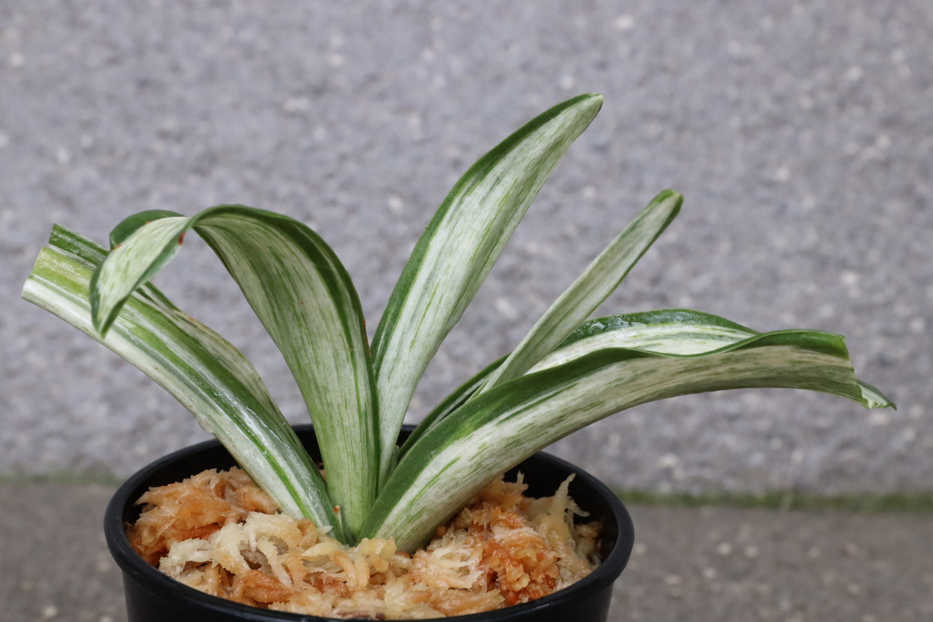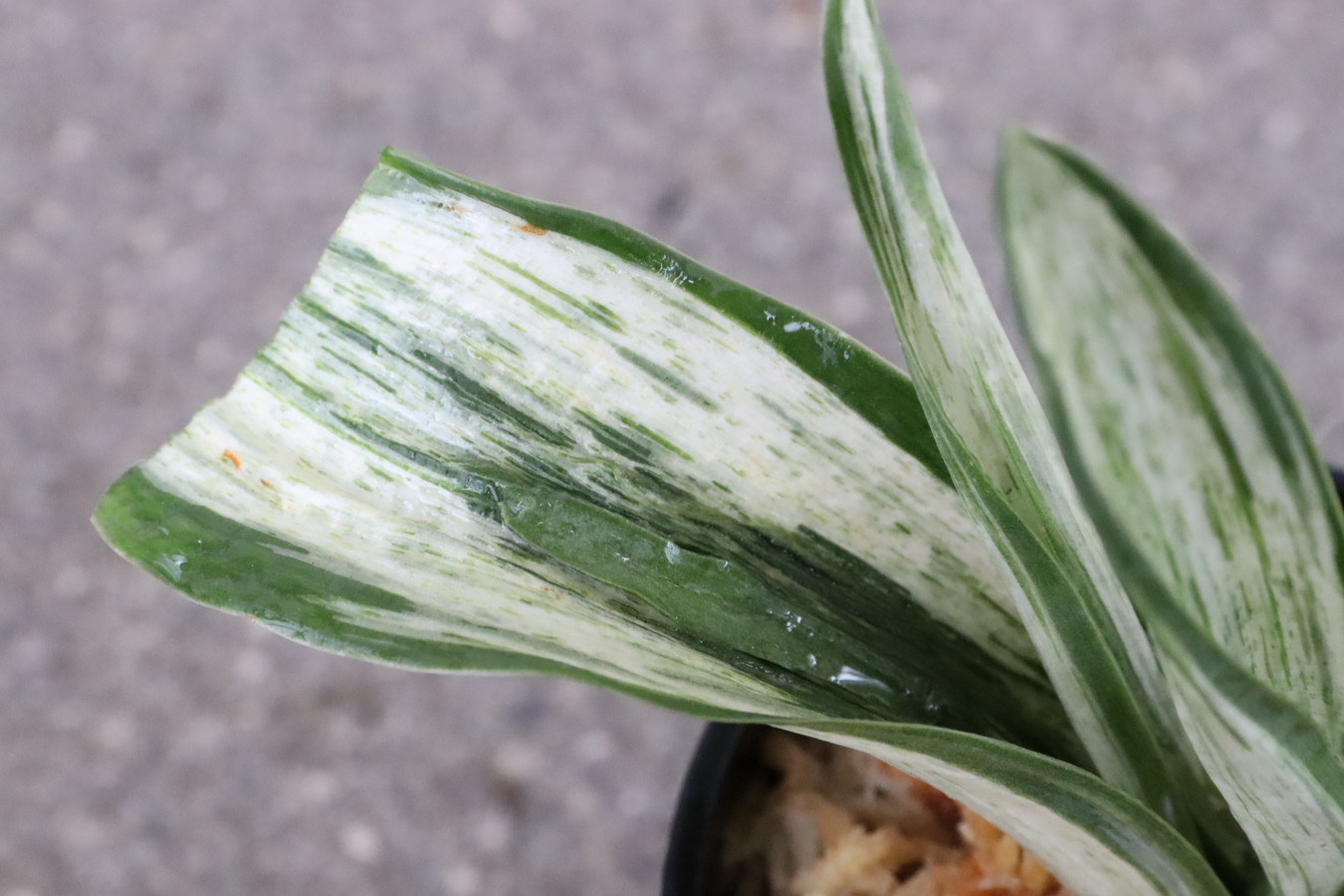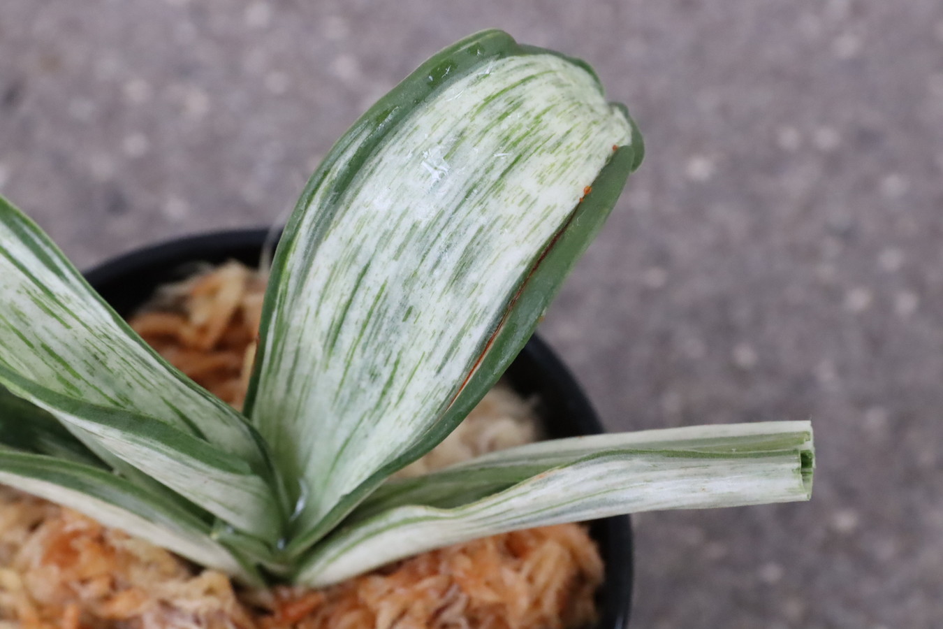 葉長15㎝、葉幅3㎝内外。葉繰り良く、中立ち葉で乱れのない葉姿は全体的にスマートで上品な感じを受ける。本種の千代田斑はこの系統の中でも最も白く、光沢のある濃紺緑色の覆輪は雪白な千代田斑を鮮やかに引き立たせる甲竜と低い雅糸竜、まれに玉竜も現す。斑が白いわりに育てやすい品種で、少々日強に作ったほうが力強さが出てきて中立ち葉のまとまりの良い葉姿になります。子上げ・芋吹きともに良く人気の高い品種。