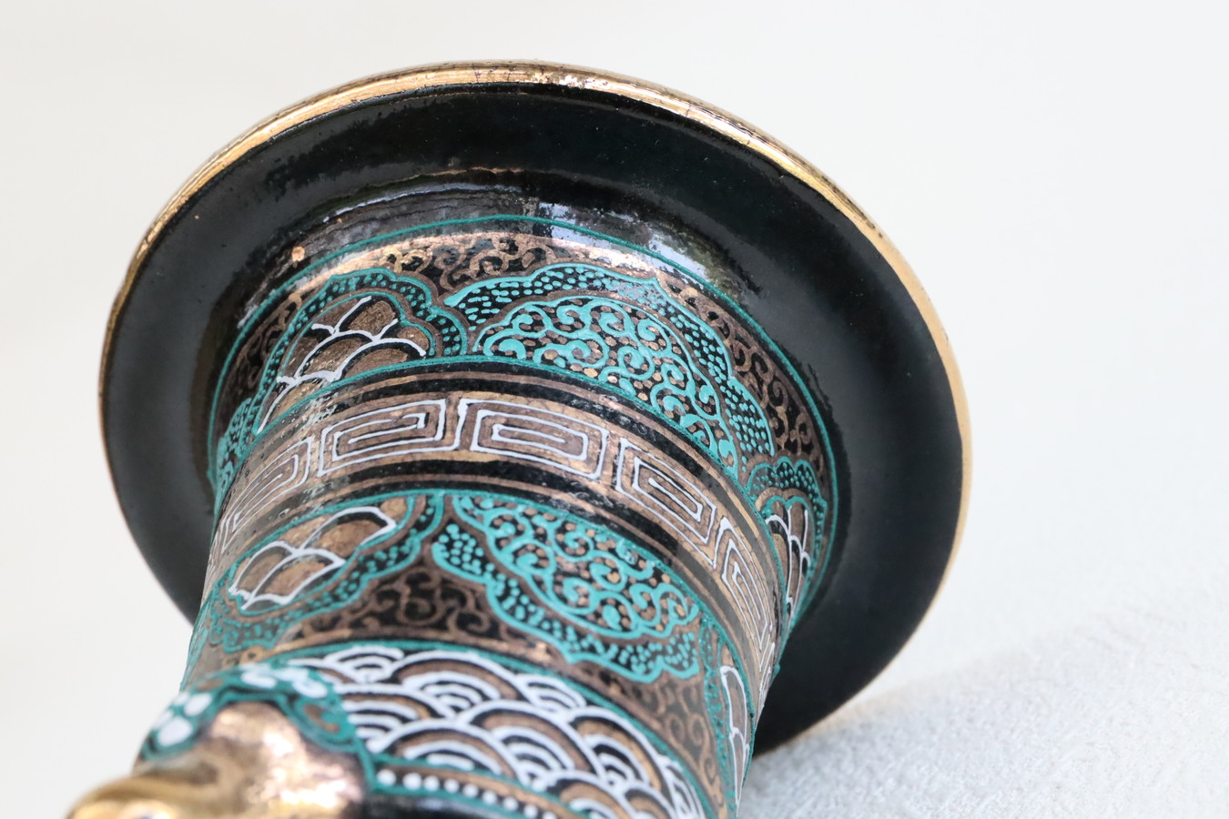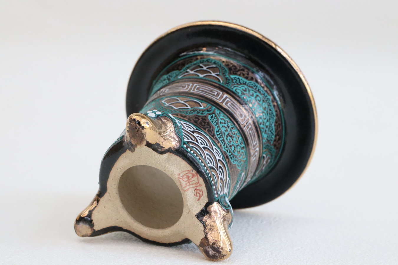 2283,加茂黒傑作 五龍雷紋唐草青海 萬年青楽鉢 外径約9.7cm 里サイン