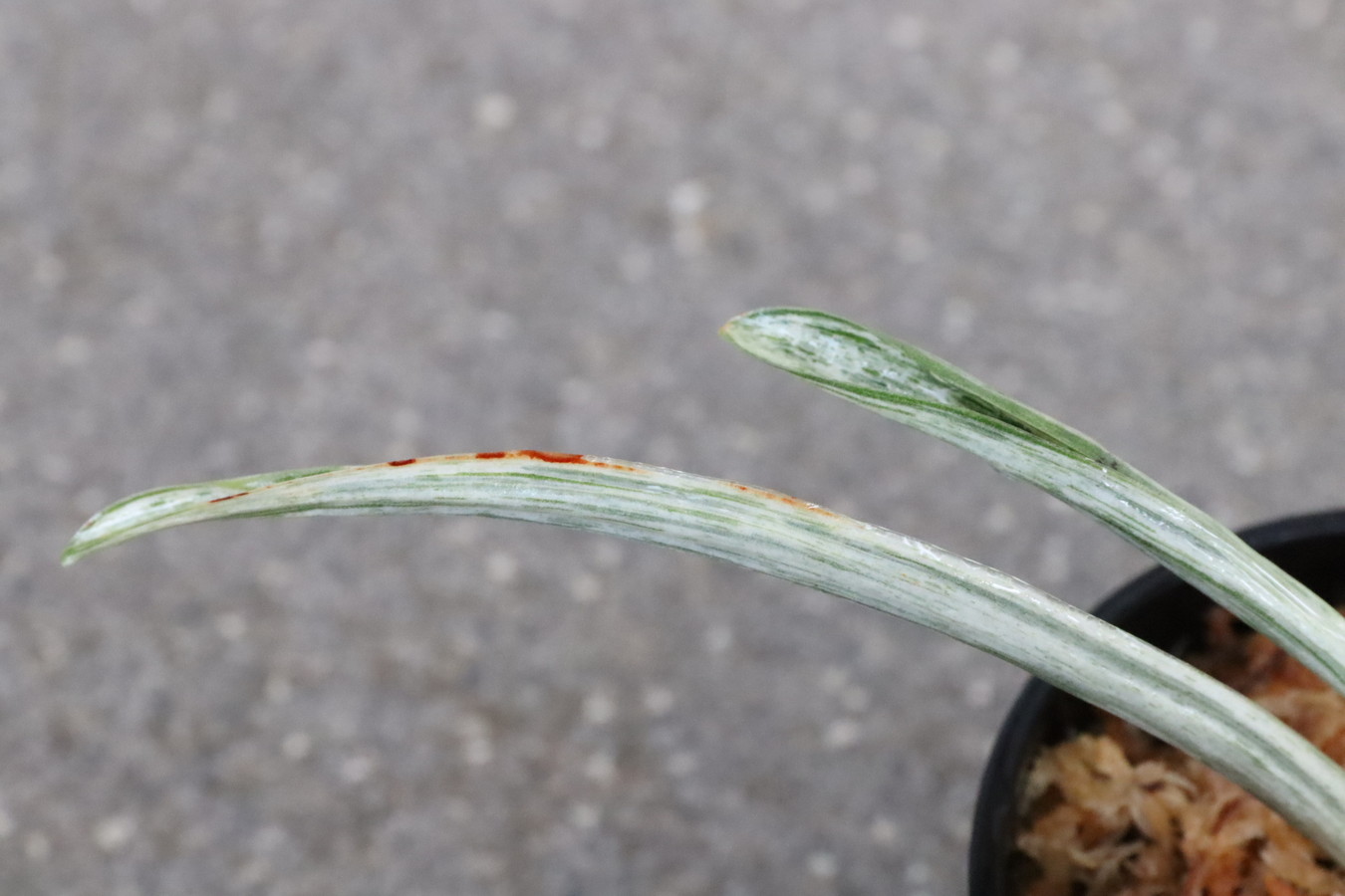 葉の全面を雅糸竜が覆うこともあり、芸非常に強い。日の具合がちょうどよいと、葉の半分が千代田斑に、半分が雅糸龍になり、時おり、玉龍を見せる。葉先はとがる。