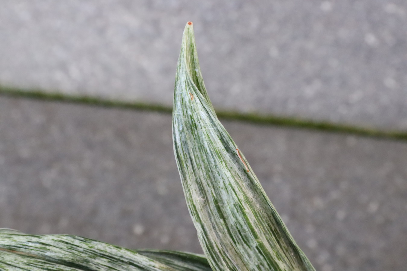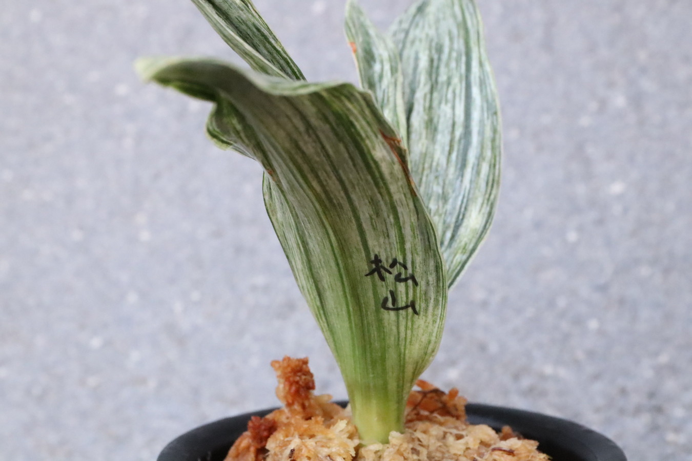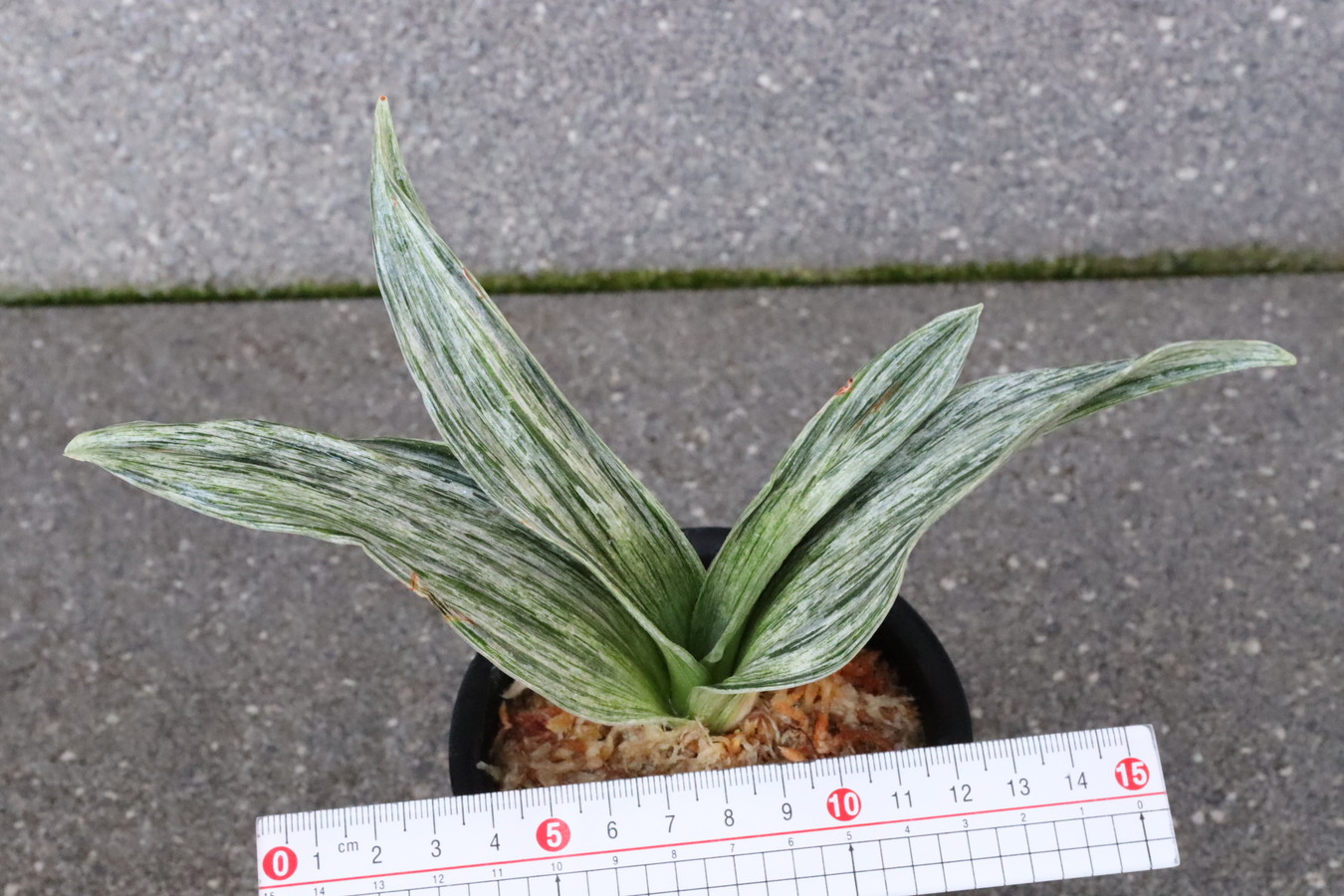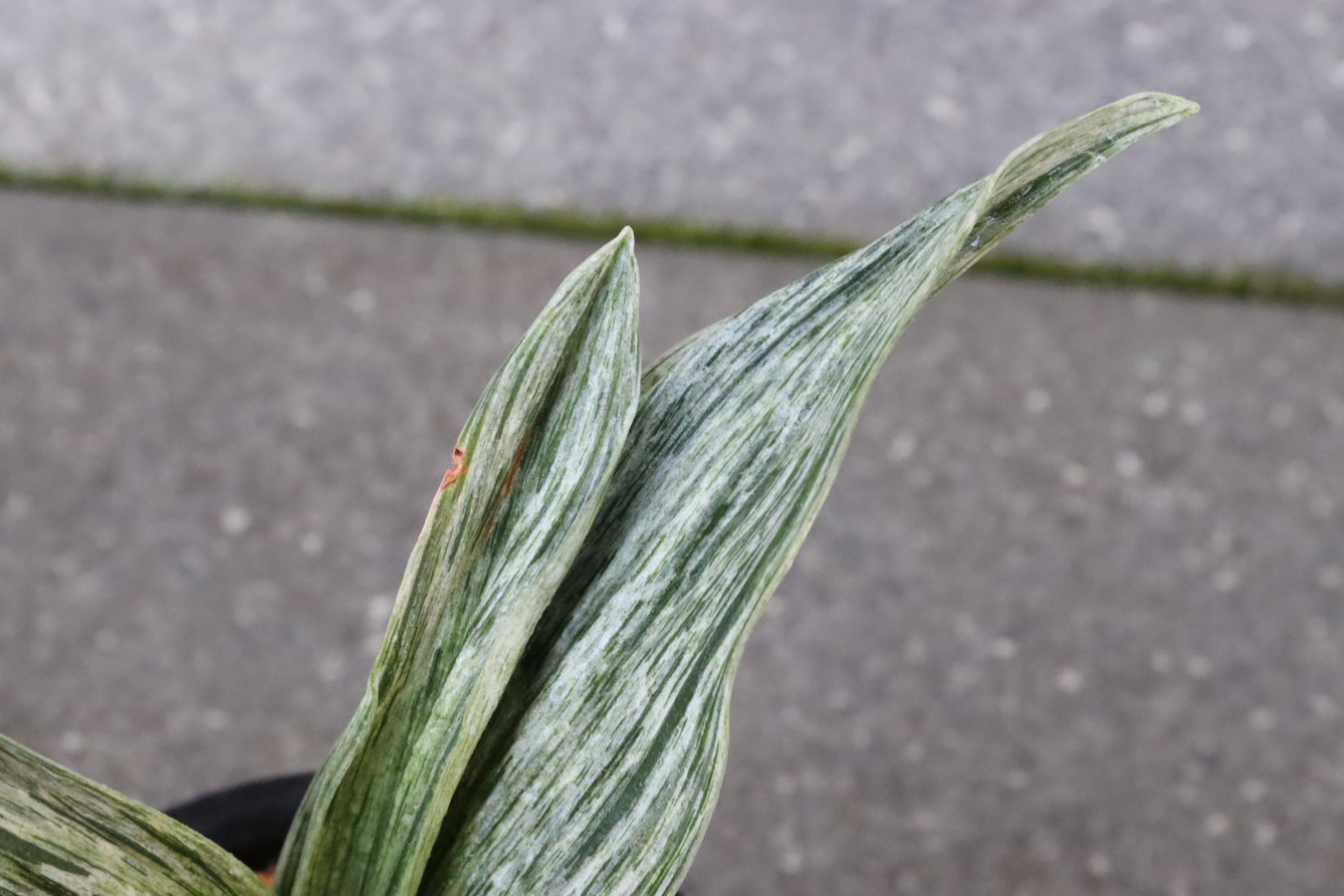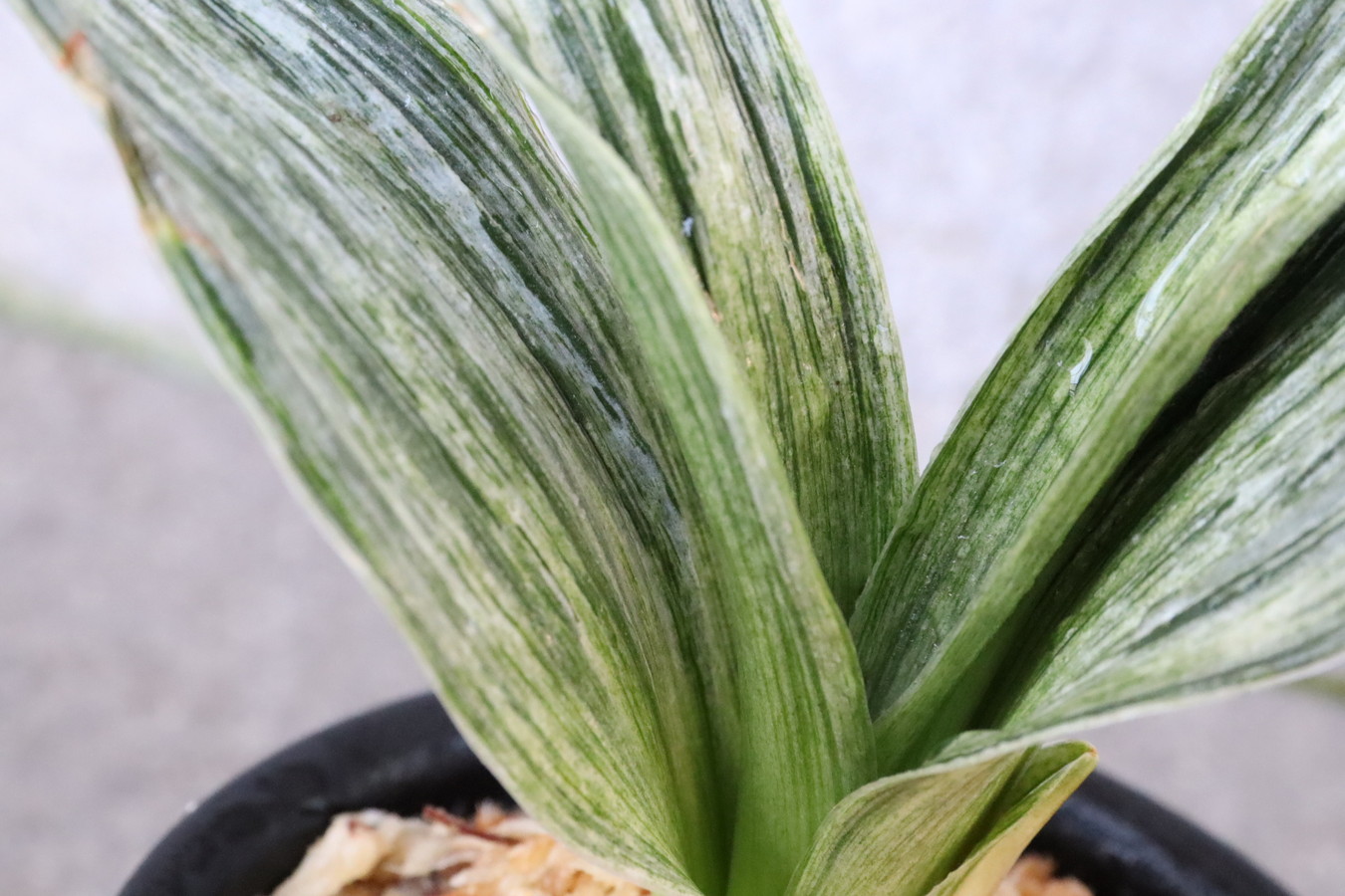 葉の全面を雅糸竜が覆うこともあり、芸非常に強い。日の具合がちょうどよいと、葉の半分が千代田斑に、半分が雅糸龍になり、時おり、玉龍を見せる。葉先はとがる。