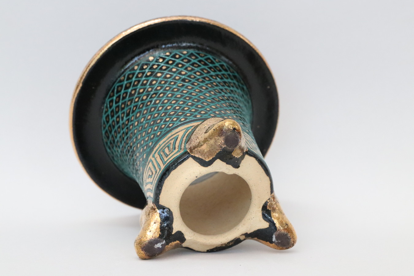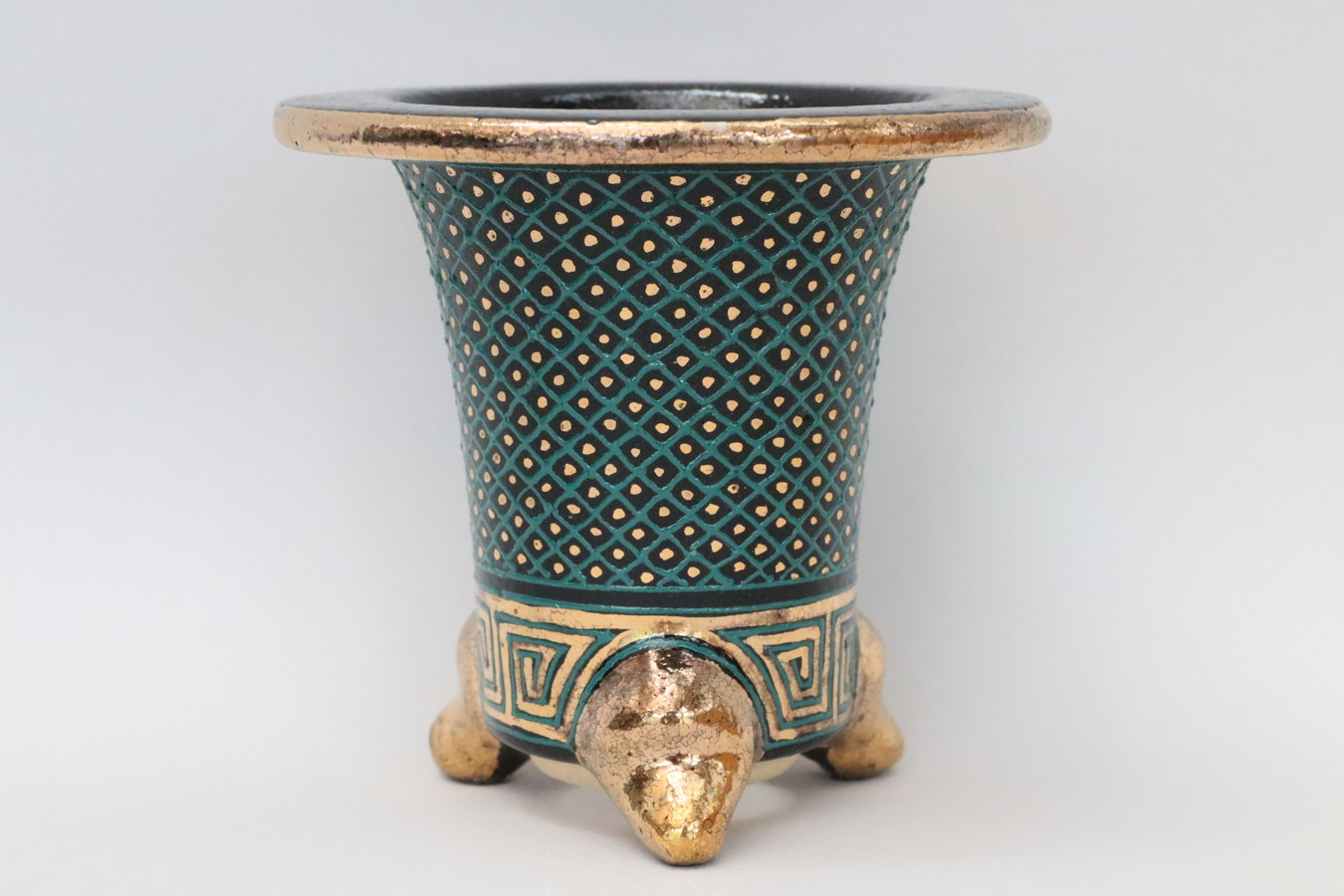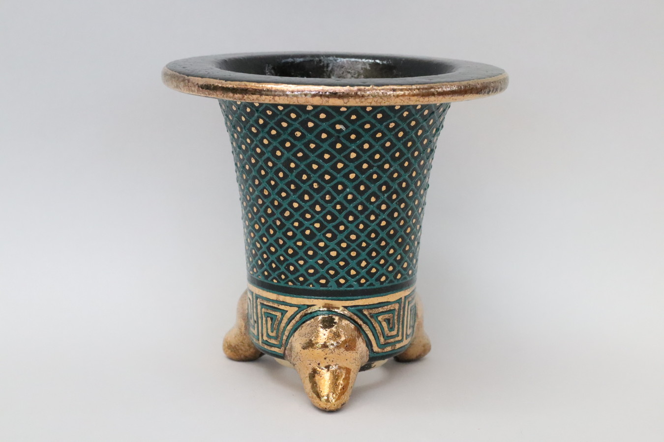 古くから使われるおもと錦鉢の柄。もとは、小さな輪の文様の集まりが、魚の卵を連想させる事から、「七子」「魚子」「斜子」などの字があてられている。古くからある柄のようで、延宝六年(一六七八)の加賀藩の工芸標本『百工比照』の中に、「ななこ」の名称が見られる。また小浜藩の藩医が延宝年間に記した書物にも「魚子塗」の言葉が見える。鉢の柄は渋く、おもとを引き立てる、ということで古くから愛され、使われてきた。単純な柄ゆえ、その作家さんの技量もでて、素晴らしい物は古いものはもちろん、新しい物も価値が高い。格子の中の点である、金の絵具は、絵付けの時は黒く、地の鉢も黒鉢で、必ずといっていいほど目残しがある。手間も非常にかかる鉢でもある。古くからあるので、描き方も様々。
