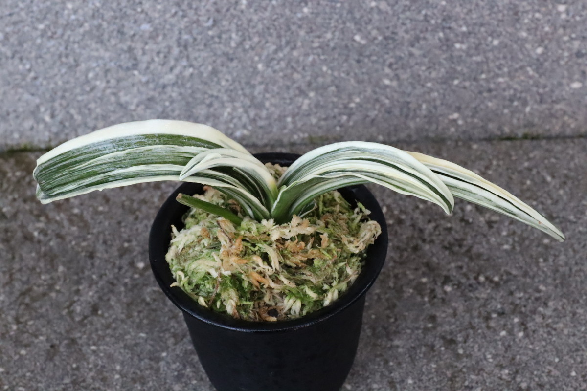 濃紺緑色の葉に白い深覆輪が現れます。
