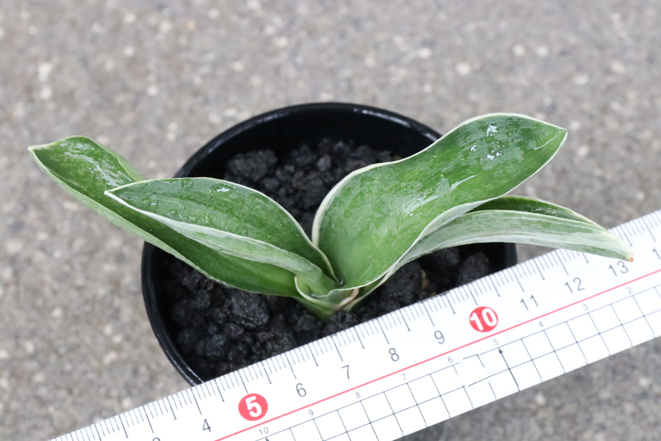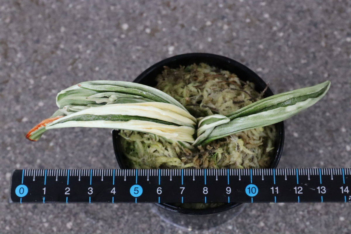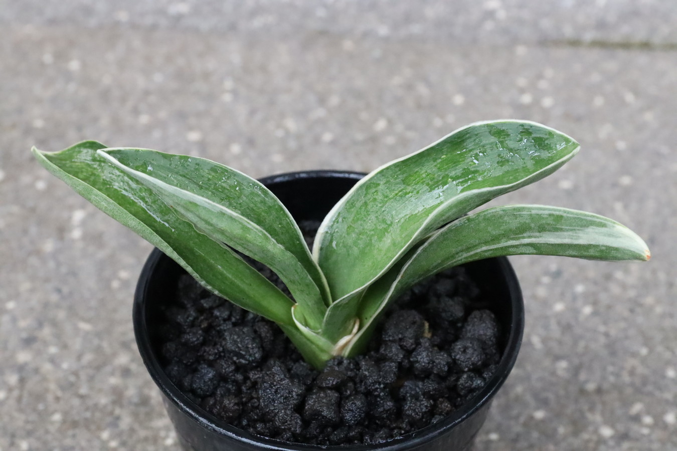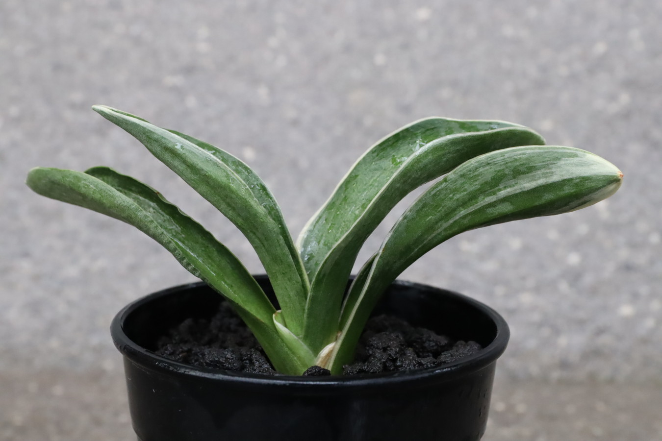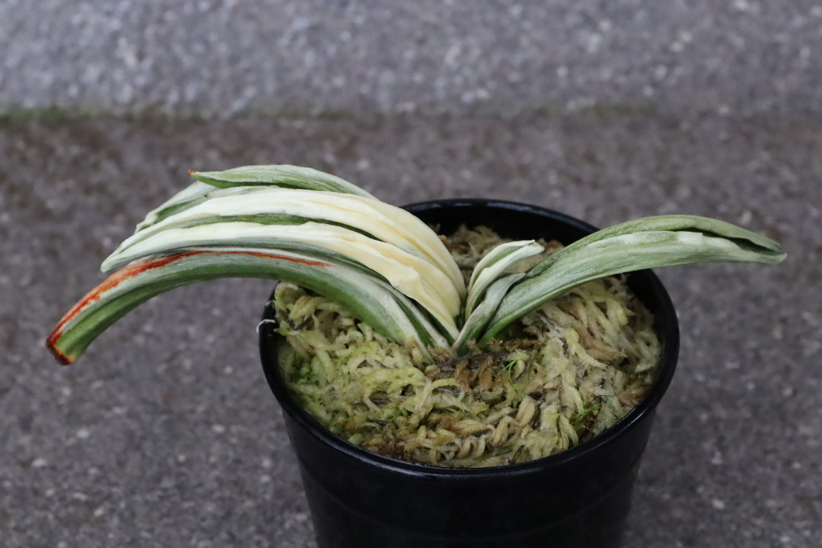 奈良錦(ならにしき) 葉長7㎝、葉幅3㎝内外の中型種。首元が太く、腰折れの良い中立ち葉の容姿に、葉先は丸止めになる。地合いは粗れ地で、深い覆輪がかかり、熨斗葉、甲竜を主体にした葉芸は、年とともに雅糸竜、跳ね竜、玉竜など多彩な芸を現し、個性的で作り込む楽しみがある。性質は丈夫で作りやすく、繁殖も良い。採光は強めで良い。作出後かなり年数がたつが、最近全国的に数が少なく、質を思うと価格的に割安なため、じっくりと作り込むマニアにお勧めしたい。