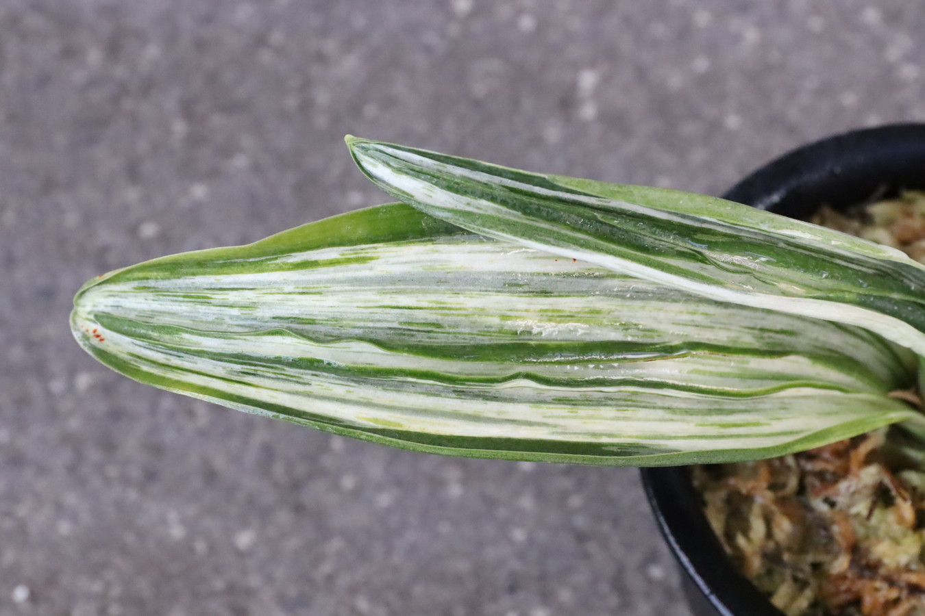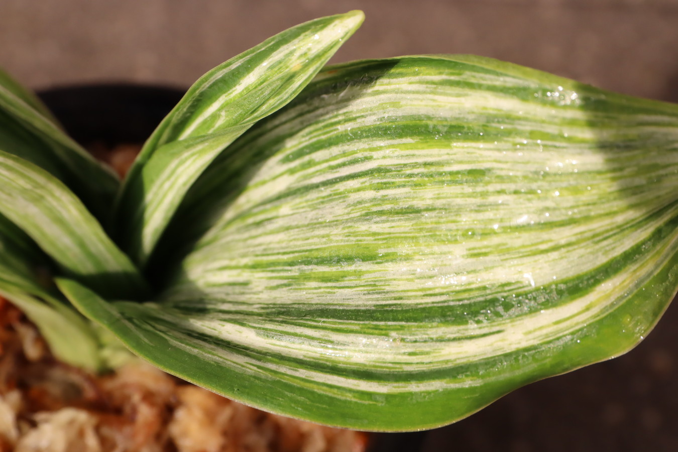 白い斑に濃紺緑色深覆輪をかけ二面竜雅糸竜を見せる品種。