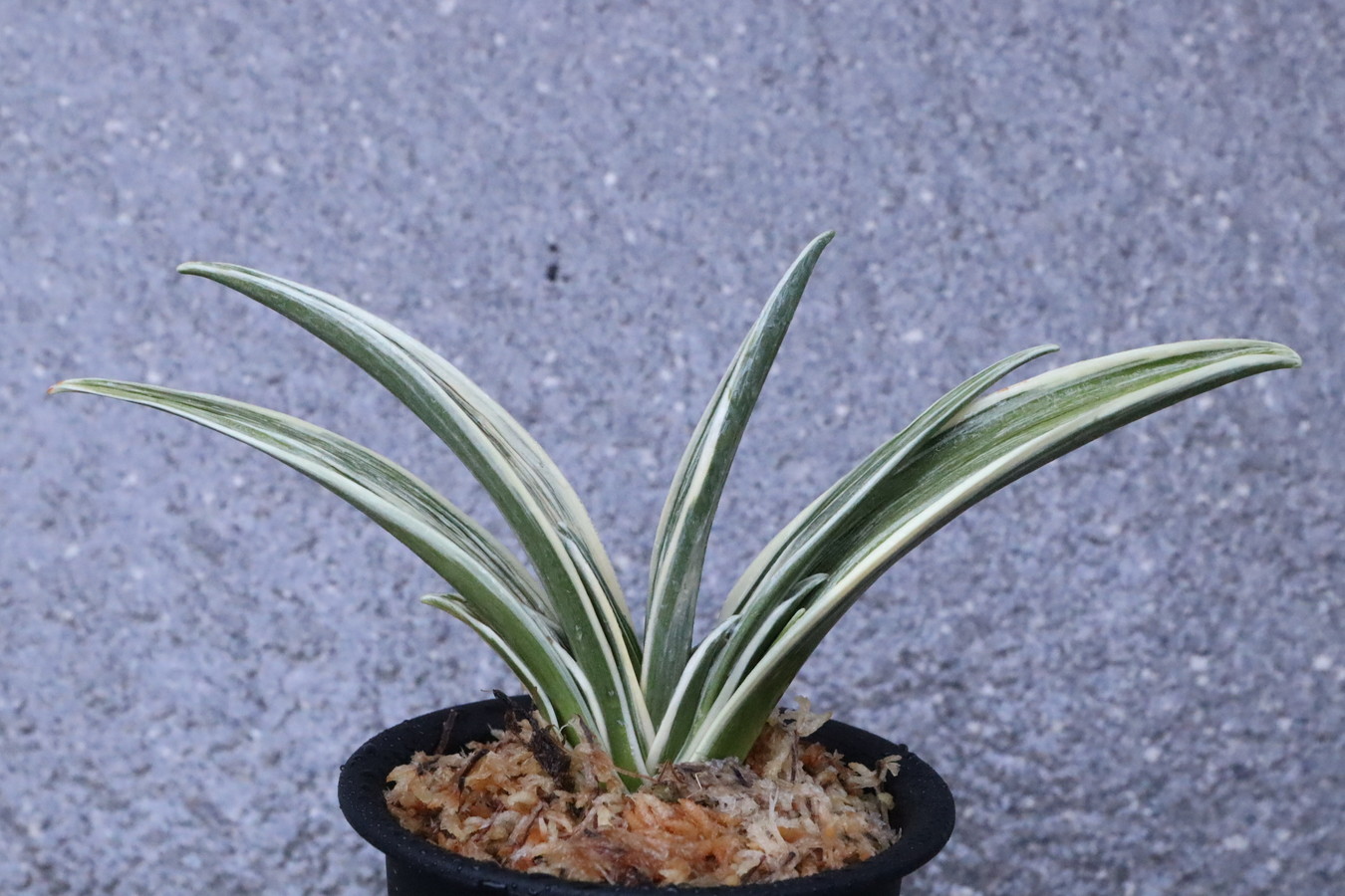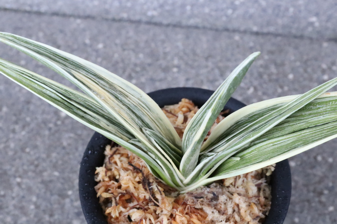 羅紗系のなかで大型種。縞甲竜系統「晃明殿」の実生。その魅力を存分に引き継ぎ、葉の中ほどでぐっと膨らみ、そこから葉先に向けて鋭くなる肉厚の葉。繊細で葉全体が輝く総雅糸竜をみせ、腰の張った重量感ある葉姿。全国の趣味者に名前を募集して命名された、稀代の銘品。
