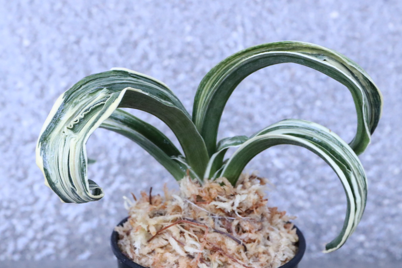 おもとの中でもこれほど激しい玉雅糸竜・跳竜を見せる品種は少ない。獅子系統の中では一度は作ってみたい品種。子上良く丈夫です。又実親として芸を移す雄木に使用しても面白い。
