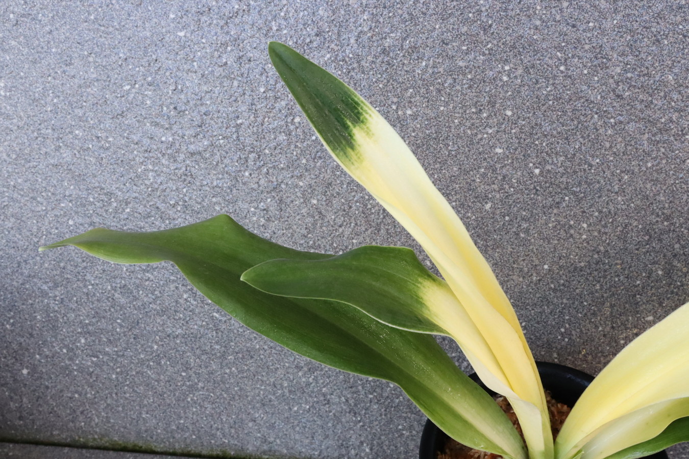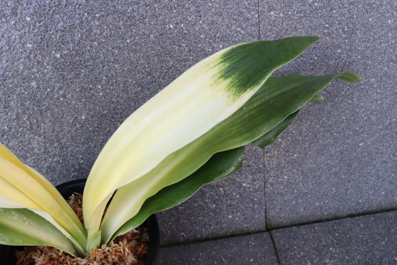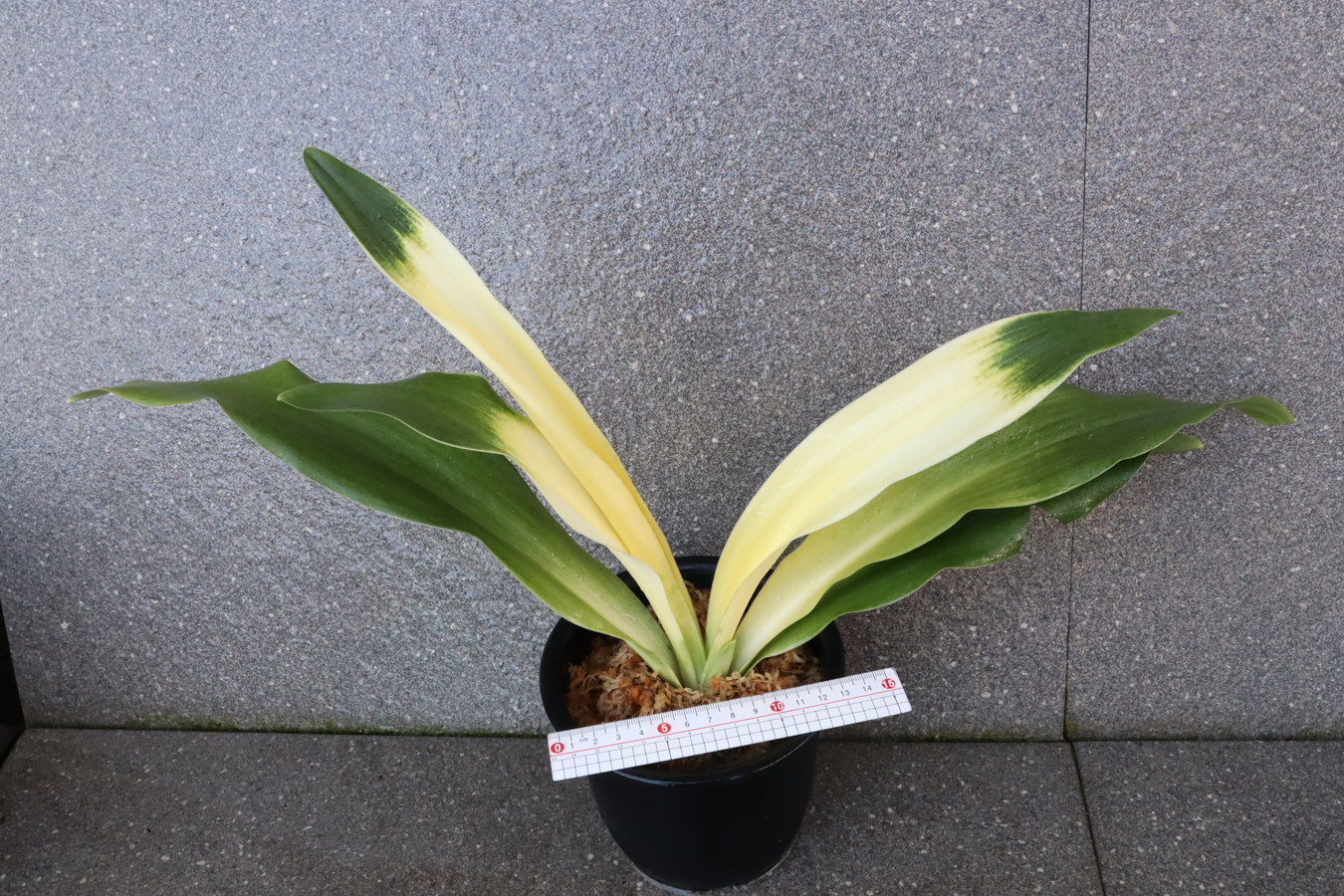 交換会で売りに出された2枚葉の実生を求め作る。葉幅が広く立ち葉性で紺性強く、その中に独特の卵黄色の美しい曙虎を現す。曙系品種は多種多様だが、その中でもひときわ目を見張る美しさがある。葉長40㎝、葉幅8㎝内外。当初、性質はやや弱いところがありましたが、殖えていくにつれて丈夫になっていきました。子上は大変良く、根出しも良い。肥料を控えめに与えれば栽培が容易な品種で4月~6月に十分日光に充てて作ることにより美しい曙虎を現す。美麗品。