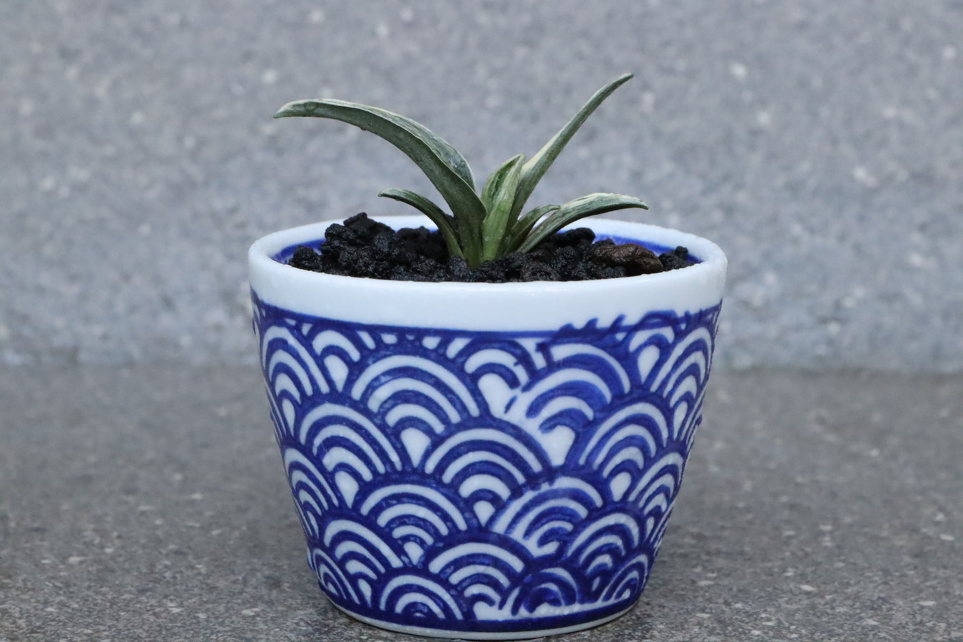 鉢の【波 青海波 せいがいは】は、永遠によいことが続いていくように、という願いが込められています。万年青の名前が万年、青々と繁栄していく様を万年青というように、非常に縁起良いお祝いの贈り物や新築祝い、記念の品です。