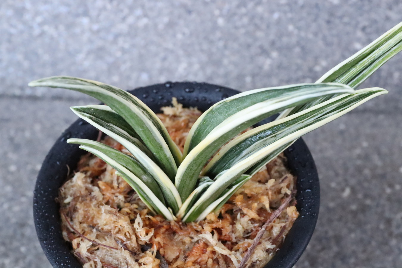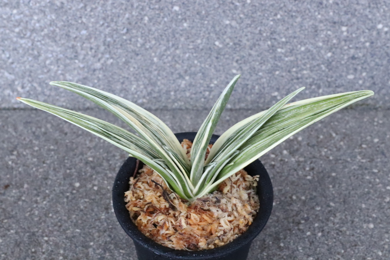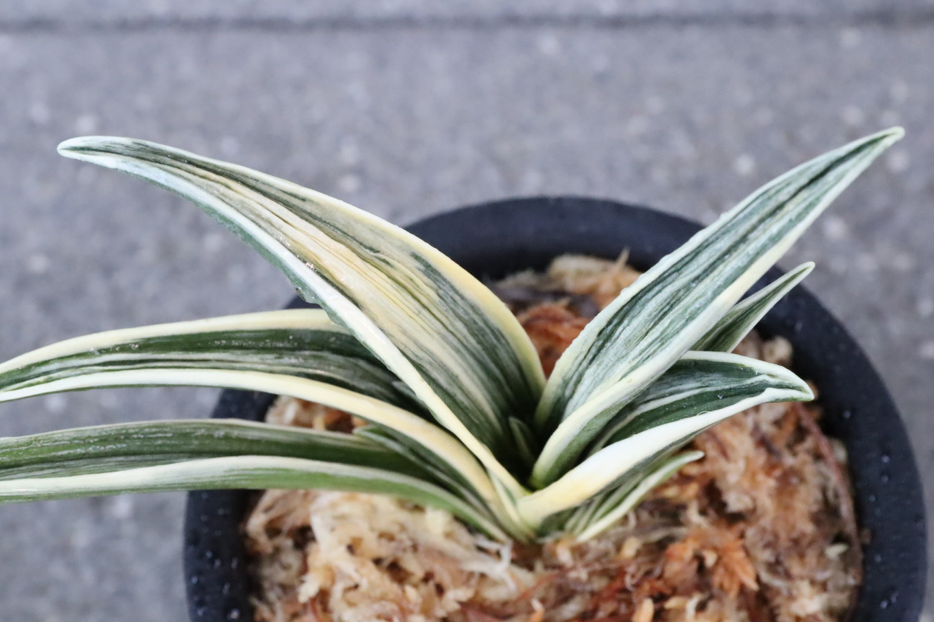 羅紗系のなかで大型種。縞甲竜系統「晃明殿」の実生。その魅力を存分に引き継ぎ、葉の中ほどでぐっと膨らみ、そこから葉先に向けて鋭くなる肉厚の葉。繊細で葉全体が輝く総雅糸竜をみせ、腰の張った重量感ある葉姿。全国の趣味者に名前を募集して命名された、稀代の銘品。