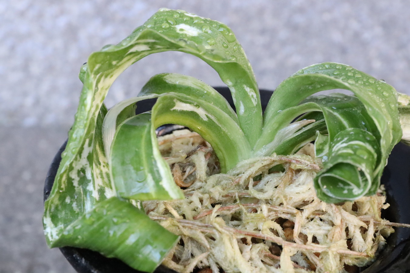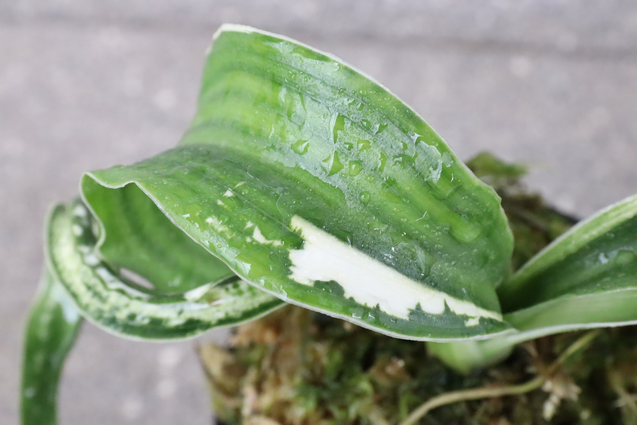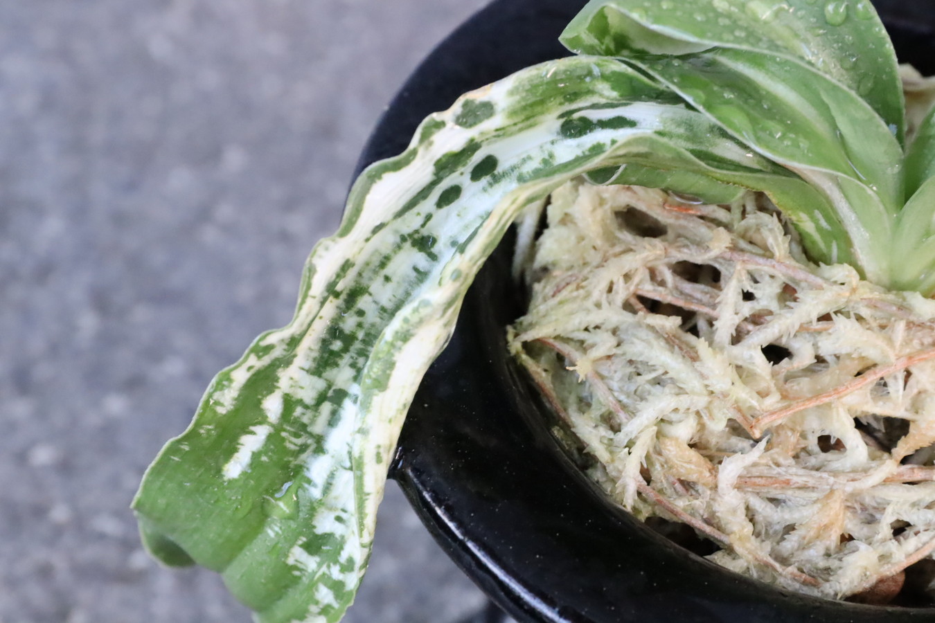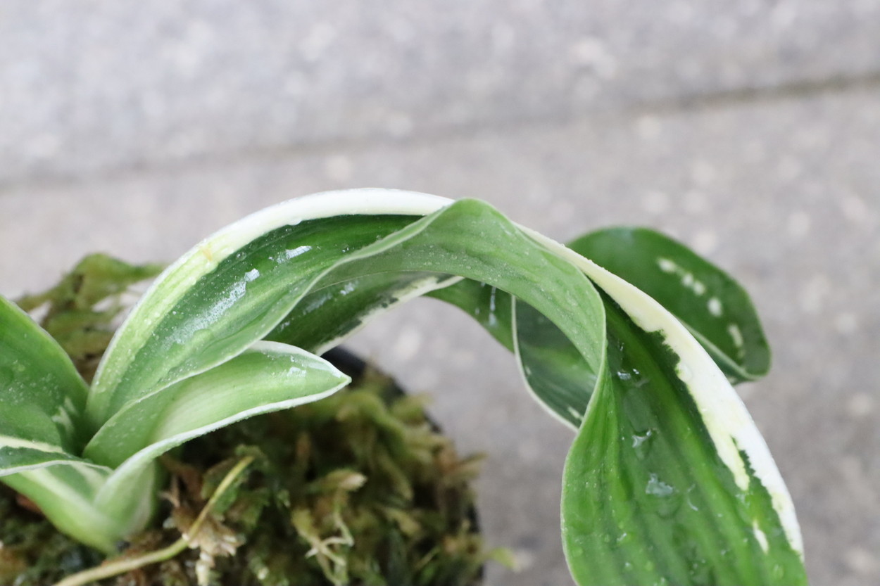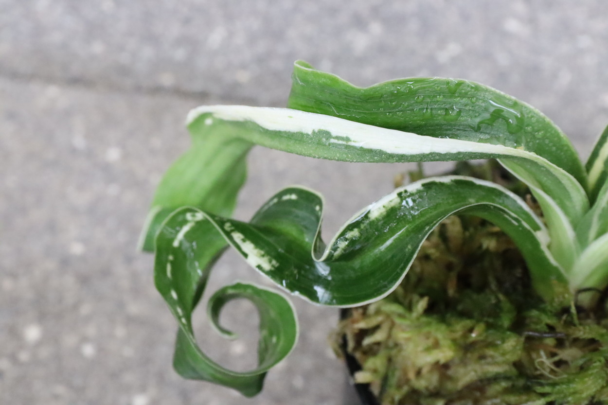濃緑色の細葉に白い図柄を現します。葉は波を打ちながらカールします。