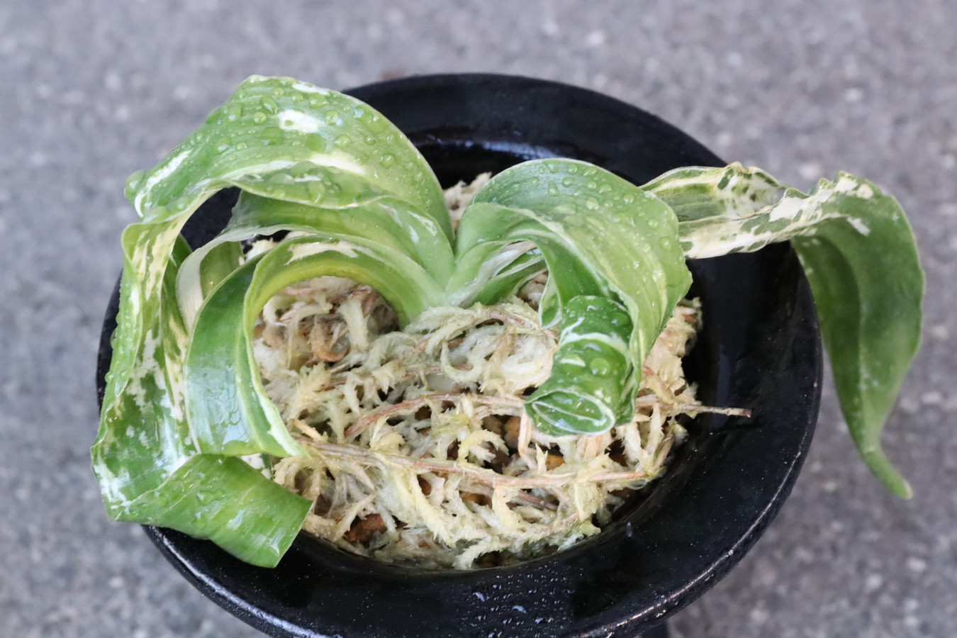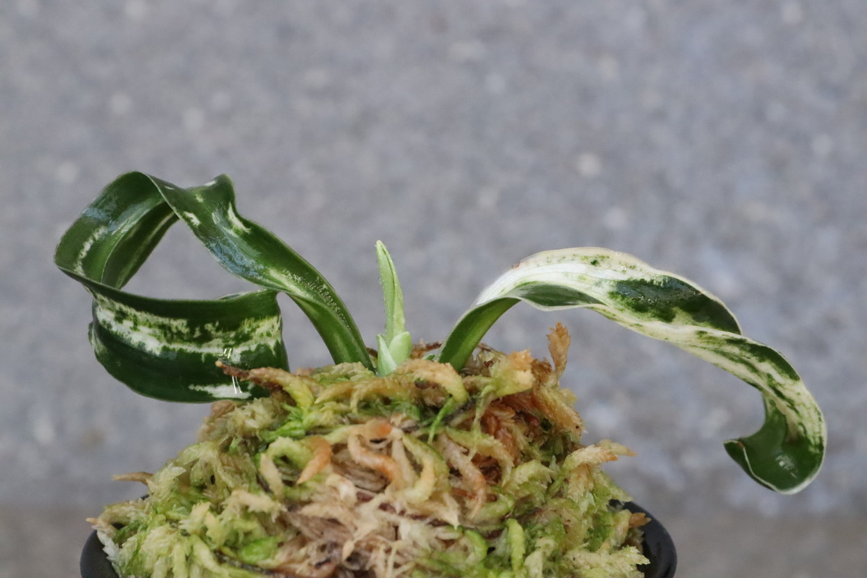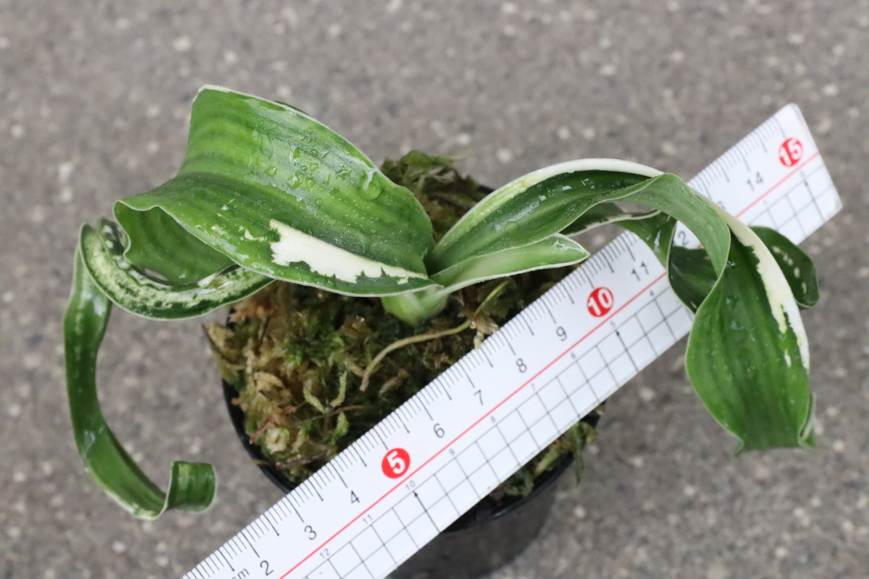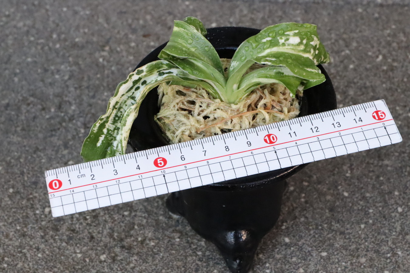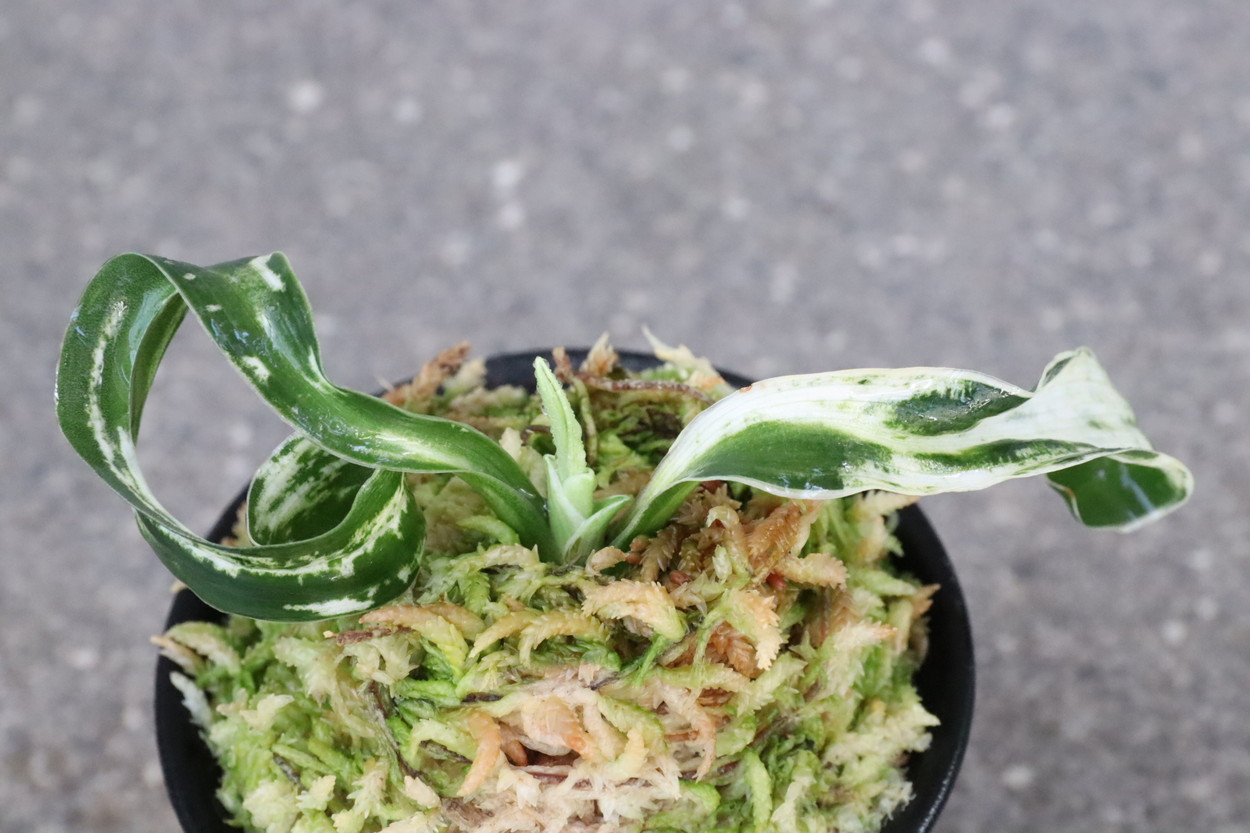 濃緑色の細葉に白い図柄を現します。葉は波を打ちながらカールします。