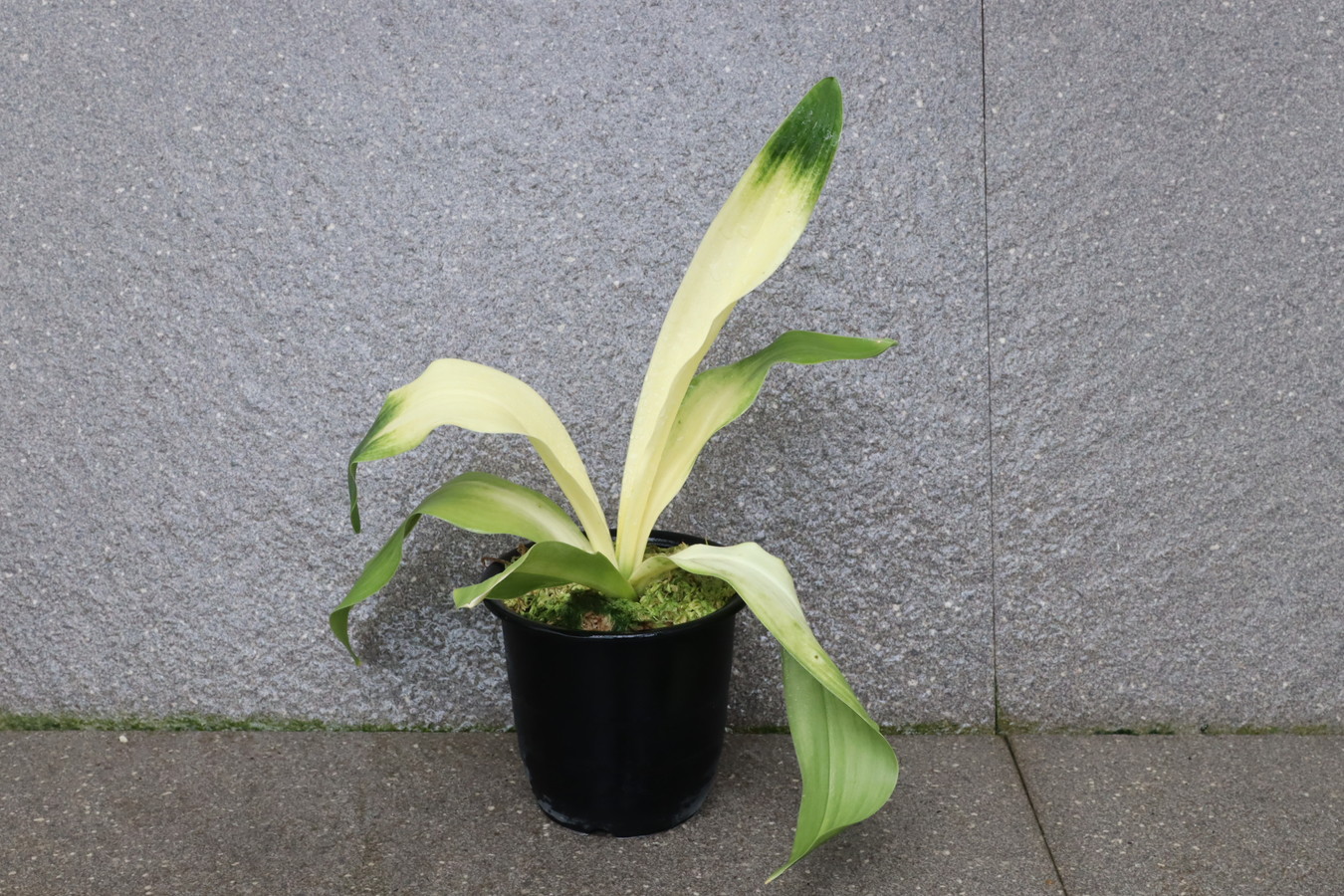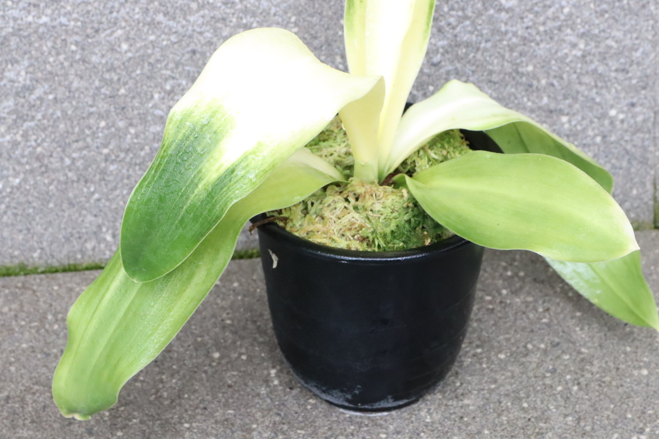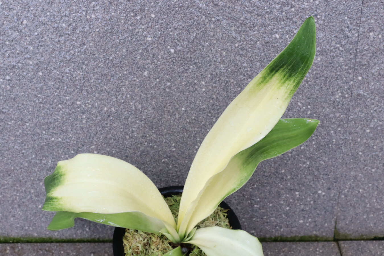 交換会で売りに出された2枚葉の実生を求め作る。葉幅が広く立ち葉性で紺性強く、その中に独特の卵黄色の美しい曙虎を現す。曙系品種は多種多様だが、その中でもひときわ目を見張る美しさがある。葉長40㎝、葉幅8㎝内外。性質はやや弱いところがあります。子上は大変良く、根出しも良い。肥料を控えめに与えれば栽培が容易な品種で4月~6月に十分日光に充てて作ることにより美しい曙虎を現す。美麗品。
