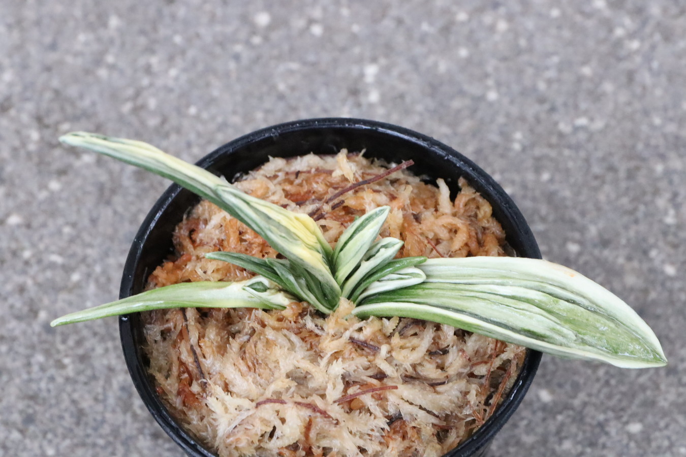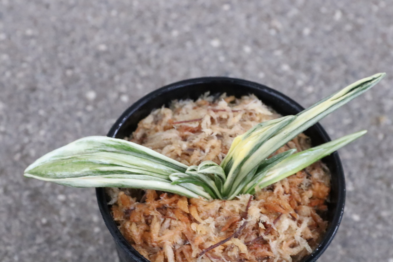 葉長7cm、葉幅3㎝内外の中型種。腰折れが低く、平葉型で、熨斗葉、本剣、棒葉、葉面溢れるばかりの総雅糸竜を見せる。濃紺地に純白の鮮明な覆輪をかける。葉面を純白な糊に覆われた姿は魅力的である。少し芋が柔らかいので、肥料は少なめが良い。子出し良く、繁殖は良い。