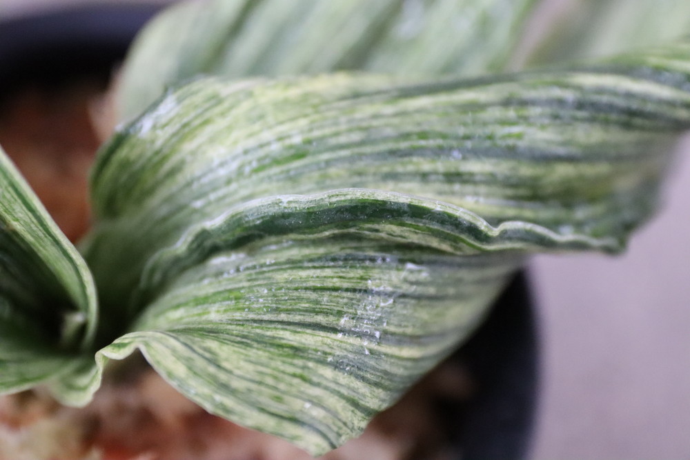 おもとの中でもこれほど美しい獅子は少ない。獅子系統の中では一度は作ってみたい品種。子上良く丈夫です。又実親として芸を移す雄木に使用しても面白い。