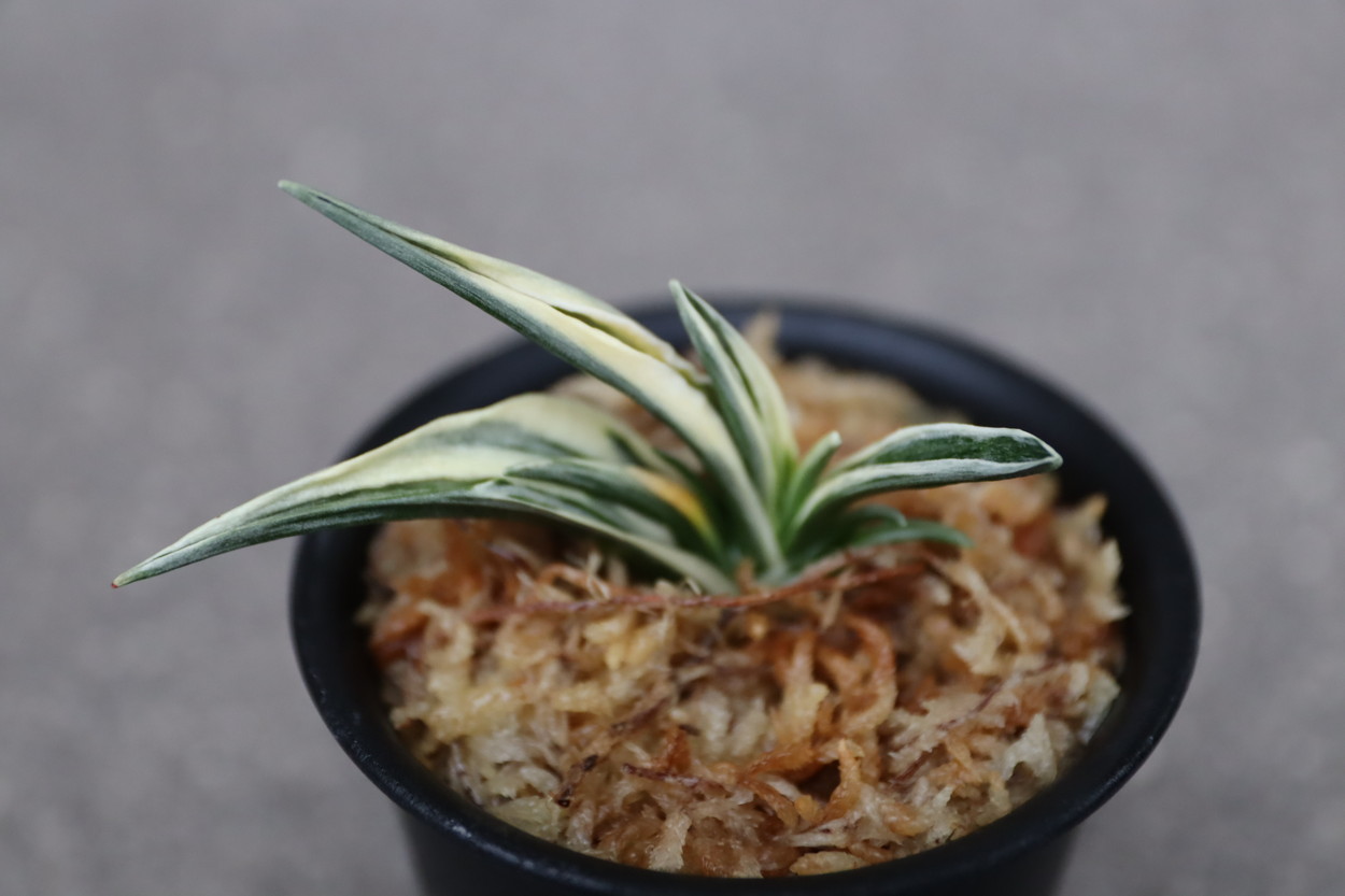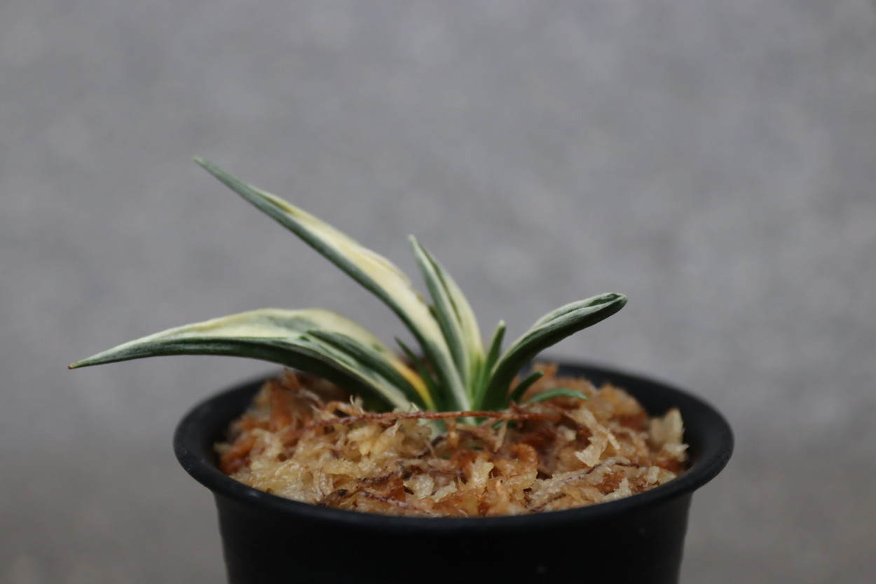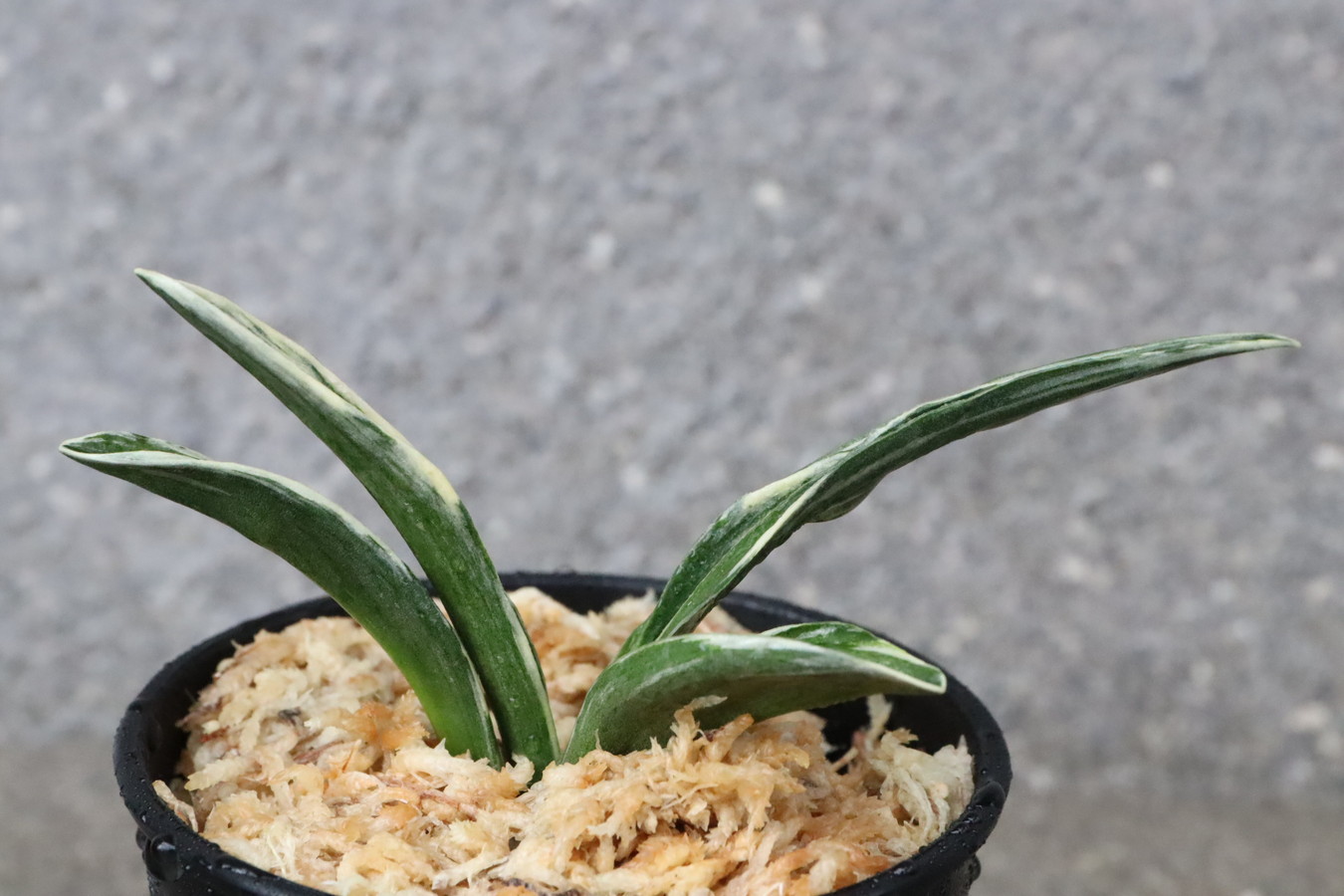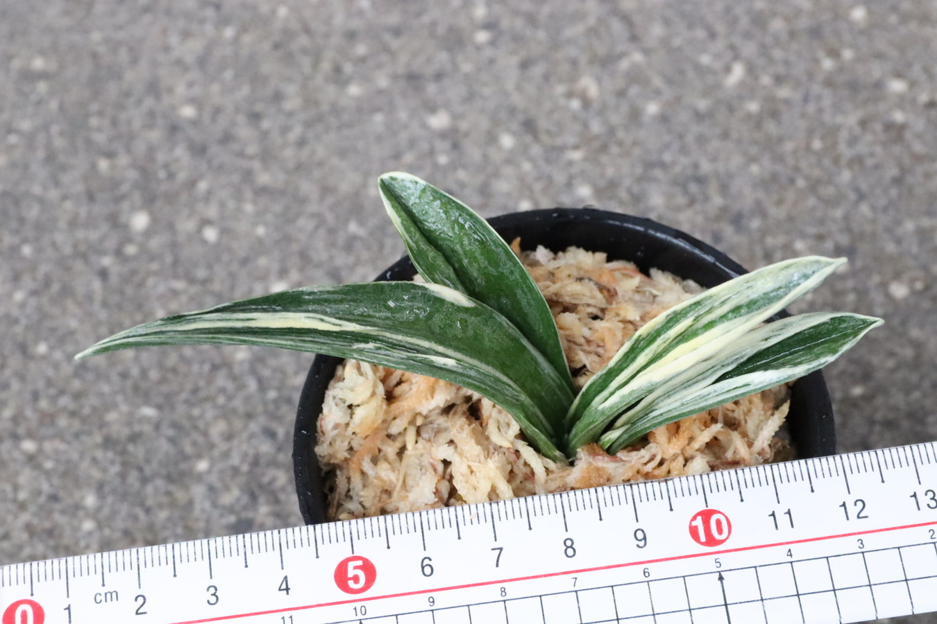 実親『大宝』から生まれた。昭和8年に命名者が譲り受けて命名し盛大な披露宴を催して全国に棚割りされた。葉長4㎝、葉幅2㎝内外の小型種。濃紺緑色の紺地で、葉先は尖って葉肉は厚く、首は太い。雅糸竜、剣葉、鈴虫剣など多芸である。黄色み帯びた覆輪が輝き、襟組みも良く、落ち着いた小型の代表品種。小型だが、至って強健である。