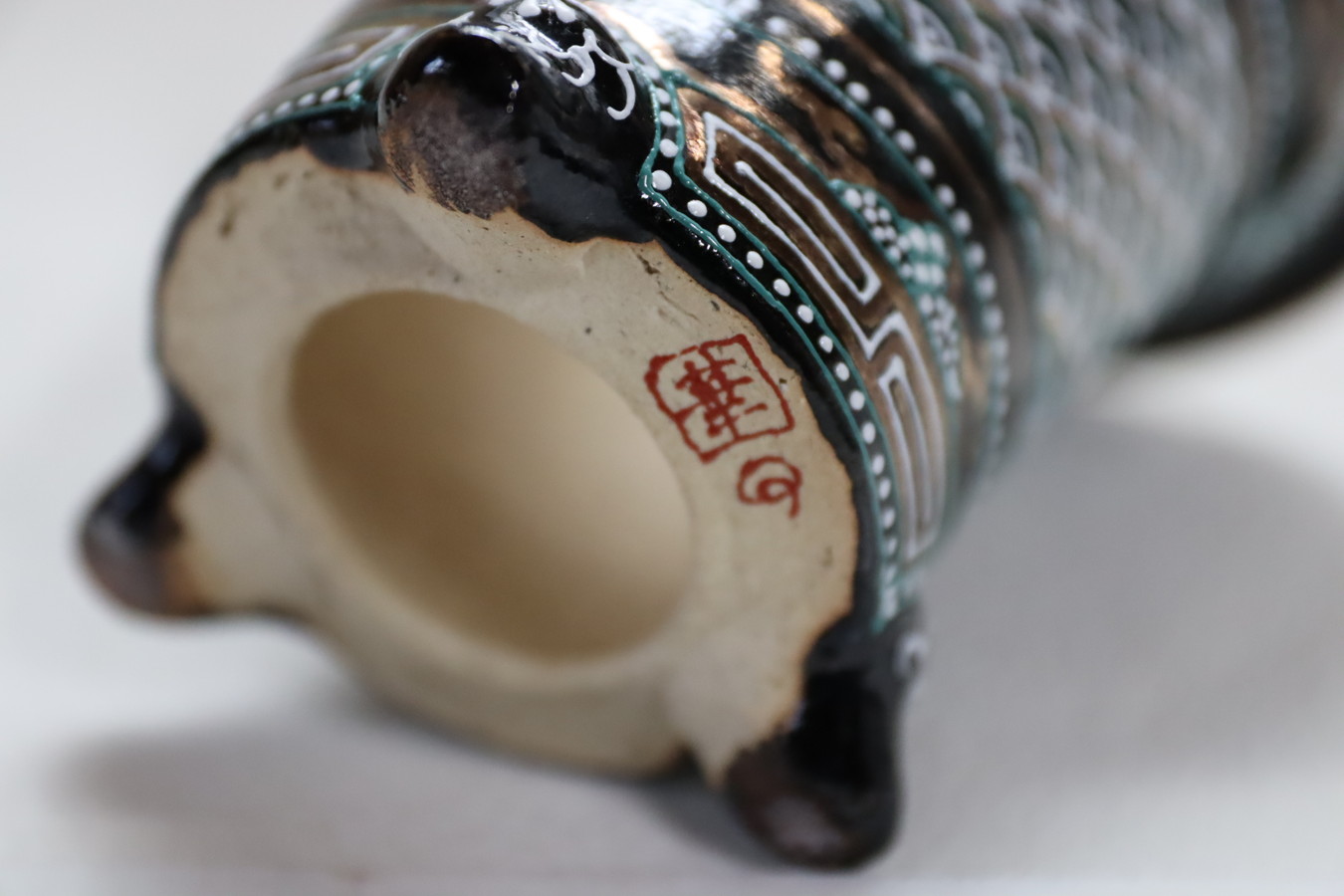 2598,【最上級青海波】萬年青楽鉢 外径約9.5cm 高さ約9.0cm 華サイン 縁浅胴太 賀茂黒