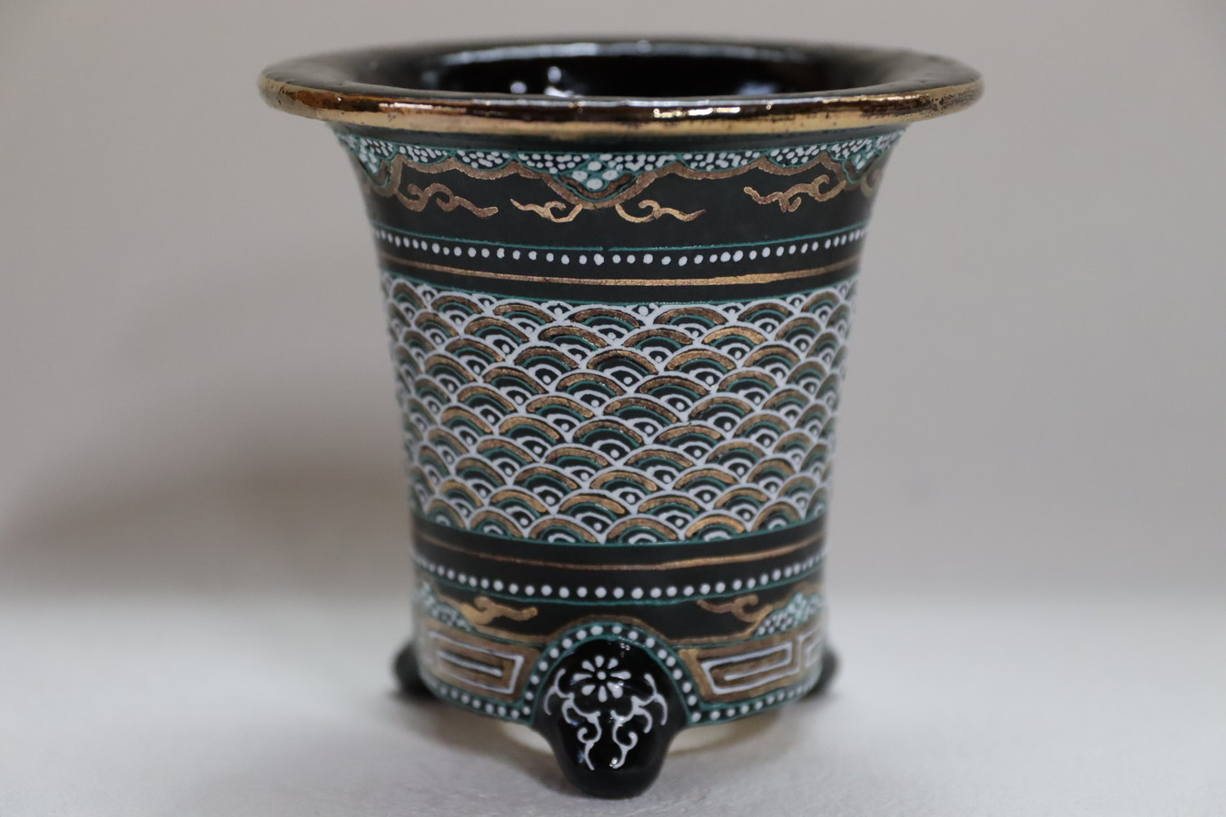 これ以上の作ない、青海波の精緻な色重ね。青海波のような幾何文様は、細かくすればするほど、倍どころか、10倍づつ時間がかかるといわれる。今まで萬年青鉢で誰も見たことがない領域にいっている。