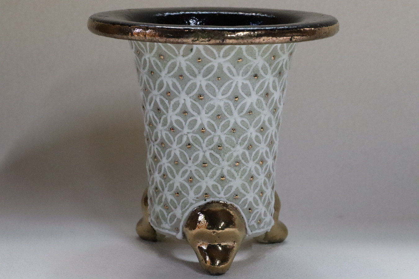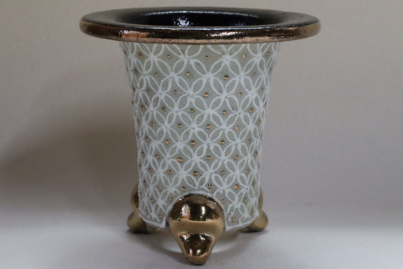 古くから使われるおもと錦鉢の柄。もとは、小さな輪の文様の集まりが、魚の卵を連想させる事から、「七子」「魚子」「斜子」などの字があてられている。古くからある柄のようで、延宝六年(一六七八)の加賀藩の工芸標本『百工比照』の中に、「ななこ」の名称が見られる。また小浜藩の藩医が延宝年間に記した書物にも「魚子塗」の言葉が見える。鉢の柄は渋く、おもとを引き立てる、ということで古くから愛され、使われてきた。単純な柄ゆえ、その作家さんの技量もでて、素晴らしい物は古いものはもちろん、新しい物も価値が高い。格子の中の点である、金の絵具は、絵付けの時は黒く、地の鉢も黒鉢で、必ずといっていいほど目残しがある。手間も非常にかかる鉢でもある。
