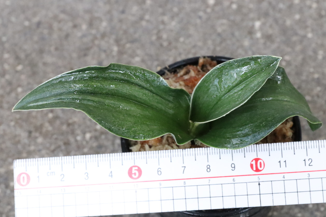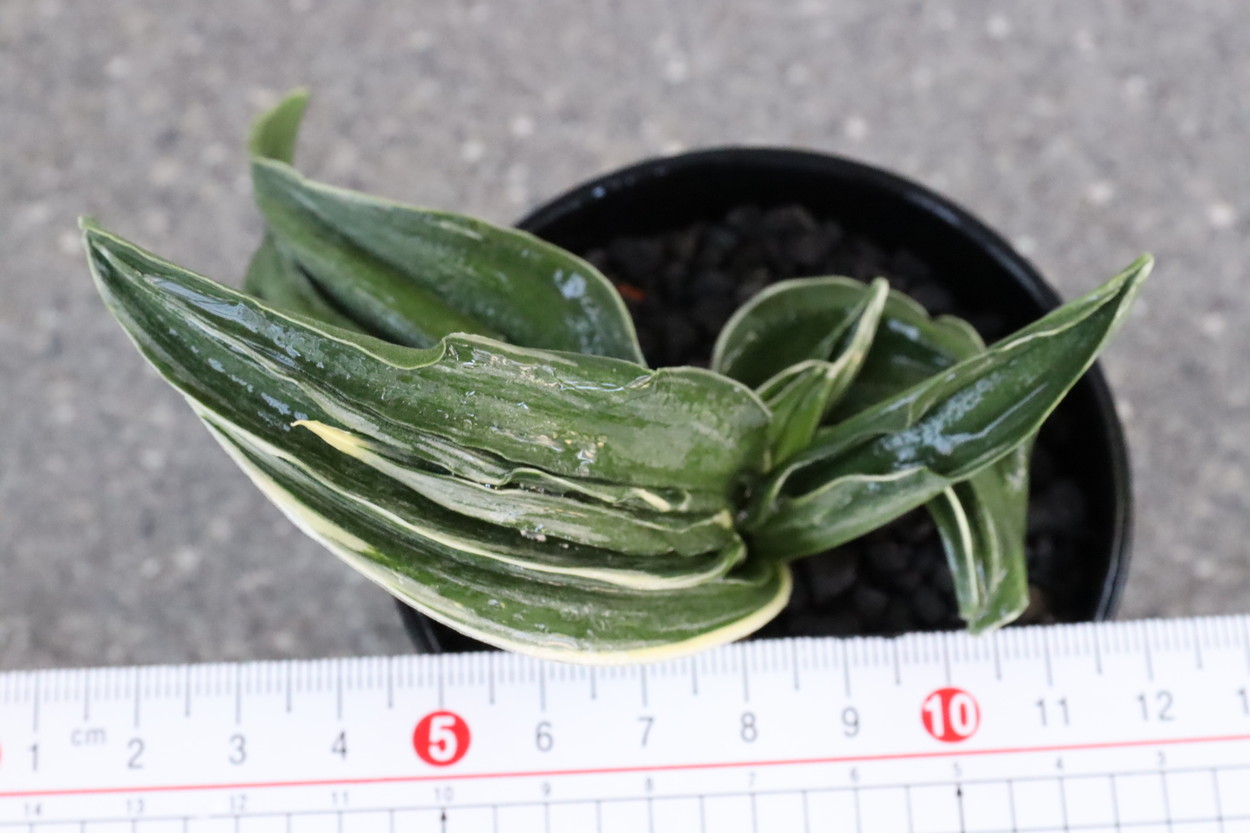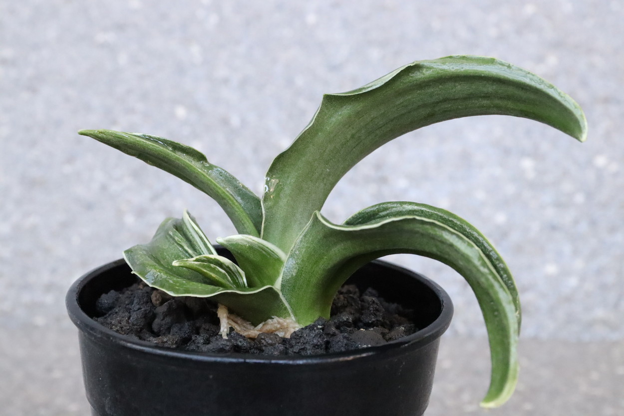 厚みと、堅さのある濃緑色の葉に覆輪、甲竜、熨斗葉を現す入門品。時に雅糸竜もみせる。親木になっても紺性を強く残すことで、特に丈夫な中型種。葉はどれも全く違った変化のある芸をみせ、作る人それぞれのユニークな完成木となる。採光、肥料も強く、芋吹きが主。子上げもし殖えも良い。初心者がまず手にする羅紗品種。
