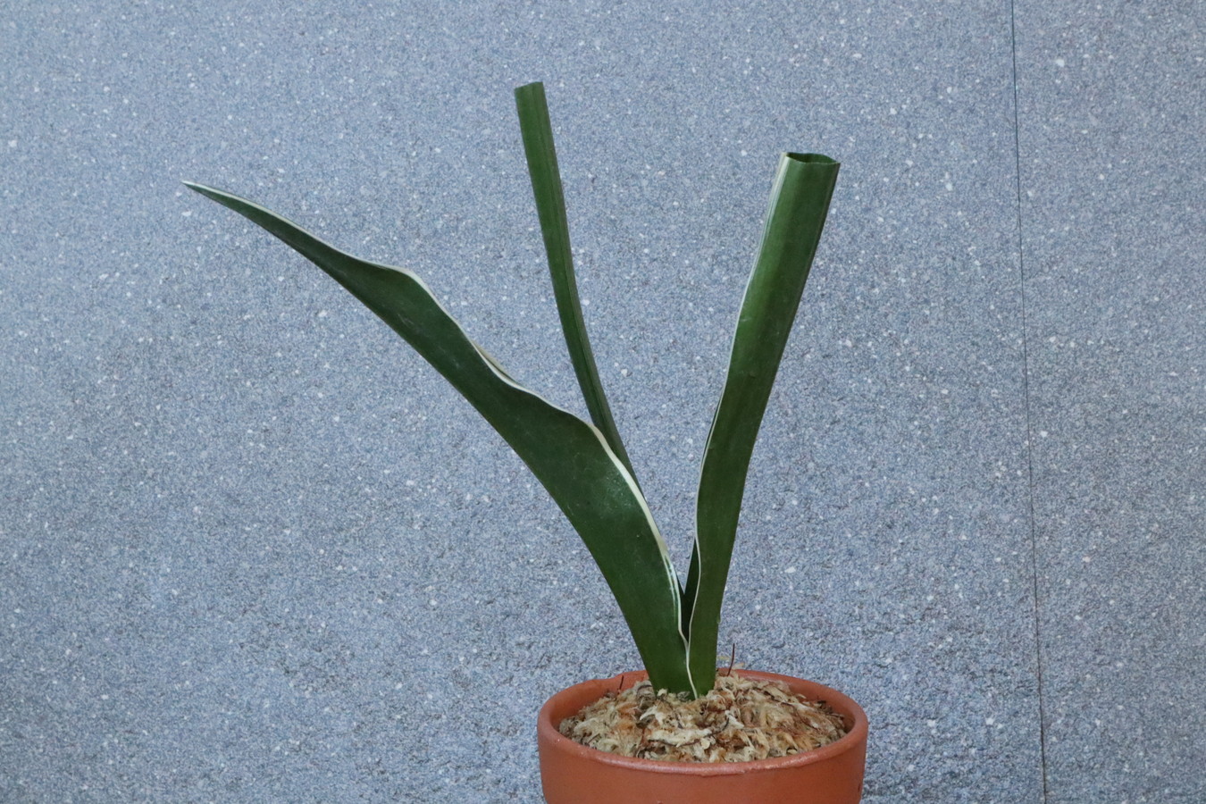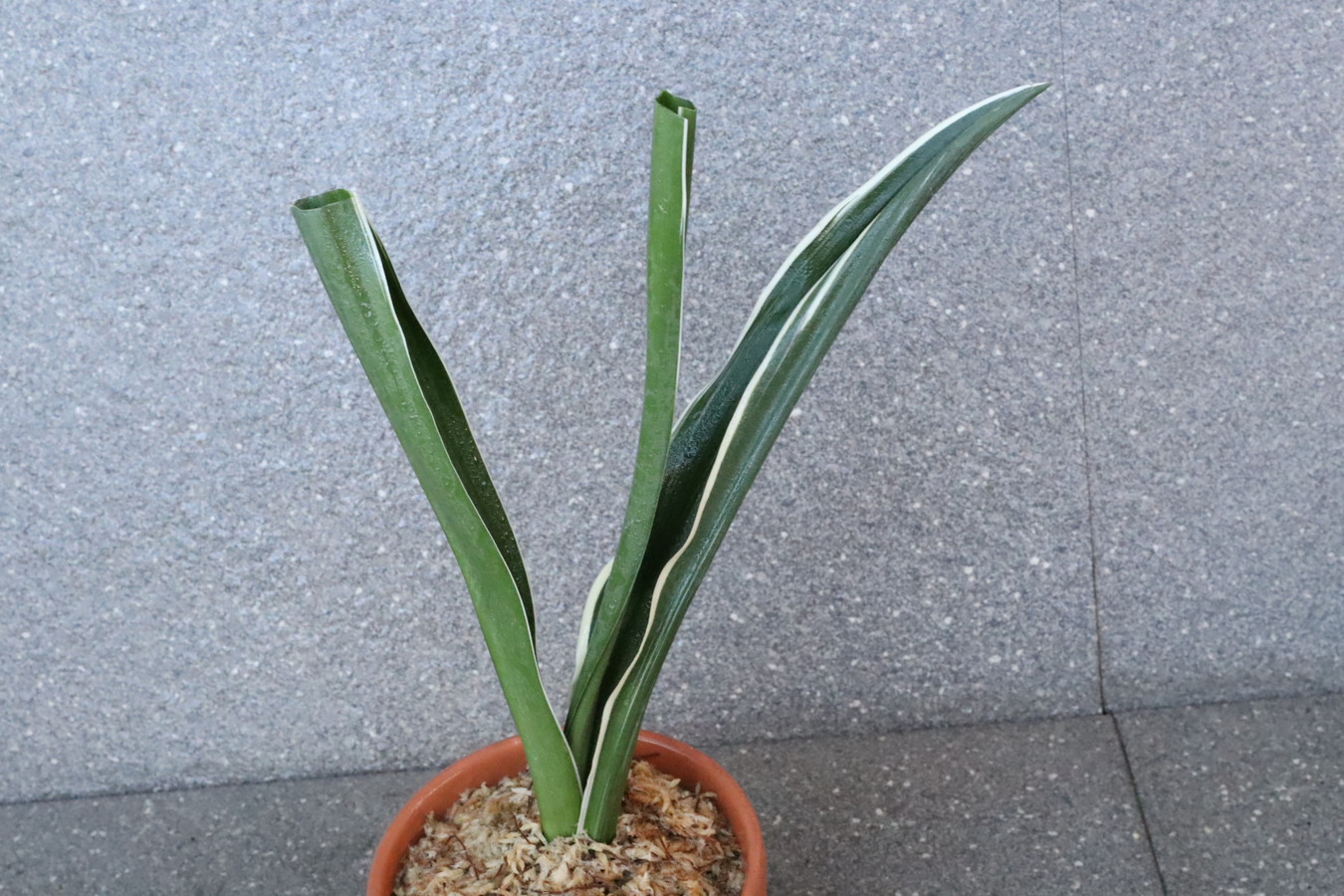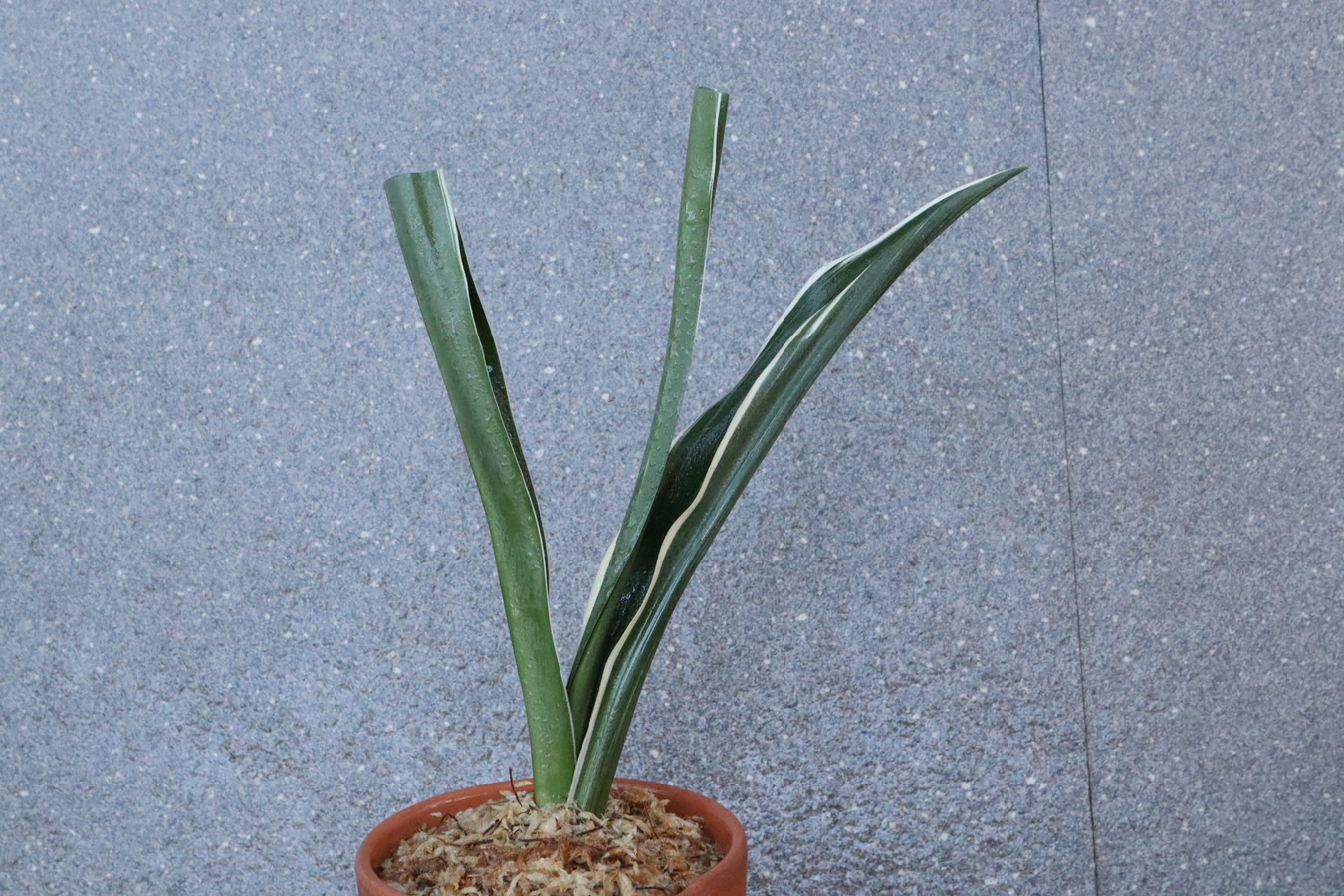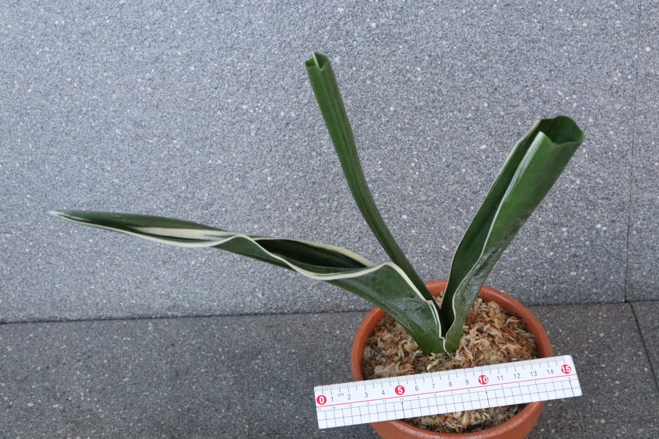 濃緑色で立ち葉性、葉長20㎝、葉幅4cm内外、若い1~5年の内は白覆輪だけ見せます。年がたつに従って棒状の立ち葉となり、葉の裏側に櫛ですいたような白い緻密な総雅糸竜を現し独特の葉姿を見せる。育て方でも葉芸を早くすることがあるが、まだよくわかっていない。