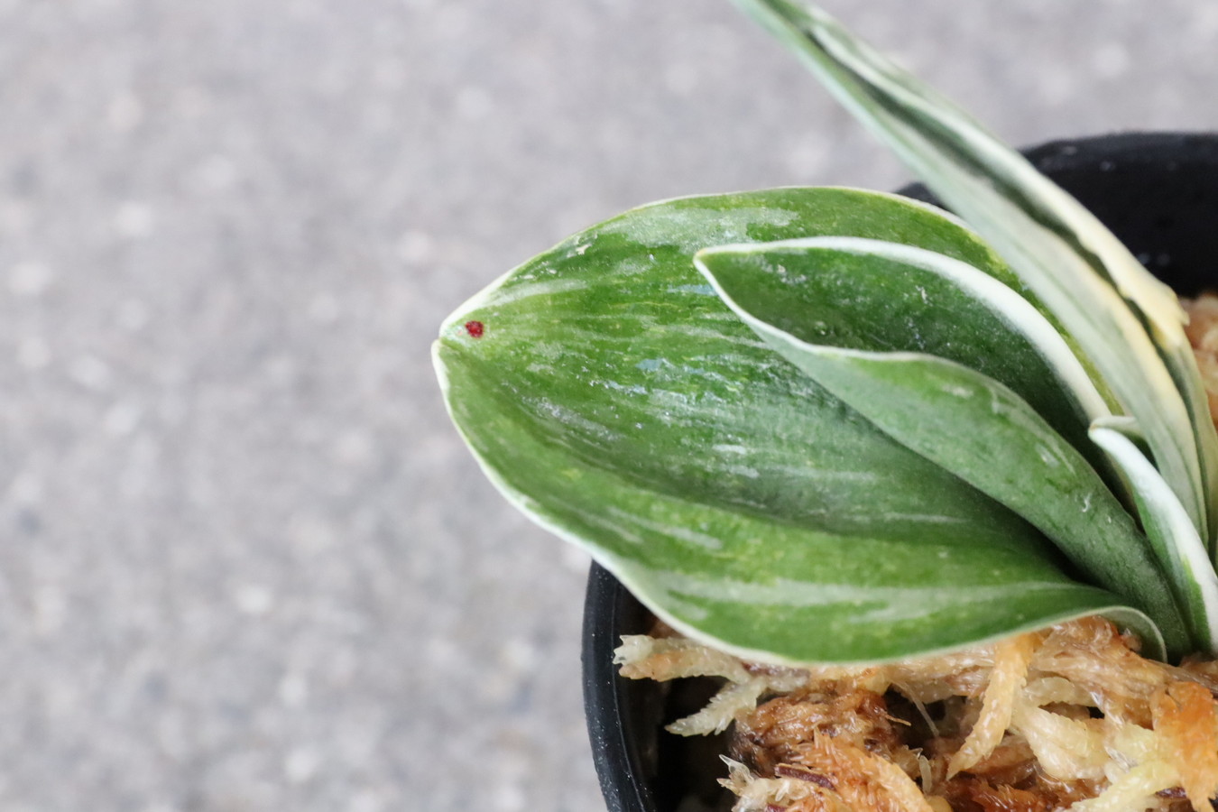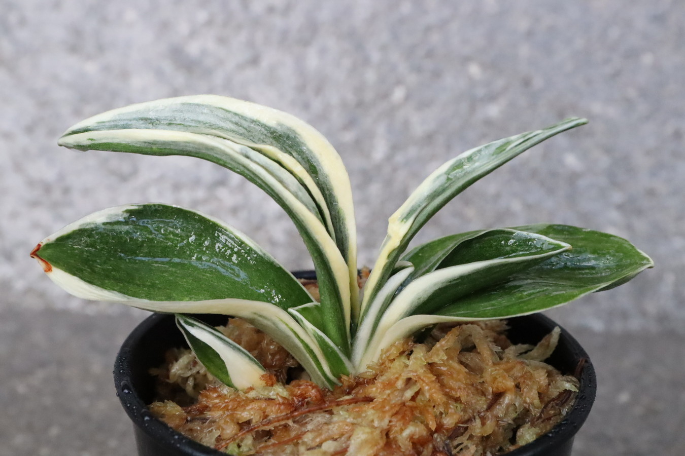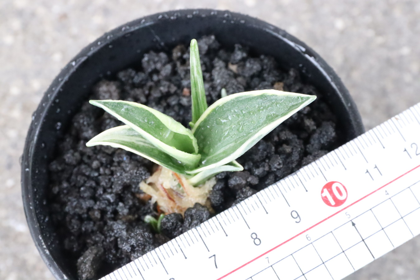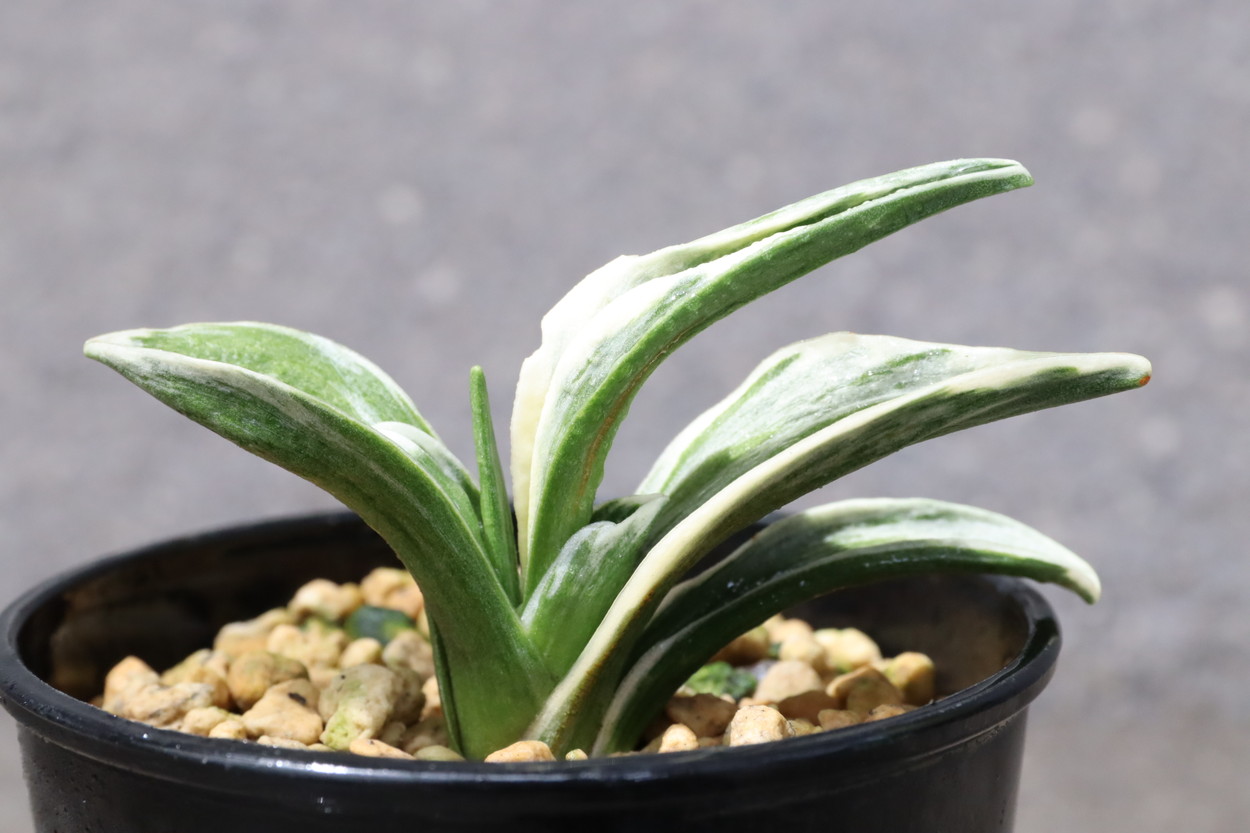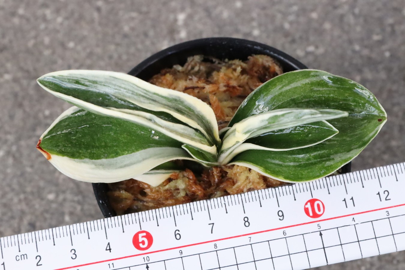 葉長7cm、葉幅3㎝内外の中型種。腰折れが低く、平葉型で、熨斗葉、本剣、棒葉、葉面溢れるばかりの総雅糸竜を見せる。濃紺地に純白の鮮明な覆輪をかける。葉面を純白な糊に覆われた姿は魅力的である。少し芋が柔らかいので、肥料は少なめが良い。子出し良く、繁殖は良い。