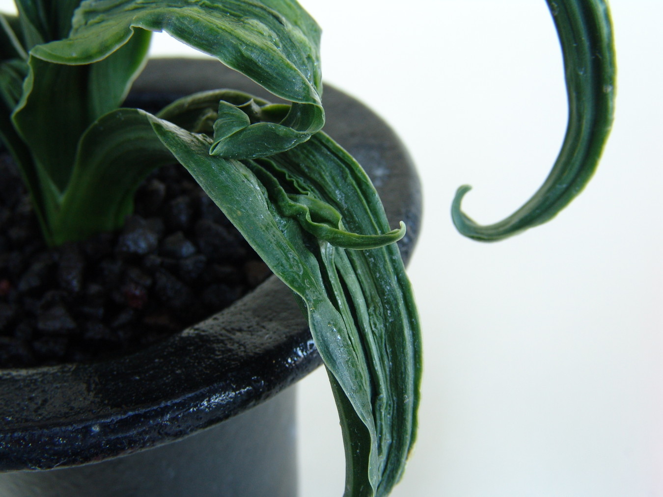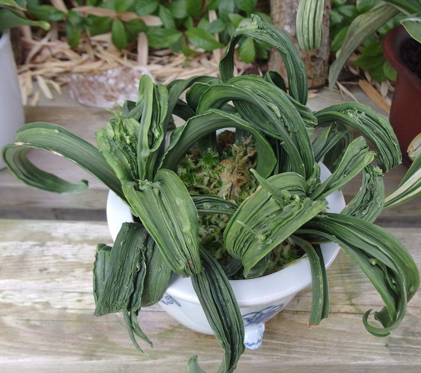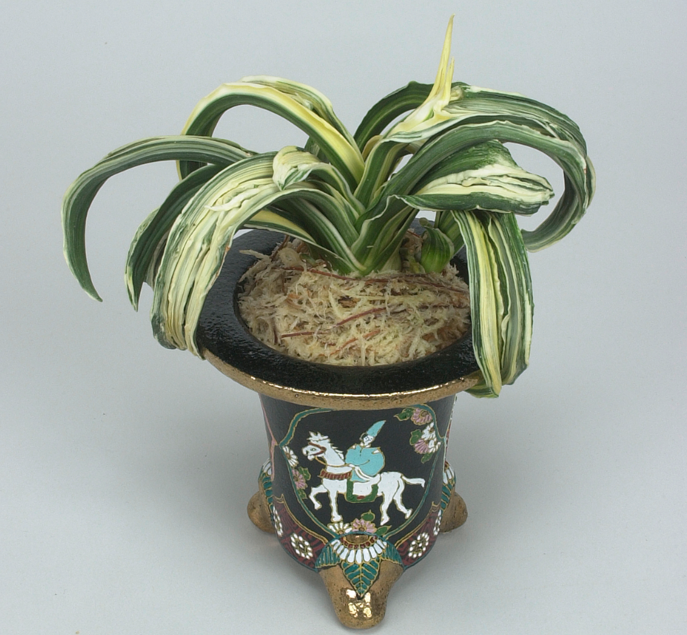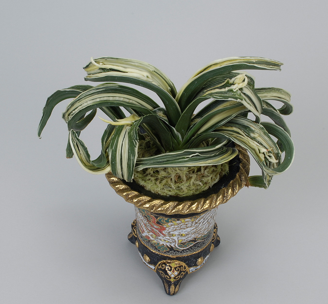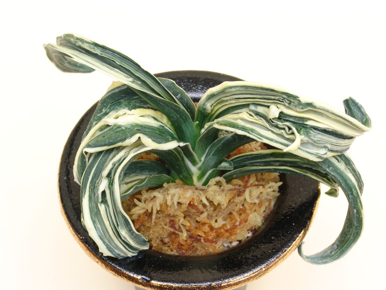 おもとの中でもこれほど激しい玉雅糸竜・跳竜を見せる品種は少ない。獅子系統の中では一度は作ってみたい品種。子上良く丈夫です。又実親として芸を移す雄木に使用しても面白い。