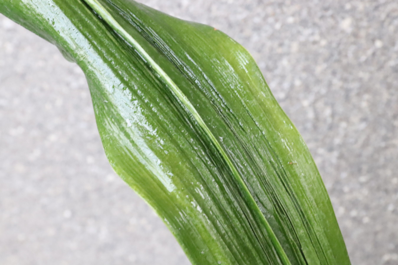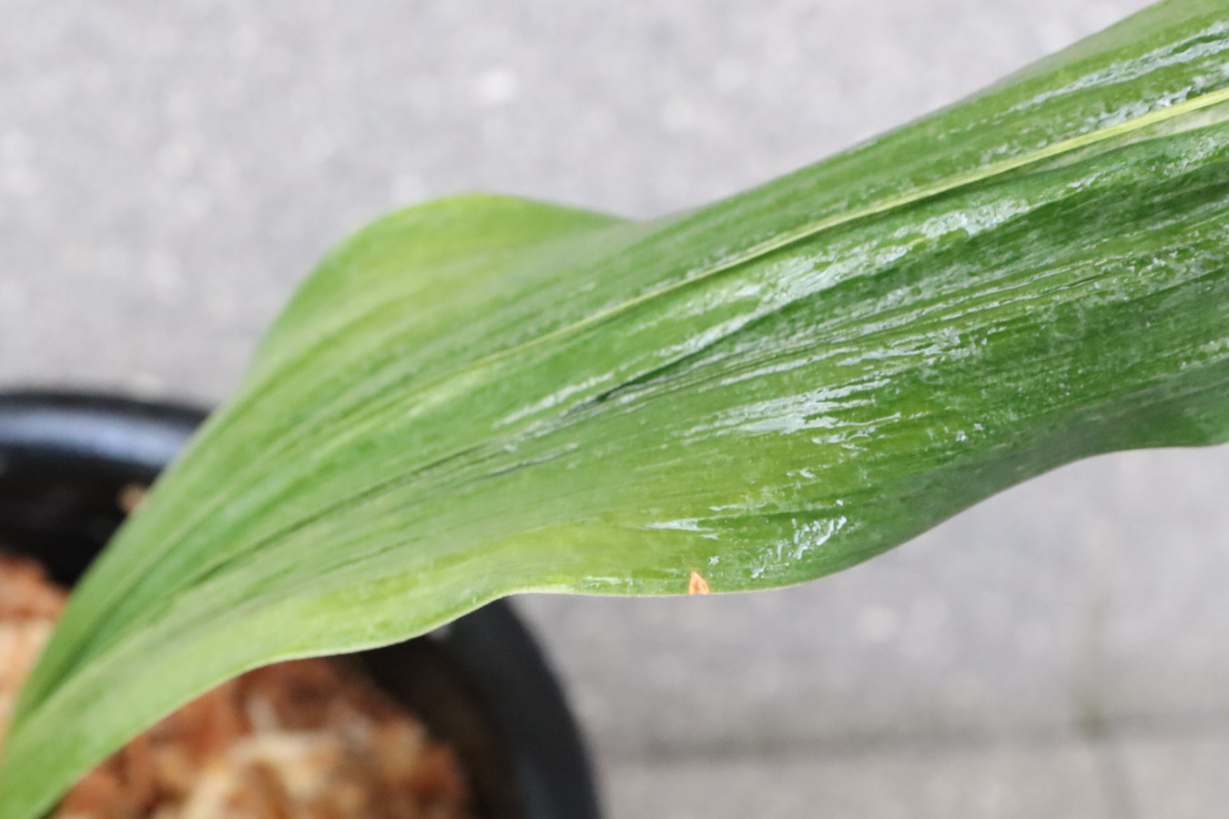 万年青は一つ殖えるのに5年とも10年ともいわれる、寿命の非常に長い植物です。一つ一つの苗でも1-3年ほどかけて育て上げています。その間には台風、猛暑、寒さ、自然の虫など様々な障害をへて育っていくので、完全に無傷の万年青はありません。人以上の寿命のある万年青。風邪を一度も引いたことがない、かすり傷も一度もない人がいないように、ちょっとした傷もある意味、懸命に生きている証。そんな風に考えていただけると有難いです。