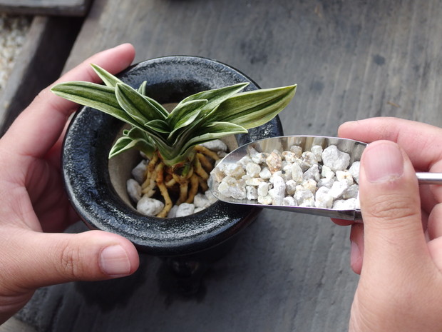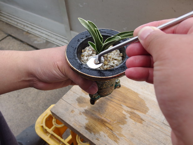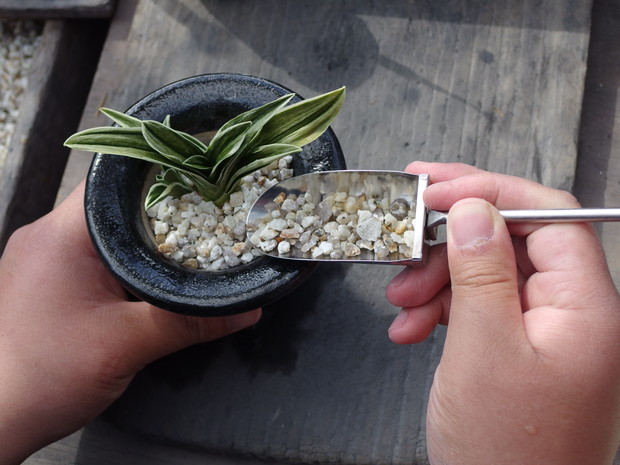 おもとを植える際砂利を狙った位置に流し込む際に使用。さじ。