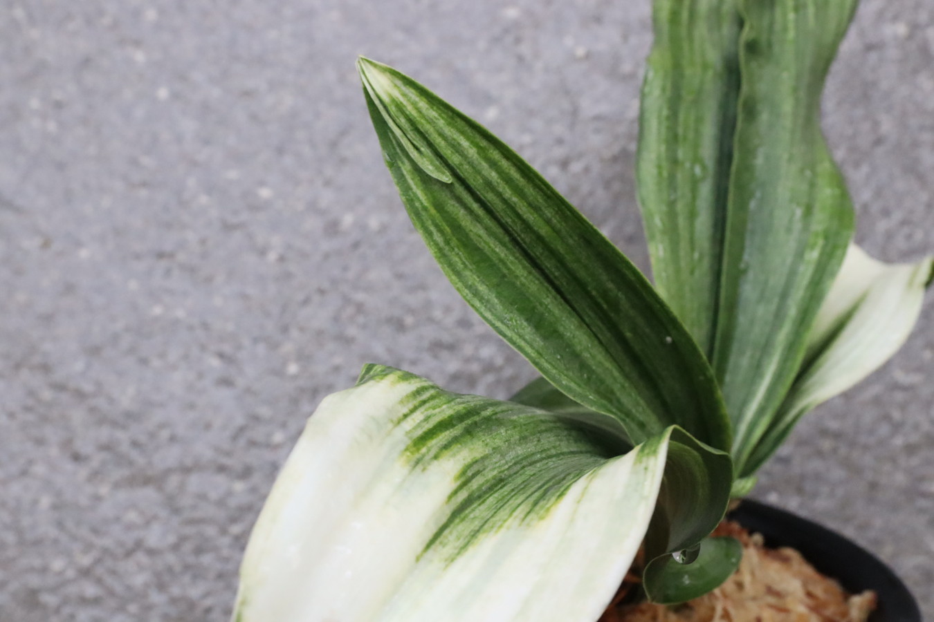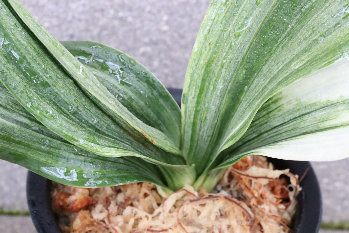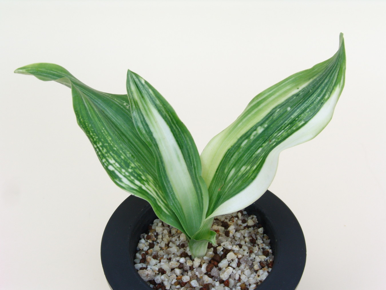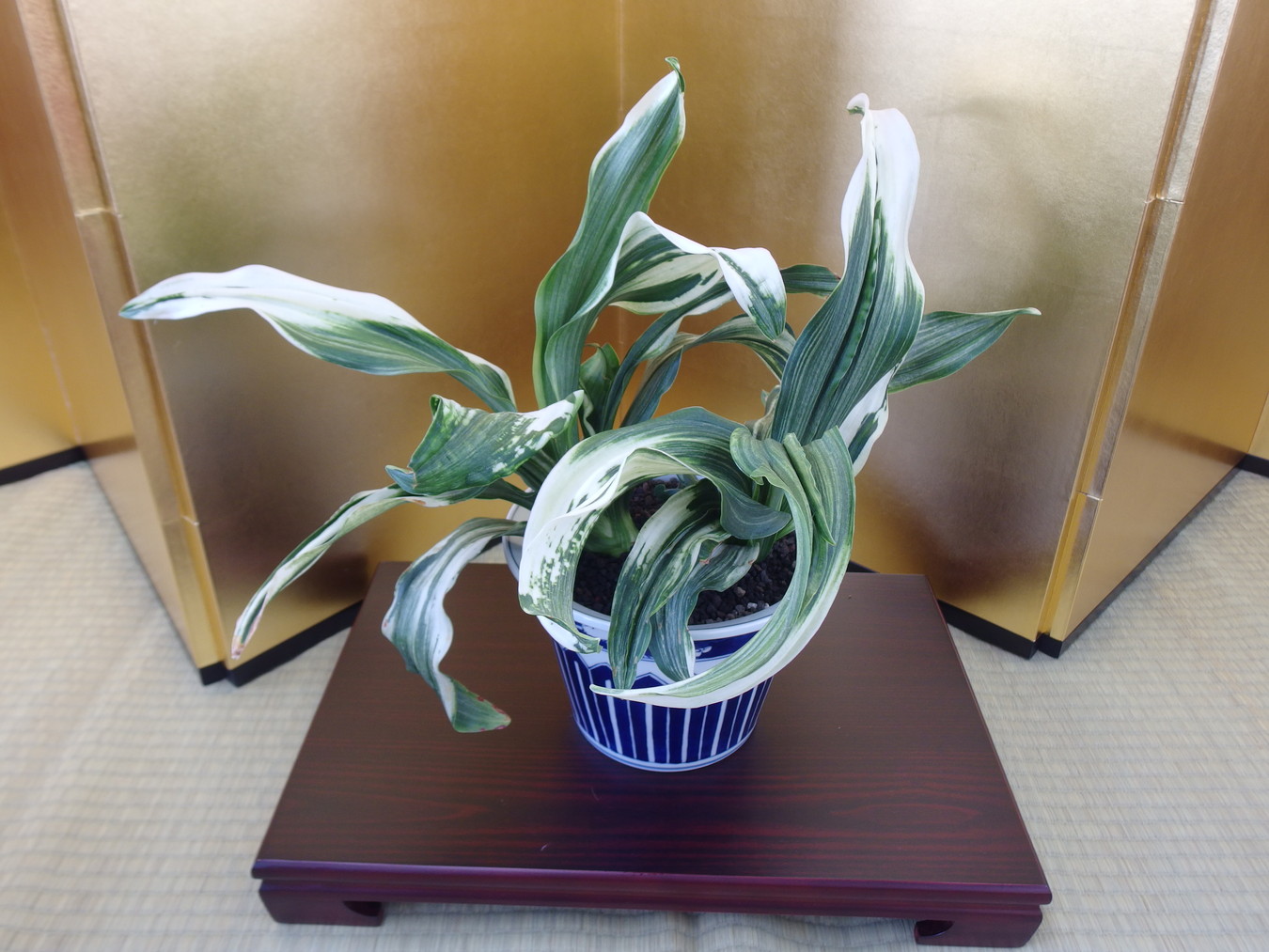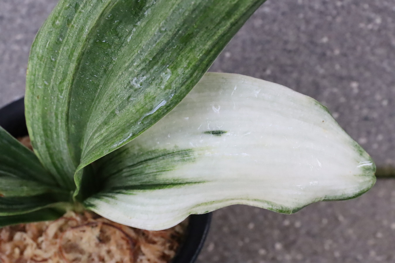 ふっくらした白斑葉は虎班を見せ肉厚で紺覆輪を現わす。