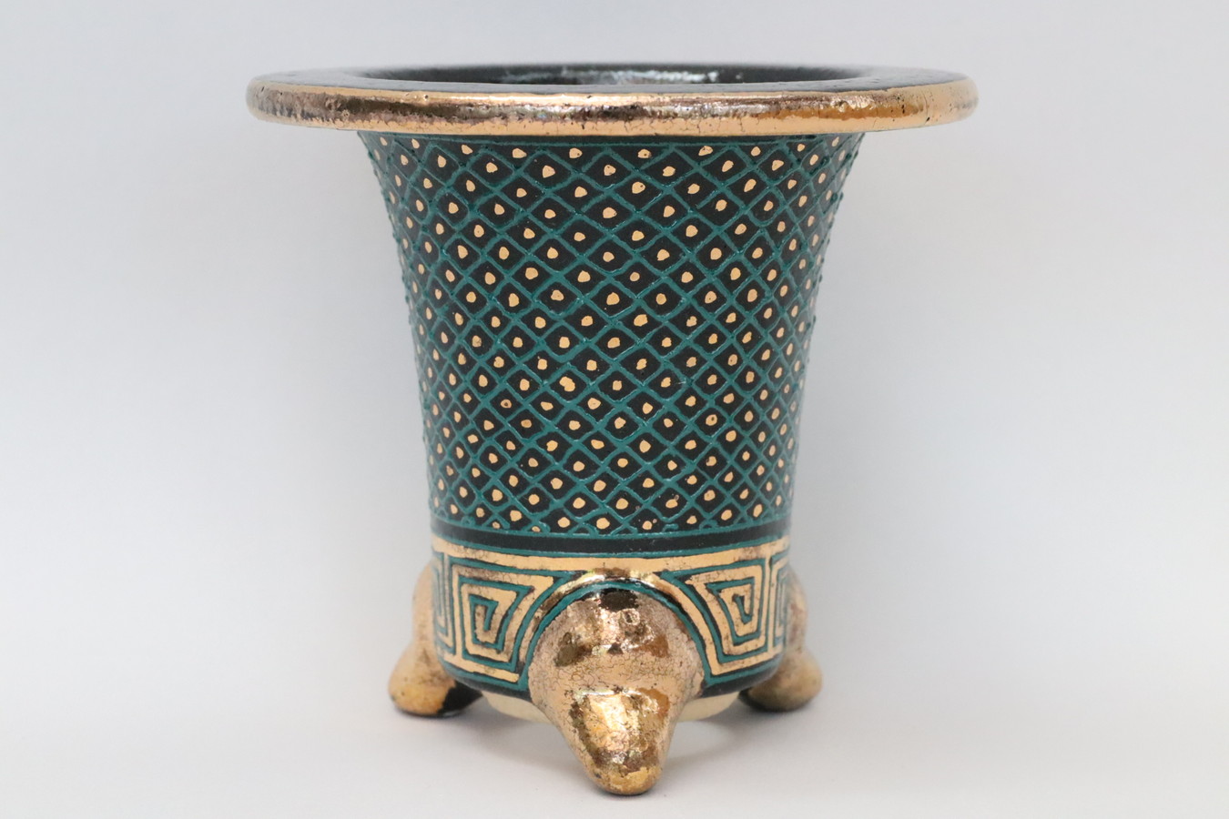 2358,古代鉢 七宝唐草 おもと樂鉢 外径約10.6cm 高さ約10.9cm 縁浅胴太珍鉢