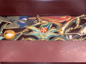 手前の彫り物や(賽銭箱の真上の彫り物の裏)本殿を囲う塀の彫り物(本殿を拝んで右手側の塀)でも見られます。