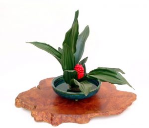 室町時代の書物に記され祝儀の花とされてきました。生け花のほかの流派でも正月などの祝い事にはおもとをいけるようです。各流派のいける形を先生に質問してみると一枚ずつの葉に役割や意味合いや心意気がこめられており興味深いです。