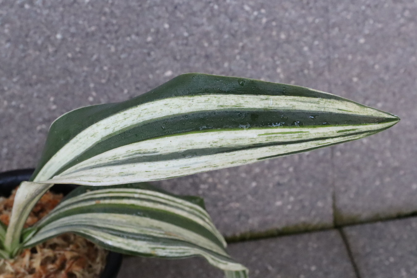 美しい白い斑に濃緑色の縦縞を見せます