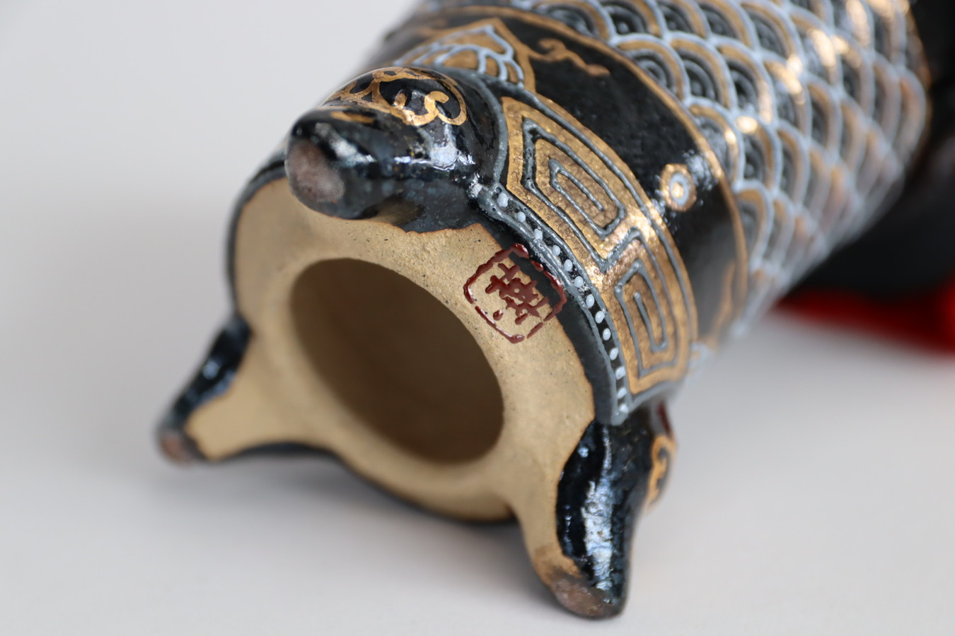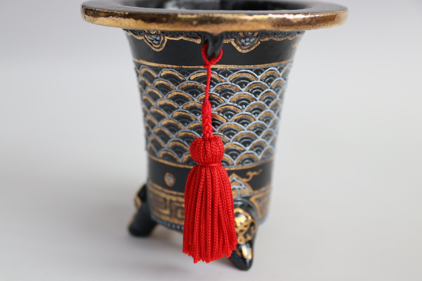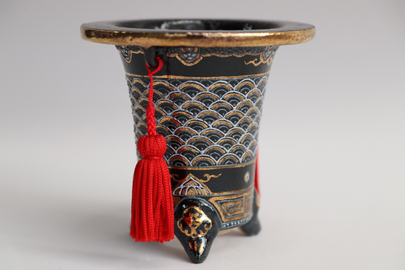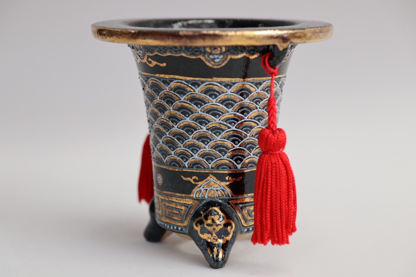 古くから使われるおもと錦鉢の柄。もとは、小さな輪の文様の集まりが、魚の卵を連想させる事から、「七子」「魚子」「斜子」などの字があてられている。古くからある柄のようで、延宝六年(一六七八)の加賀藩の工芸標本『百工比照』の中に、「ななこ」の名称が見られる。また小浜藩の藩医が延宝年間に記した書物にも「魚子塗」の言葉が見える。鉢の柄は渋く、おもとを引き立てる、ということで古くから愛され、使われてきた。単純な柄ゆえ、その作家さんの技量もでて、素晴らしい物は古いものはもちろん、新しい物も価値が高い。格子の中の点である、金の絵具は、絵付けの時は黒く、地の鉢も黒鉢で、必ずといっていいほど目残しがある。手間も非常にかかる鉢でもある。