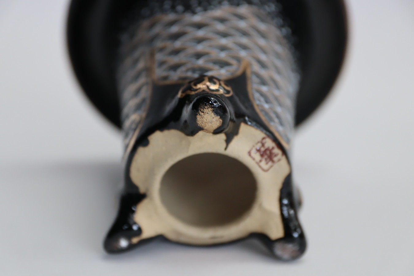なぜ布施先生がサインをするようになったかというと、鉢を分けていた、信じていた業者がある人に布施先生の鉢を売り、その方が古く時代をつけて古鉢として法外な値段で売っていたから。古く時代をつけるのは、鉢を畑や水田の泥の中に沈めて置くと鉢が汚れて、新品の鉢が30年、50年、100年前の鉢にみえるようになります。ただの作家の鉢ではただ古く時代を付けただけでは古鉢にはみえませんが、そこは布施先生の鉢。まず見分けができないほど、布施先生の鉢の出来がよかったんですね。