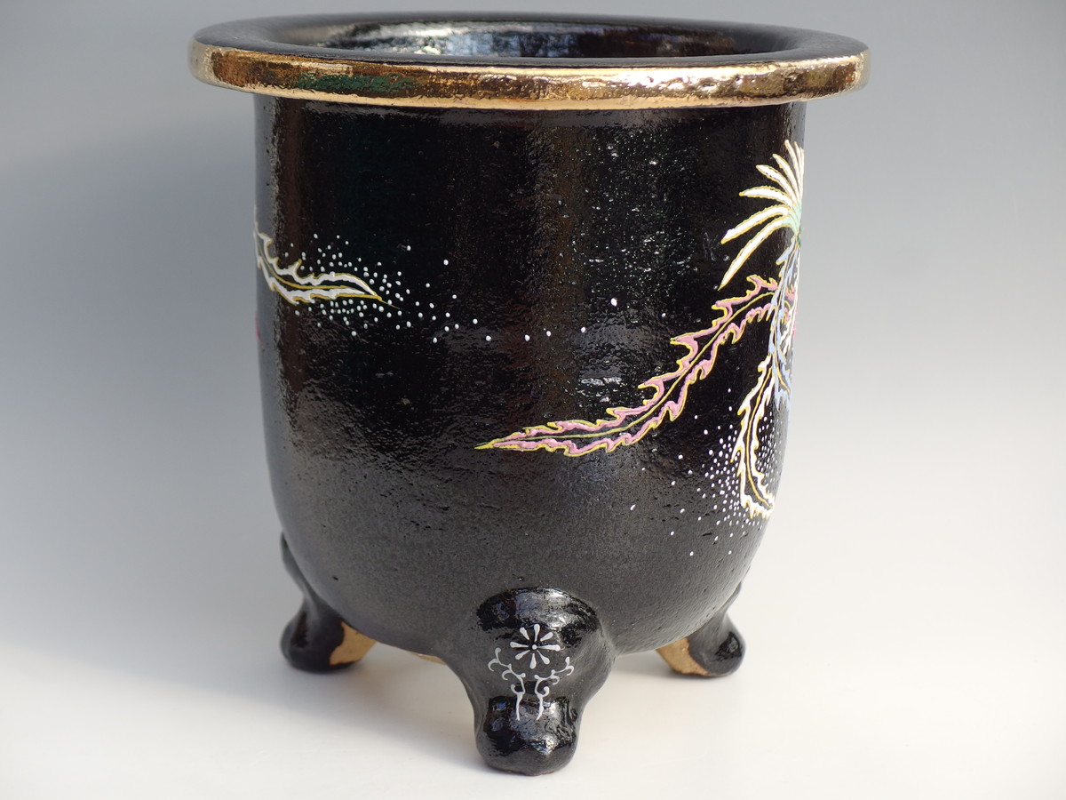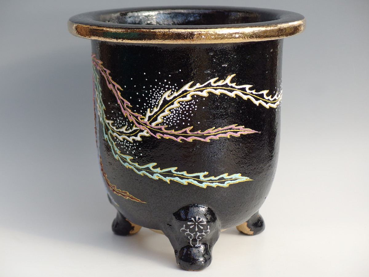 京楽鉢 愛楽園製 楽焼は天正年間(約400年前)に始まる日本独特の焼き物です。 楽焼は《急熱急冷》という特殊な焼成方法をとります。 急熱急冷だから、鉢に細かな 微細な穴ができ、通気を良くしています。
