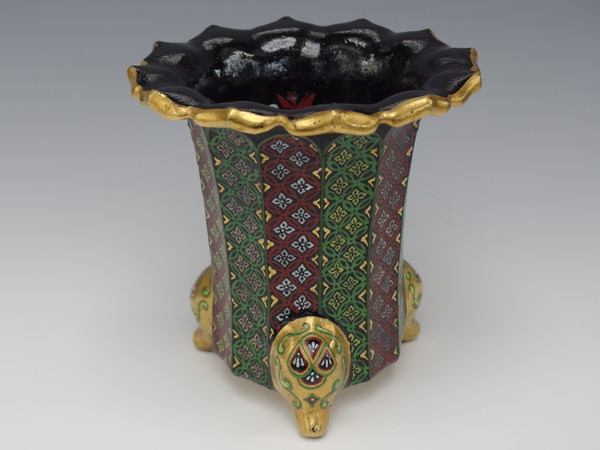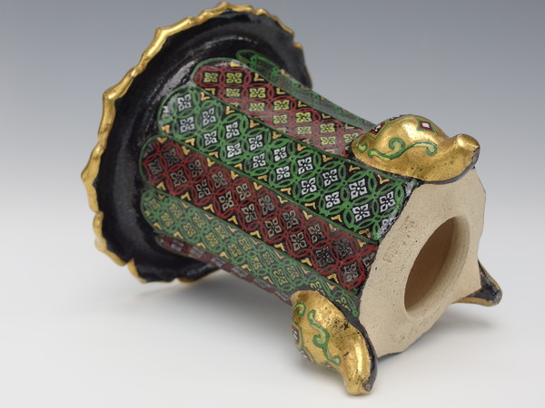 菱縁小紋12面絵鉢 外形 約13.8cm絵付け師 短冊家 一点物短冊家手作り 短冊家の落款楽焼は天正年間(約400年前)に始まる日本独特の焼き物です。楽焼は《急熱急冷》という特殊な焼成方法をとります。急熱急冷だから、鉢に細かな 微細な穴ができ、通気を良くしています楽焼製造工程 楽焼足付け工程加茂黑の艷 京都祇園短冊家