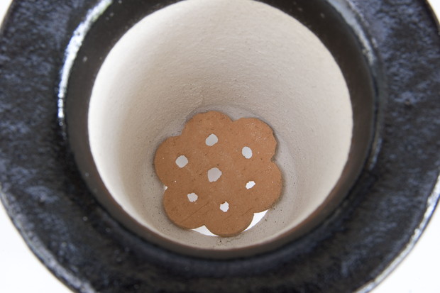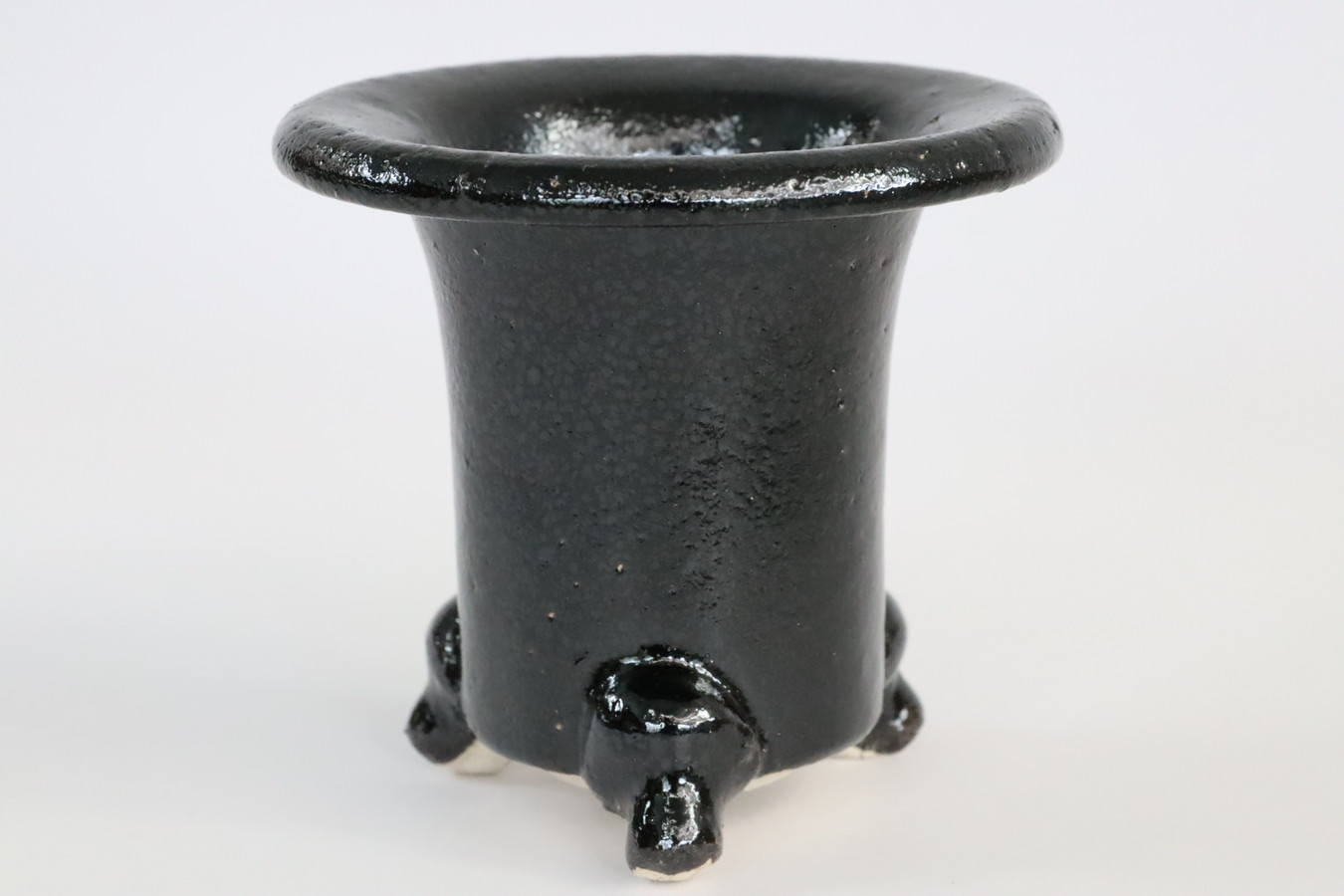 3つ足ふち有りの伝統的な形・製法の黒鉢。楽焼や京楽焼とも呼ばれる。