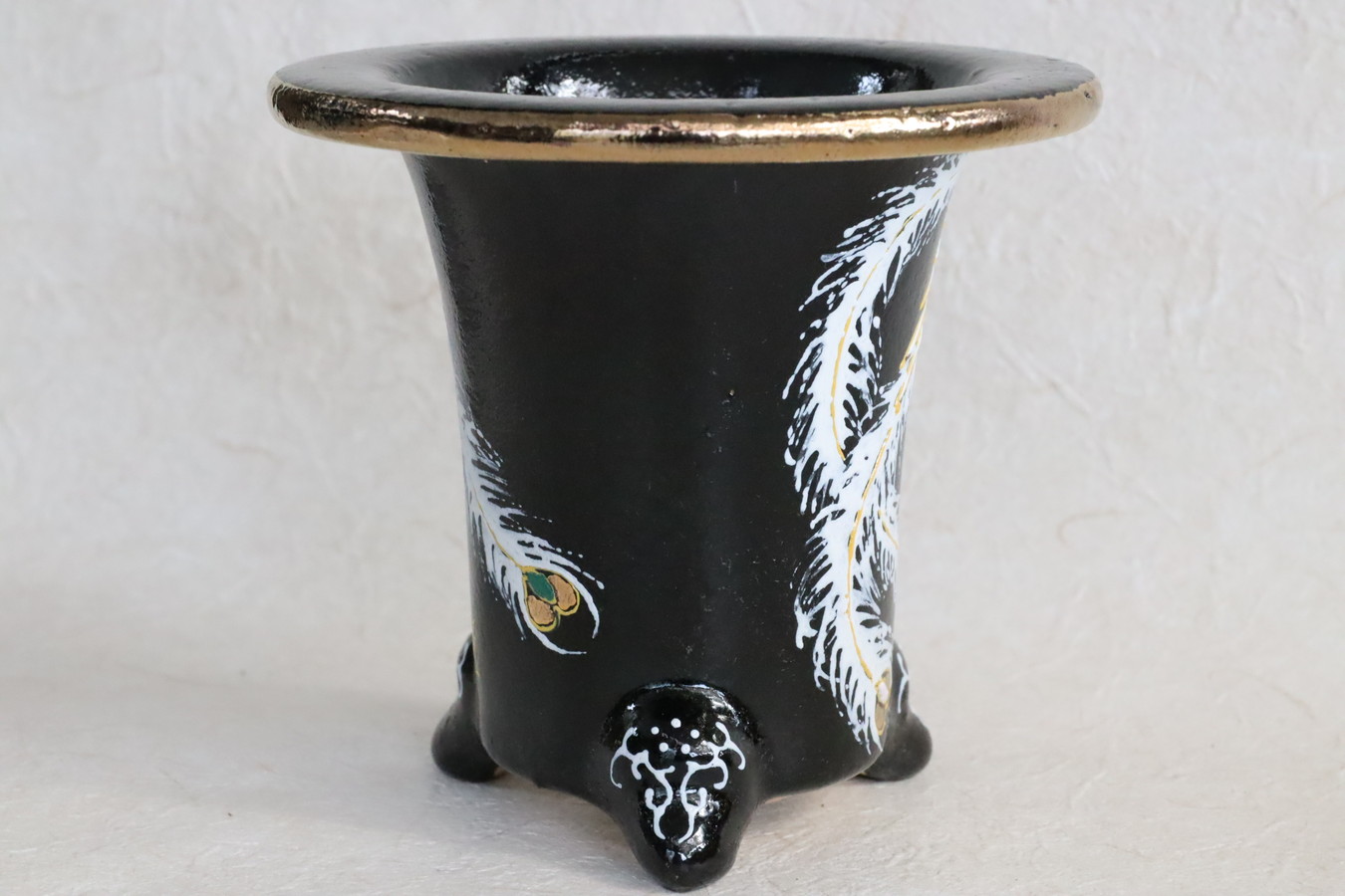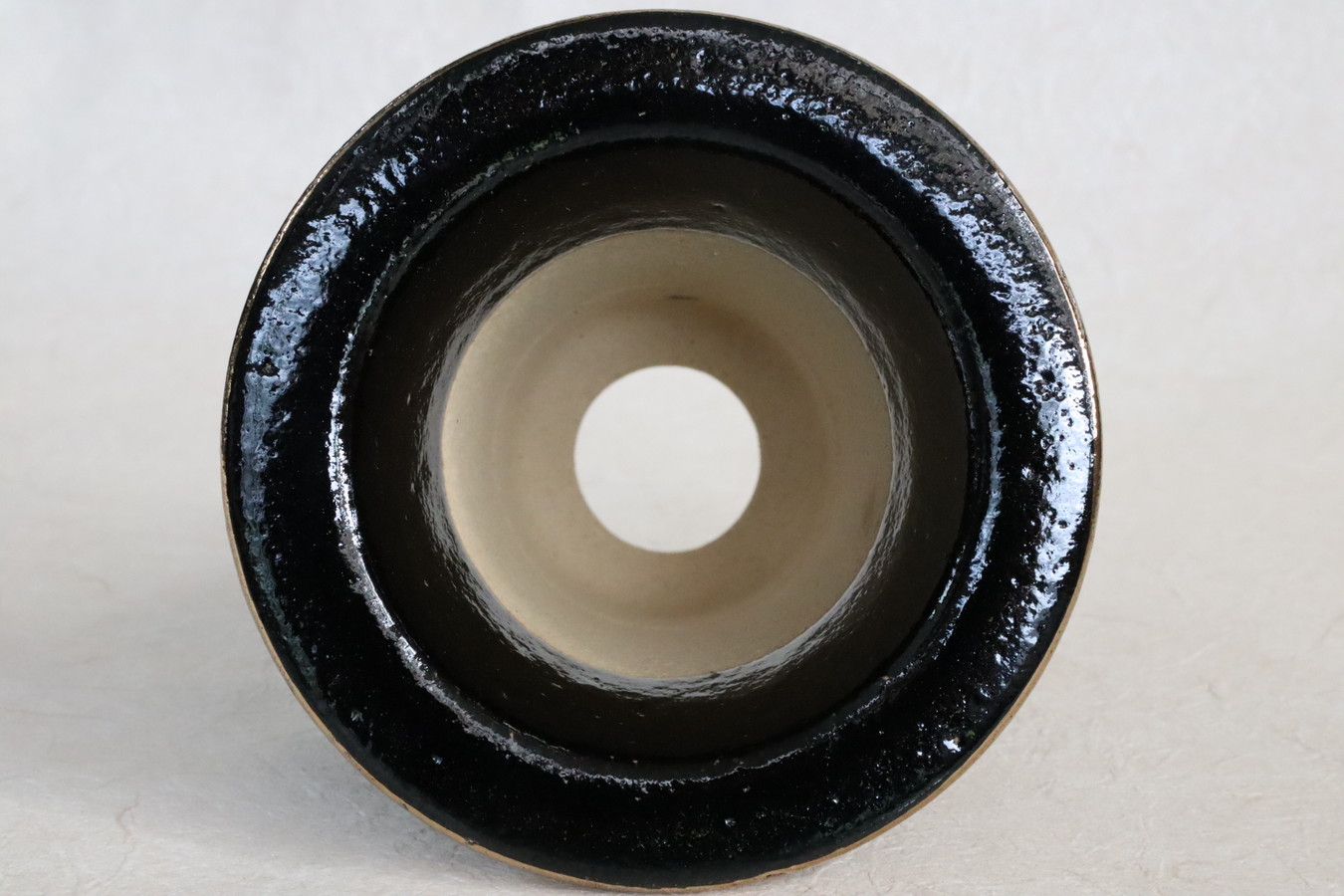 2024.7.8 現代最高峰の絵付け師 亘 一点物おもと鉢 万年青鉢 オモト鉢楽焼は天正年間(約400年前)に始まる日本独特の焼き物です。楽焼は《急熱急冷》という特殊な焼成方法をとります。急熱急冷だから、鉢に細かな 微細な穴ができ、通気を良くしています。万年青鉢 龍山後藤龍山 絵付師