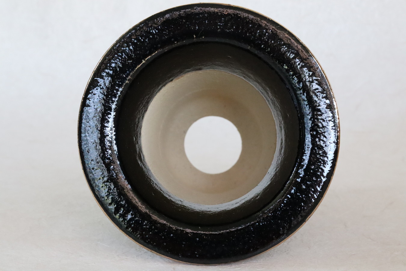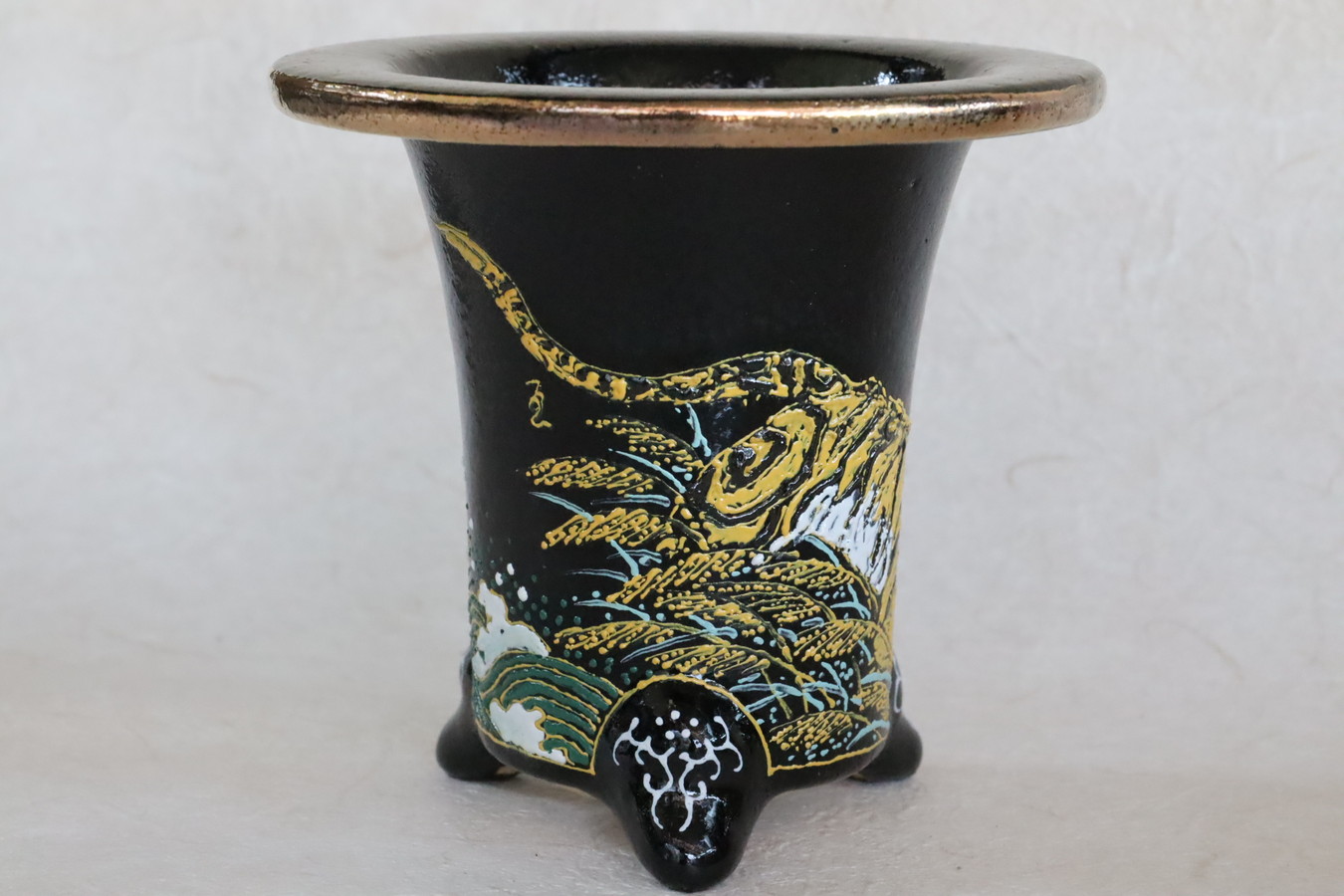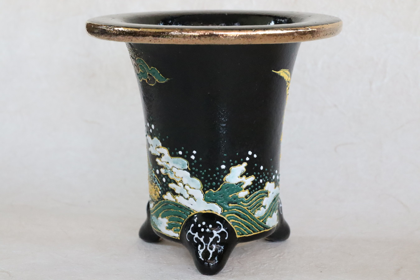 2024.7.8 希少性高い 一点物おもと鉢 万年青鉢 オモト鉢楽焼は天正年間(約400年前)に始まる日本独特の焼き物です。楽焼は《急熱急冷》という特殊な焼成方法をとります。急熱急冷だから、鉢に細かな 微細な穴ができ、通気を良くしています。万年青鉢 龍山後藤龍山 絵付師