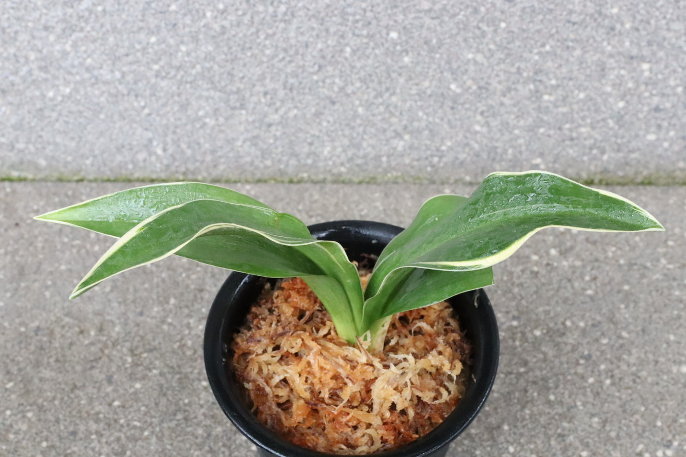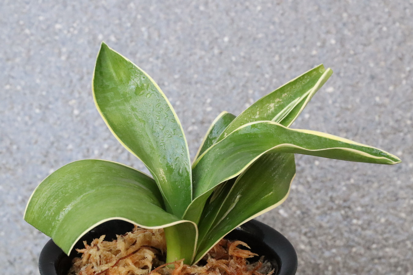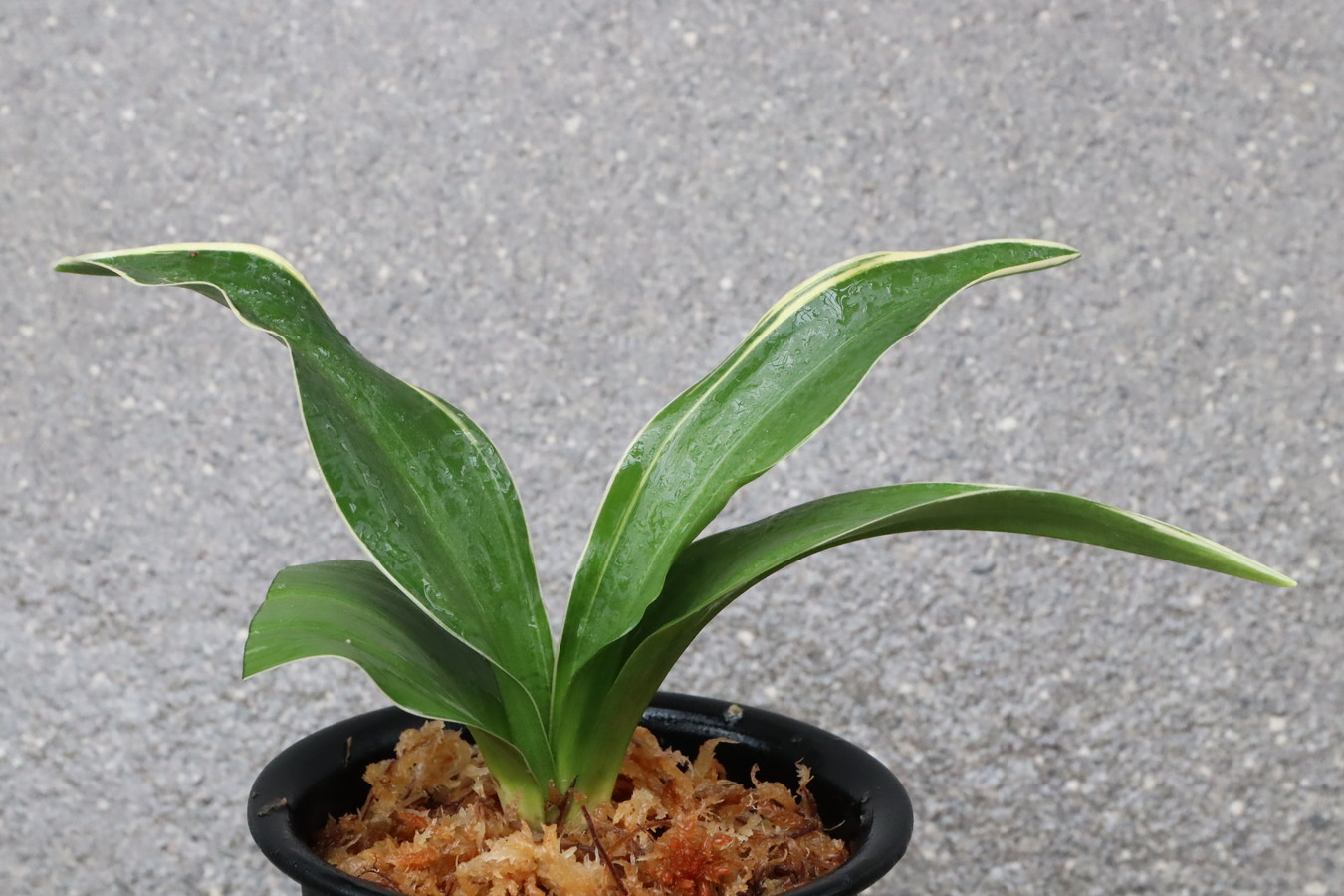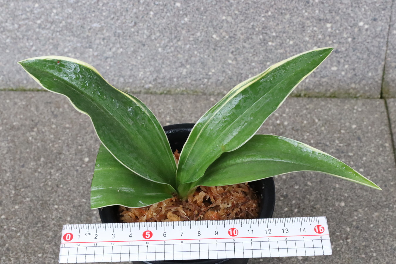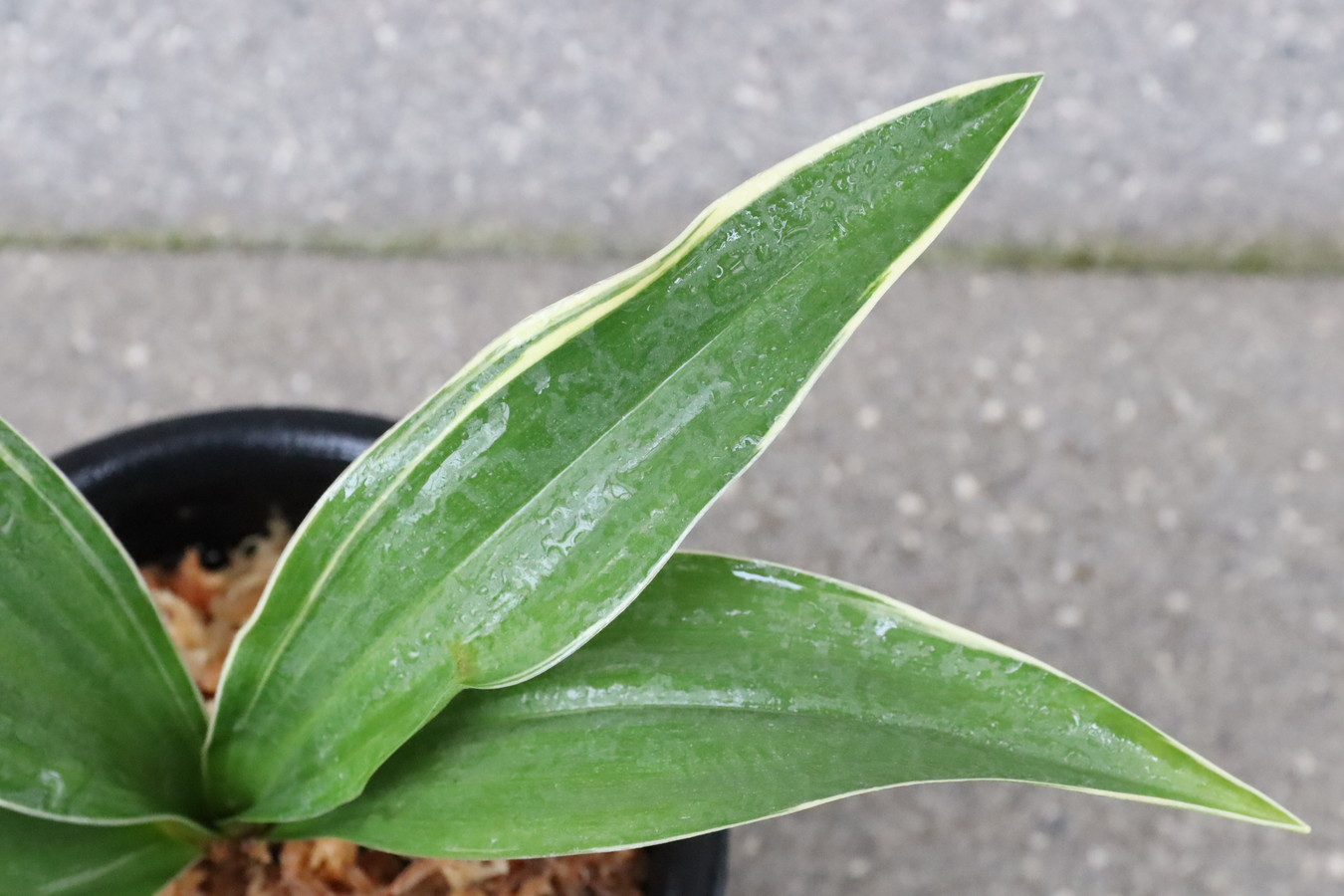 葉巾広い濃緑色葉に黄白色の深覆輪を見せます。