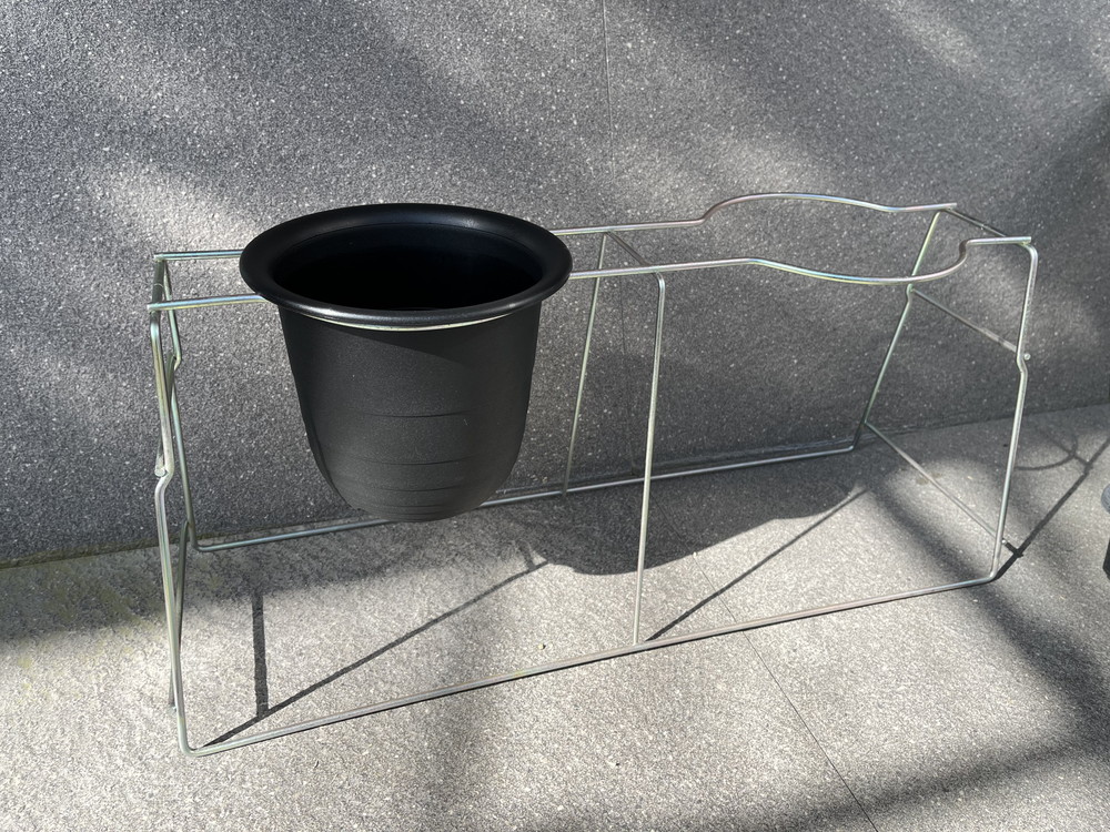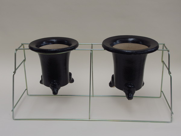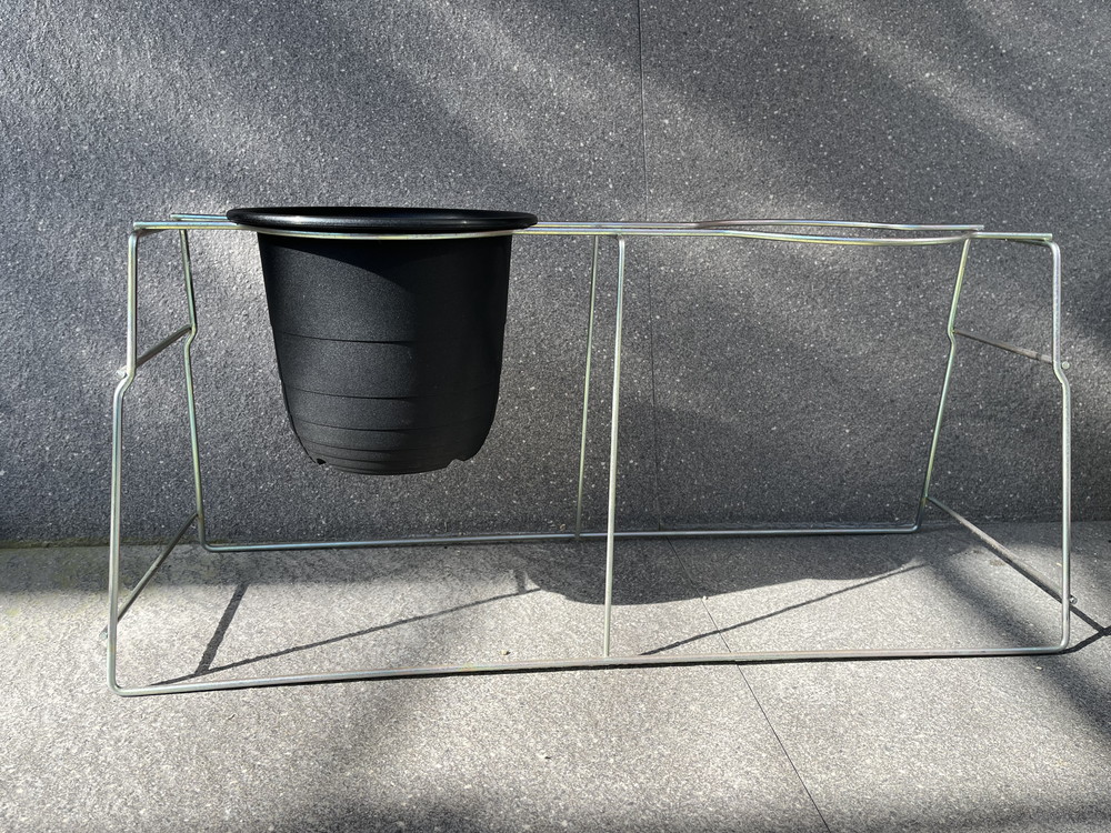 素材は鉄製でクロームメッキ仕上。 おもと・ラン鉢6.5号7号用おもと用に比べて高さがあります。2個掛け、在庫限りの売り切りです。 写真のオモト鉢では底面より少し高めの位置で保持されるようです。(鉢は付きません) 高さ×幅×奥行 28×63×20