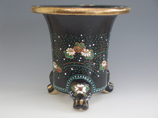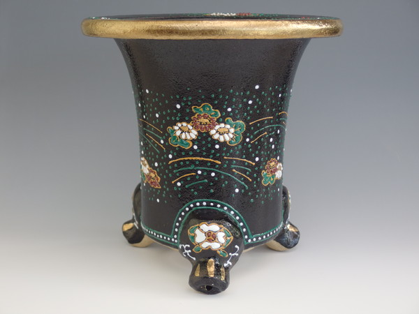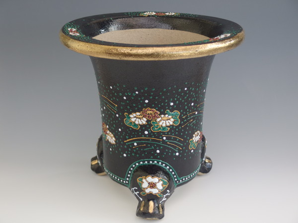 大鉢 縁飾り流れ小菊 一点物 楽焼は天正年間(約400年前)に始まる日本独特の焼き物です。 楽焼は《急熱急冷》という特殊な焼成方法をとります。 急熱急冷だから、鉢に細かな 微細な穴ができ、通気を良くしています。 おもと鉢 作り方 楽焼黒鉢の製造工程