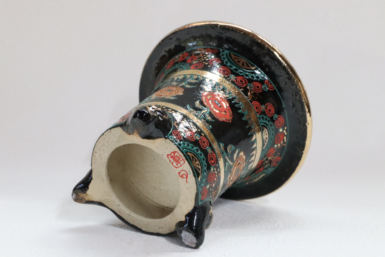 2662,金〆五龍華 賀茂黒楽鉢 外径約10.2cm 高さ約9.3cm華サイン 加茂黒 独特な鉢の形